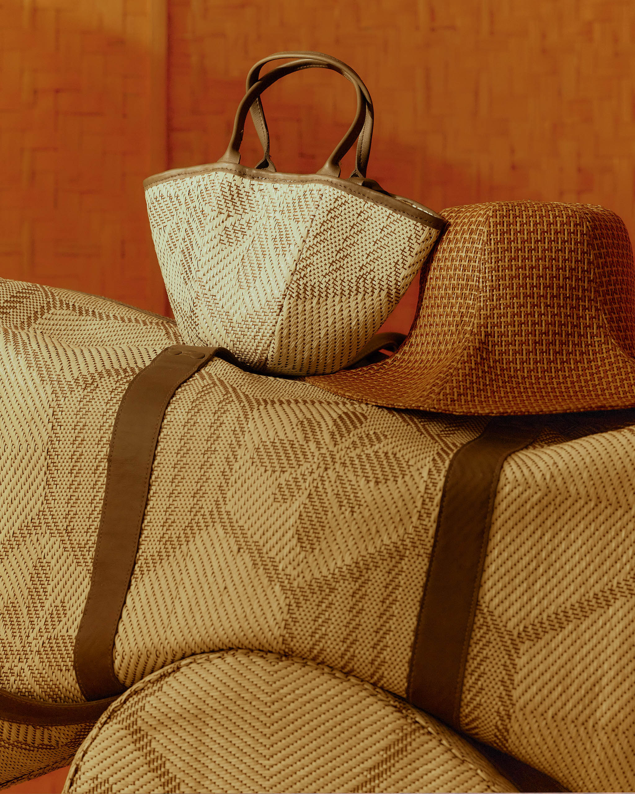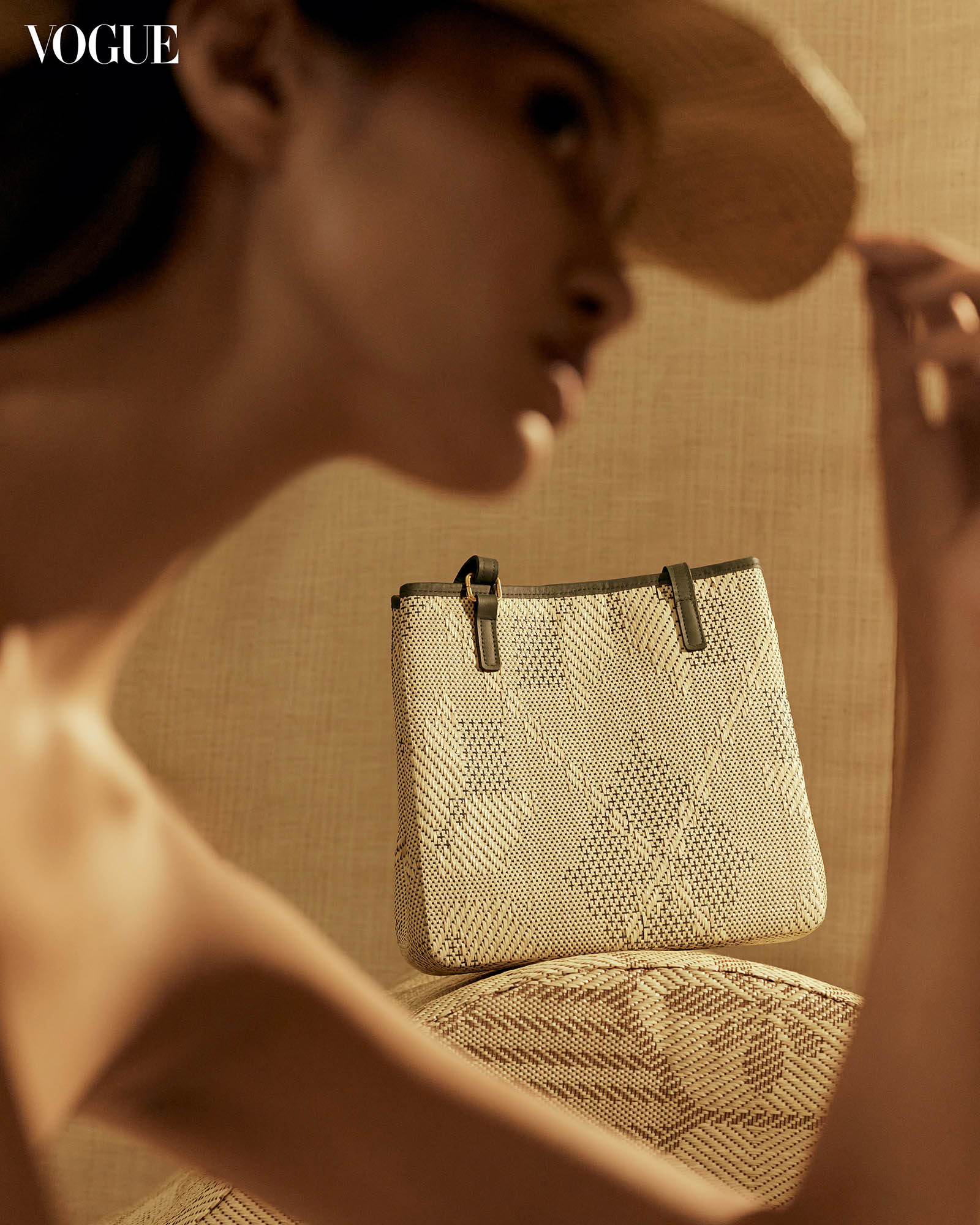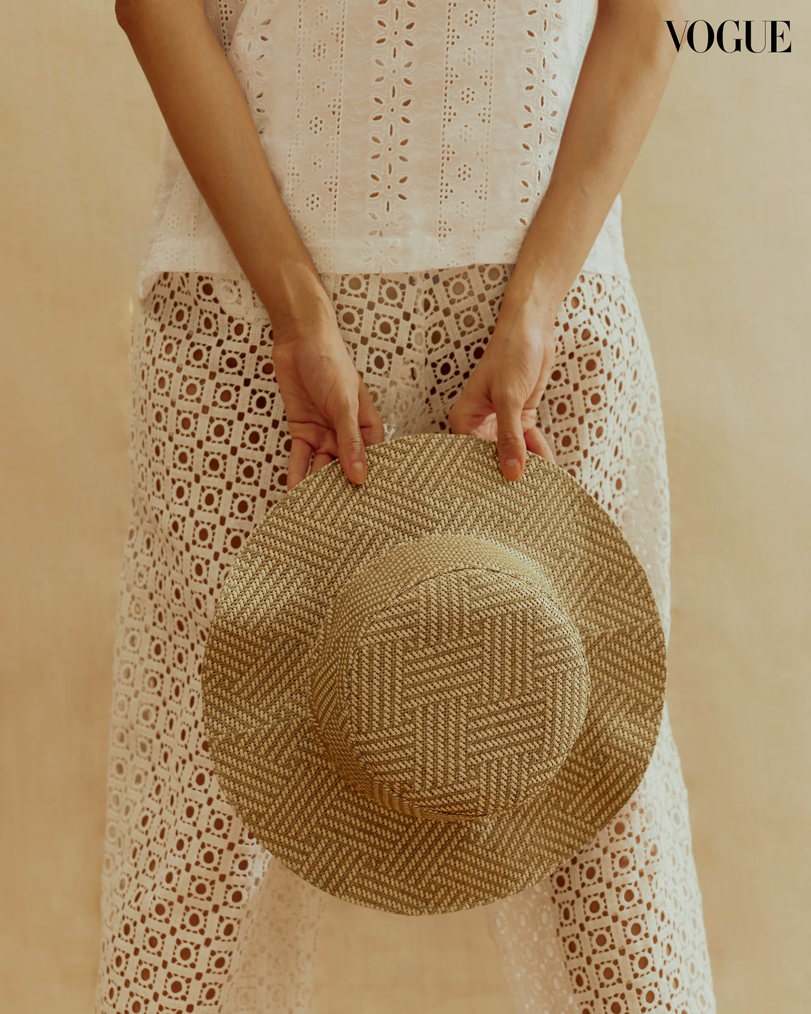 Tiny basket bag in brown and Mushroom hat in tan. Photographed by JV Rabano.