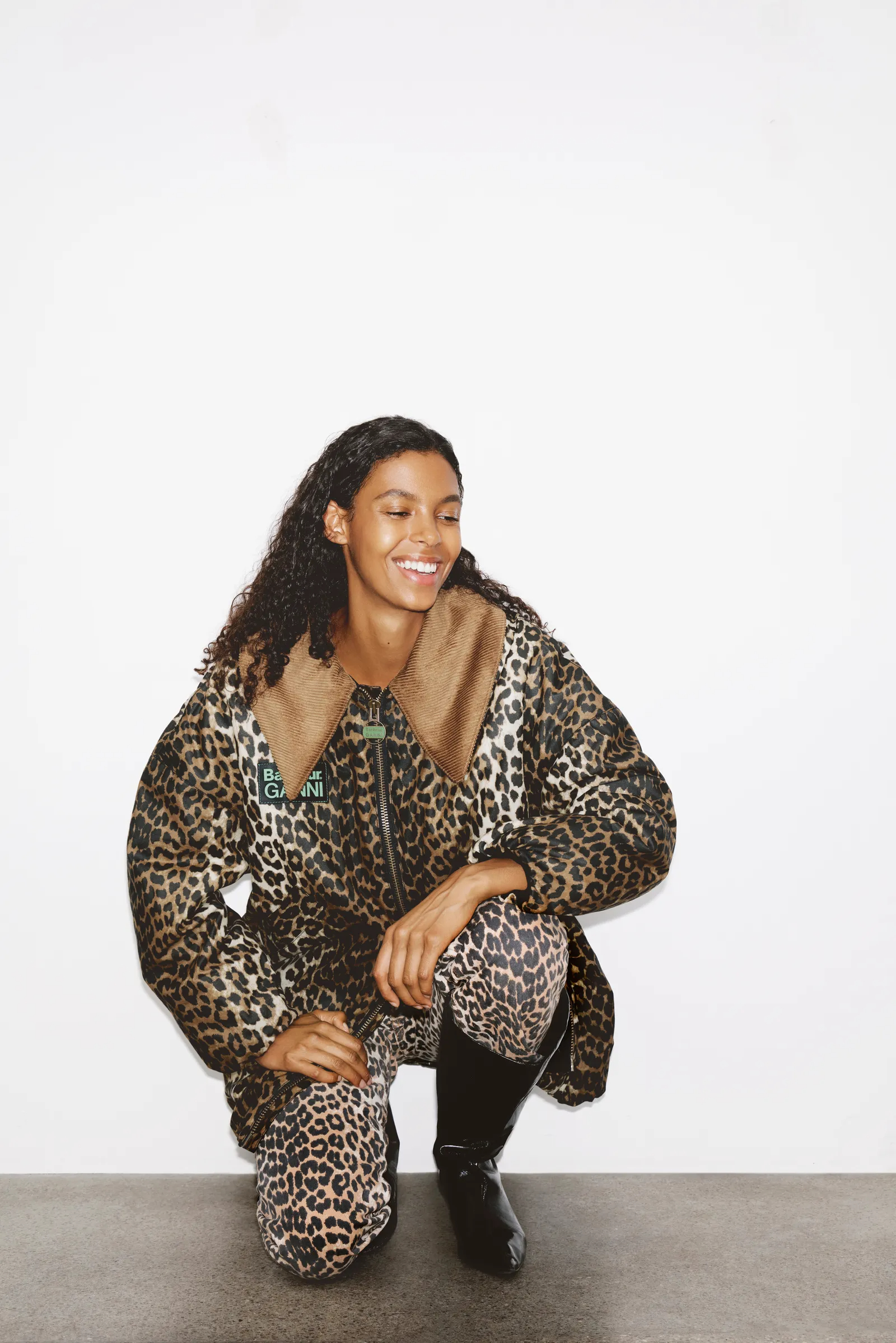 Ganni fans will be pleased to see the Scandi brand’s trademark leopard print emblazoned across an oversized bomber jacket and bucket hat. “A moment of excitement,” is how Ditte puts it.
