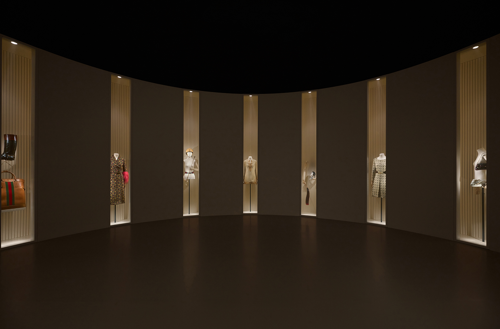 “Carousel” features a rotation of 32 mannequins wearing some of the House’s era-defining pieces. There is a silk shirt and skirt adorned with the G cube print from the early 1970s, a silk cady top and pants from Frida Giannini’s Spring-Summer 2013 collection, silk-satin georgette dress from Alessandro Michele’s Fall-Winter 2015 show, and a several of Ford’s velvet creations. This is overlayed by a screen showcasing the works of select Chinese artists running counter to the direction of the catwalk. The works of Victo Ngai, Vikki Zhang, Li Jianmei, and Currynew are collectively assembled, creating a smooth, continuous composition.