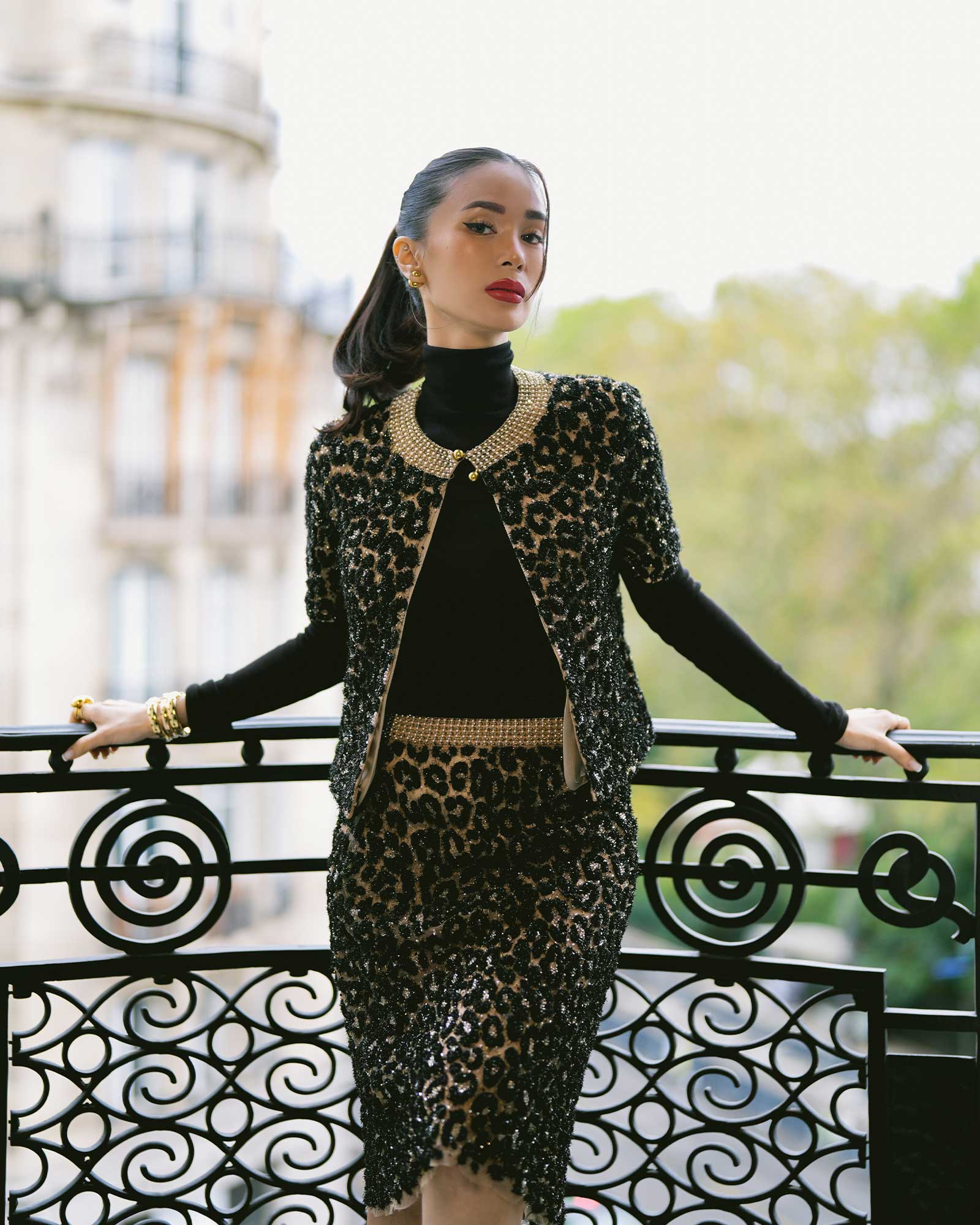 Evangelista channels the strength of a woman’s femininity in her ensemble as well. A modern and glamorous take on a classic silhouette, she wears a matching two-piece textured leopard set, accessorized with gold jewelry. “Today’s inspiration: The Louvre,” she writes in an Instagram post. “Maria Grazia Chiuri reimagines timeless beauty in this season’s collection.”