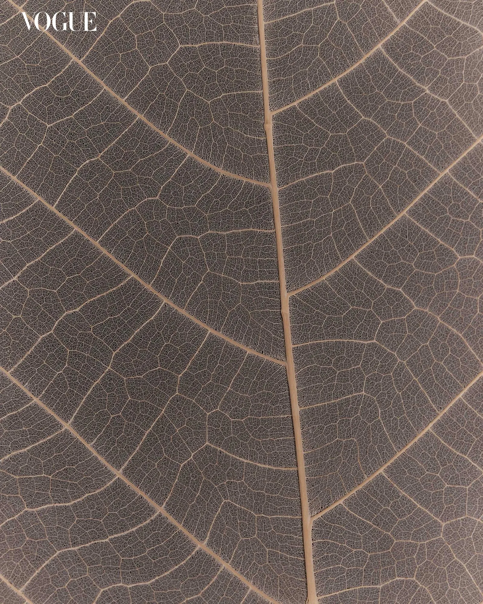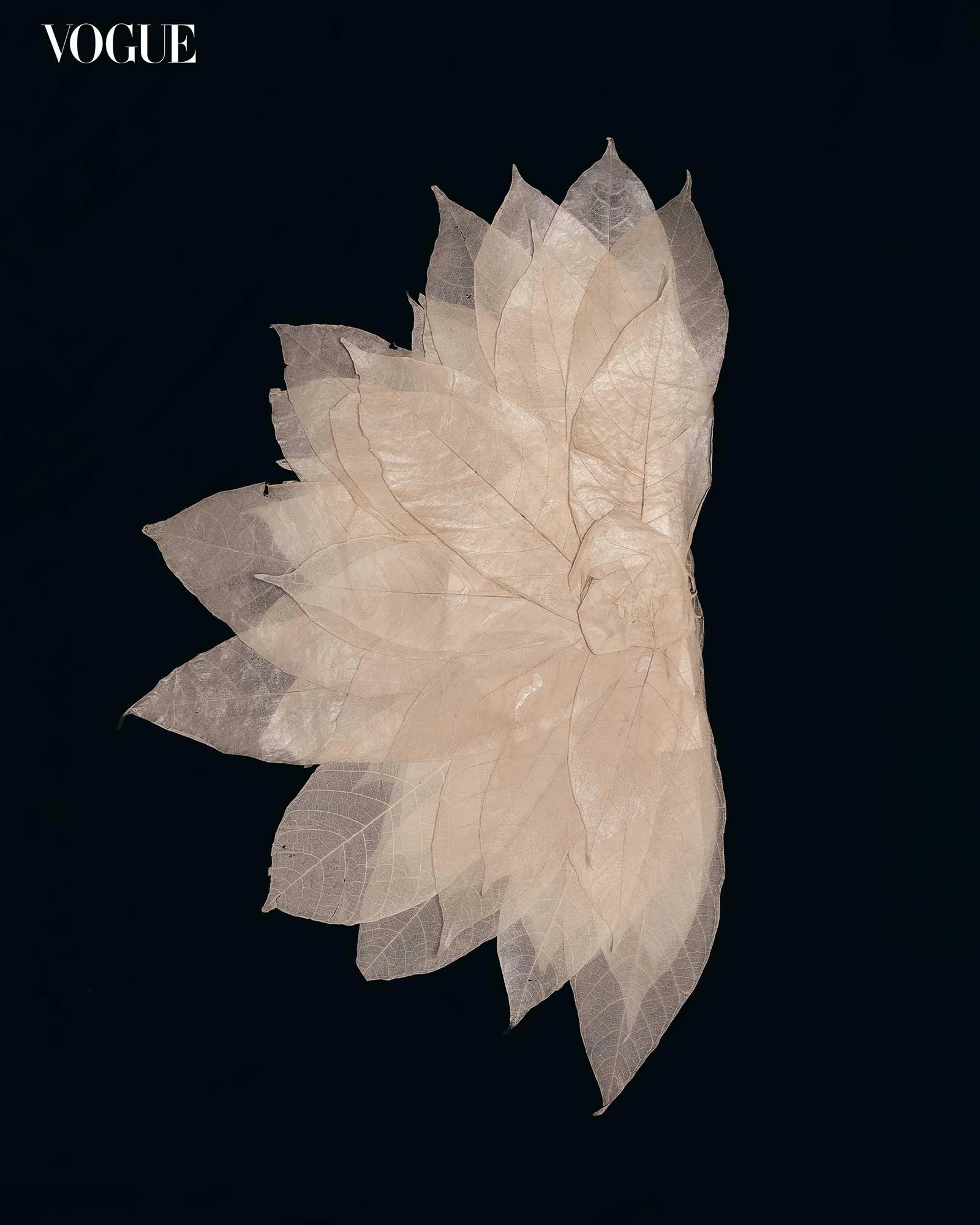 To create fossilized cacao leaves, mature foliage is carefully harvested and chosen for its smooth, unblemished surface. The leaves are then simmered for several hours in a solution of water and lye, a process that strips away pigment and softens the fibers. Each one is brushed gently by hand with a soft-bristled brush until only its delicate veinwork remains. After bleaching, the leaves are hung to dry in a well-ventilated space until they turn almost translucent. Once fully dried, they are dyed in vibrant hues, dried again, and made ready to be transformed into works of art, homeware, or couture. For Slaysian Royale, 9,000 fossilized cacao leaves were produced.