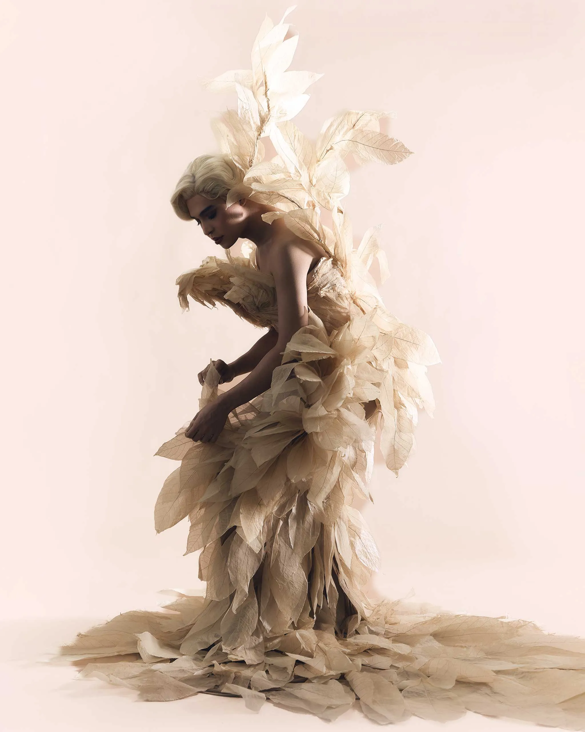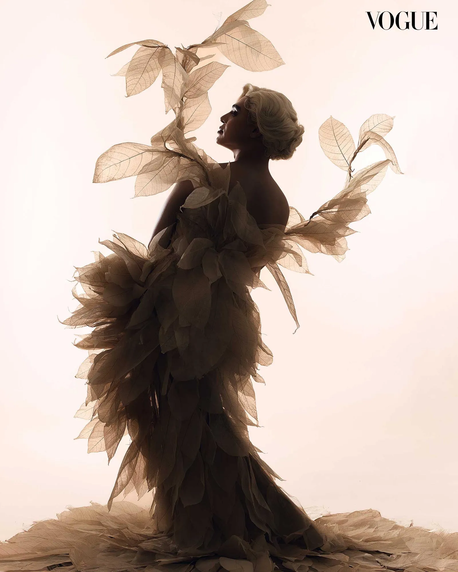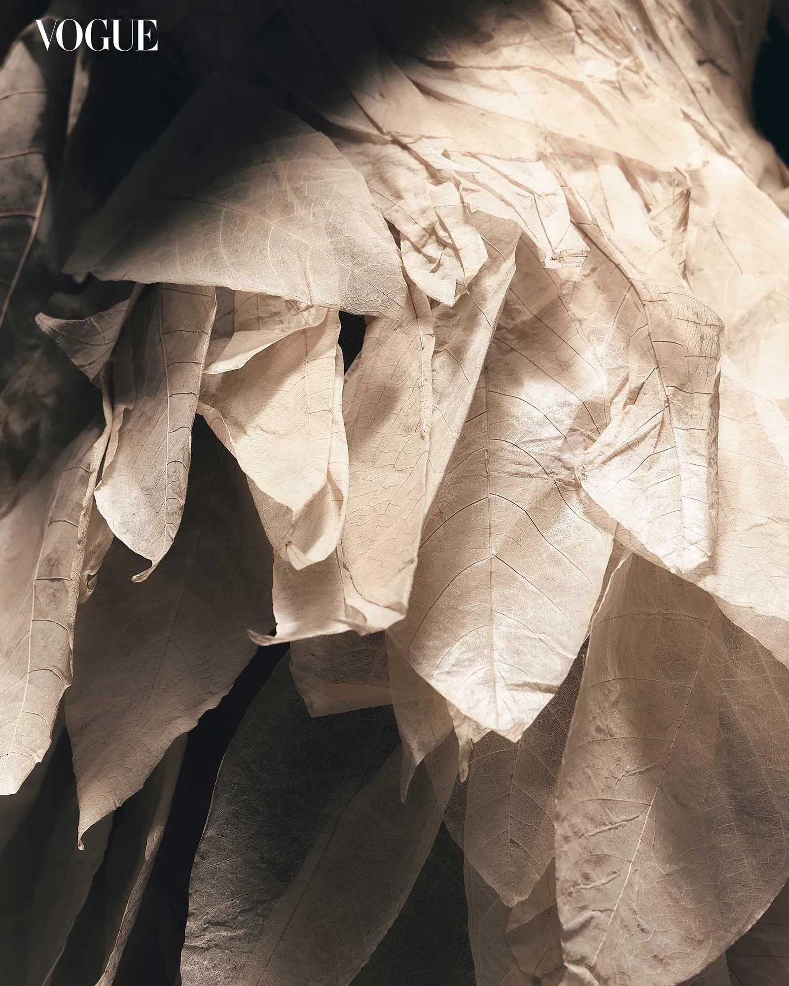 “My only goal is to finish the dress,” Viñas recalls during the shoot for Vogue Philippines. “But I want to, you know, add some sculpting element in it. So I started with sculpting the face. So I have a face element in my dress. And then when I finished it, I just added and added leaves and it became that. So I didn’t have an actual plan on making it. But it became that because I’m just looking at the other queens. And when I see them adding more and more leaves on their garments, I’m like, this is a competition. I need to be the best.”