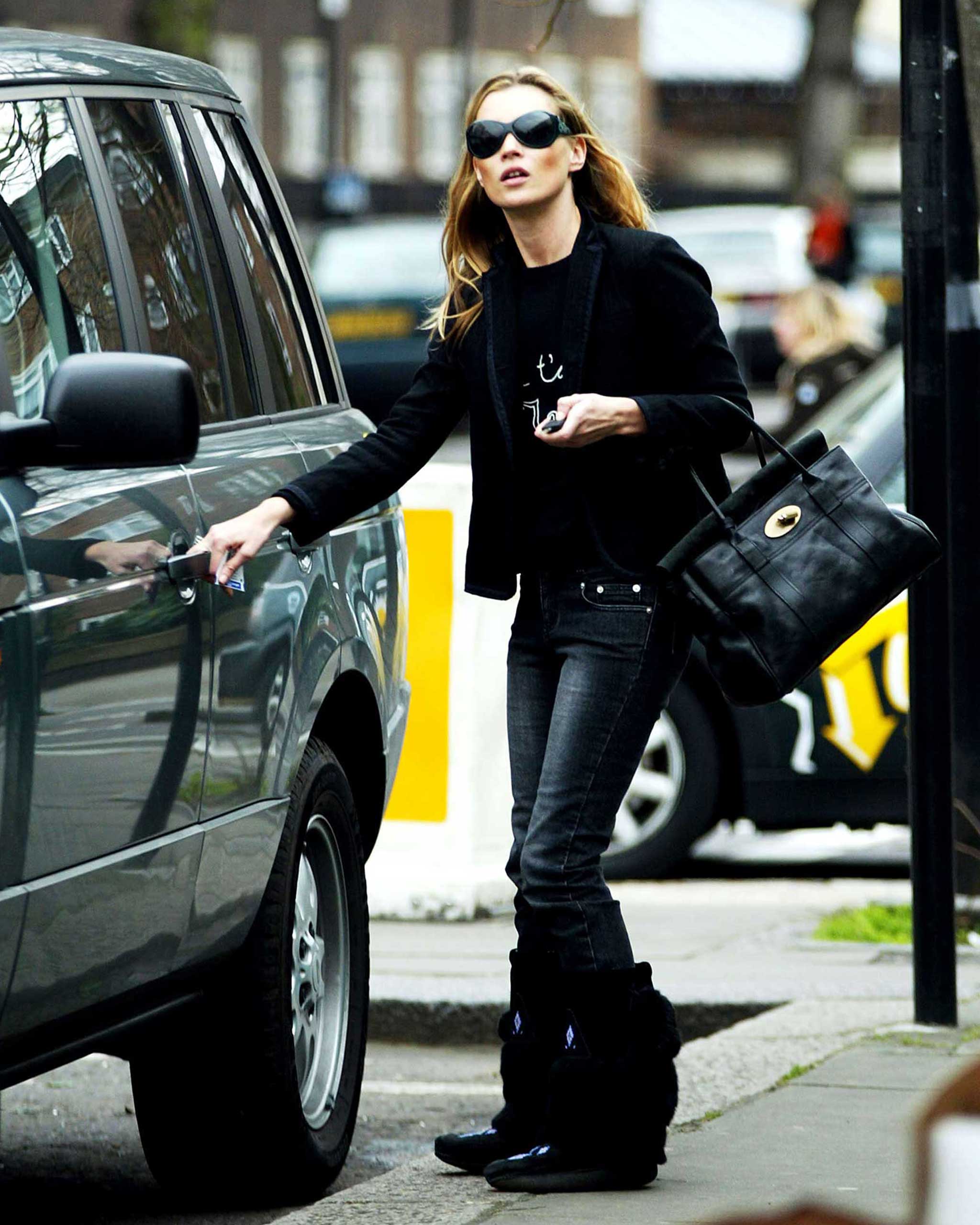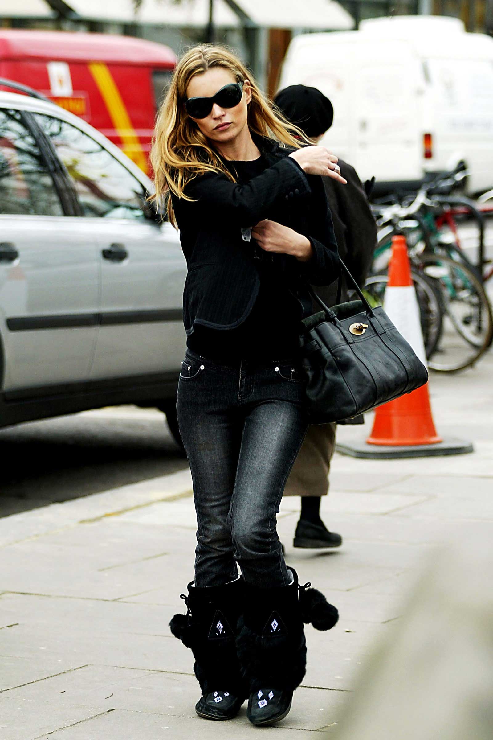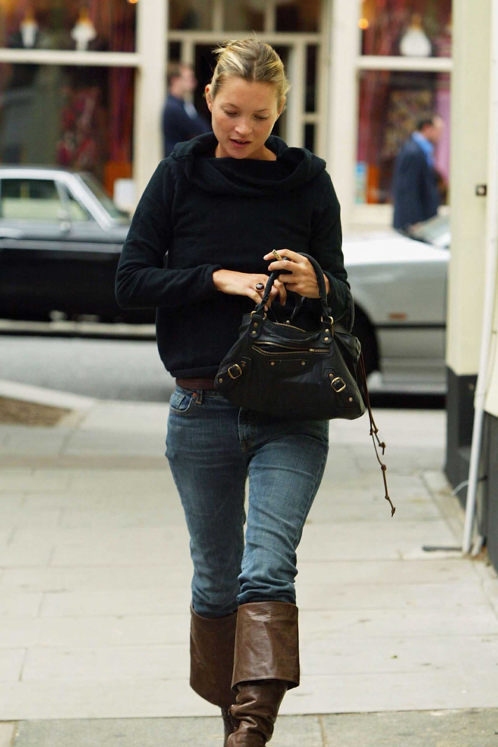 2003 was a significant year for Moss because, after giving birth to her daughter Lila in September 2002, the model mother reaffirmed the foundations of her wardrobe. Central to this was denim. Specifically, figure-hugging denim. The coolest mom on the planet, Moss pushed prams and appeared at Dazed & Confused parties (Lila’s father, Jefferson Hack founded Dazed Media) wearing variations of the same outfit on repeat: skinny jeans tucked neatly into boots with a military or faux fur jacket thrown on and a slouchy tote (Balenciaga’s Le City, Longchamp’s Gloucester Duffle and Mulberry’s Bayswater were all favorites) nestled in the crook of her arm. It was simple yet a soupçon rock‘n’roll—the uniform that would take her from Loulou’s to the Isle of Wight festival by the time she was dating Pete Doherty.