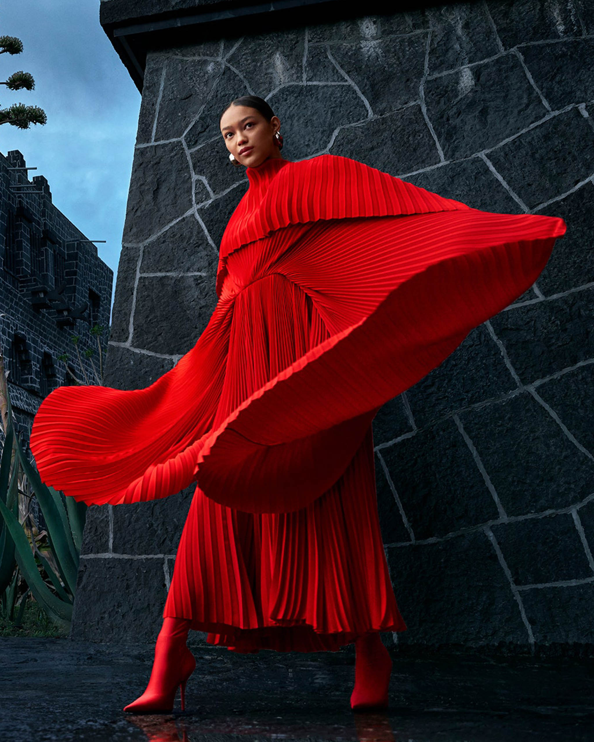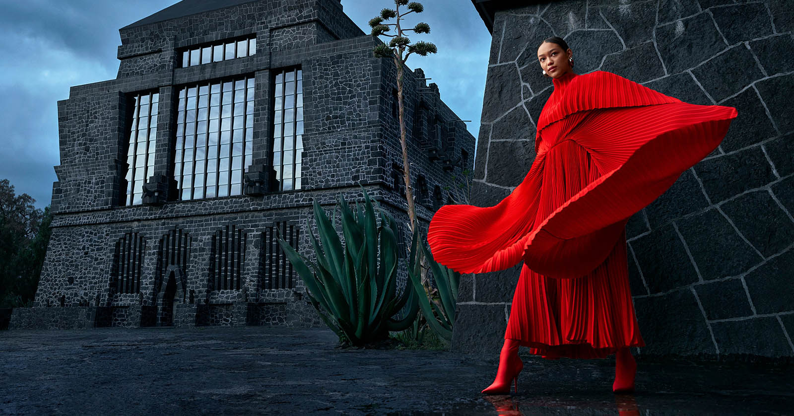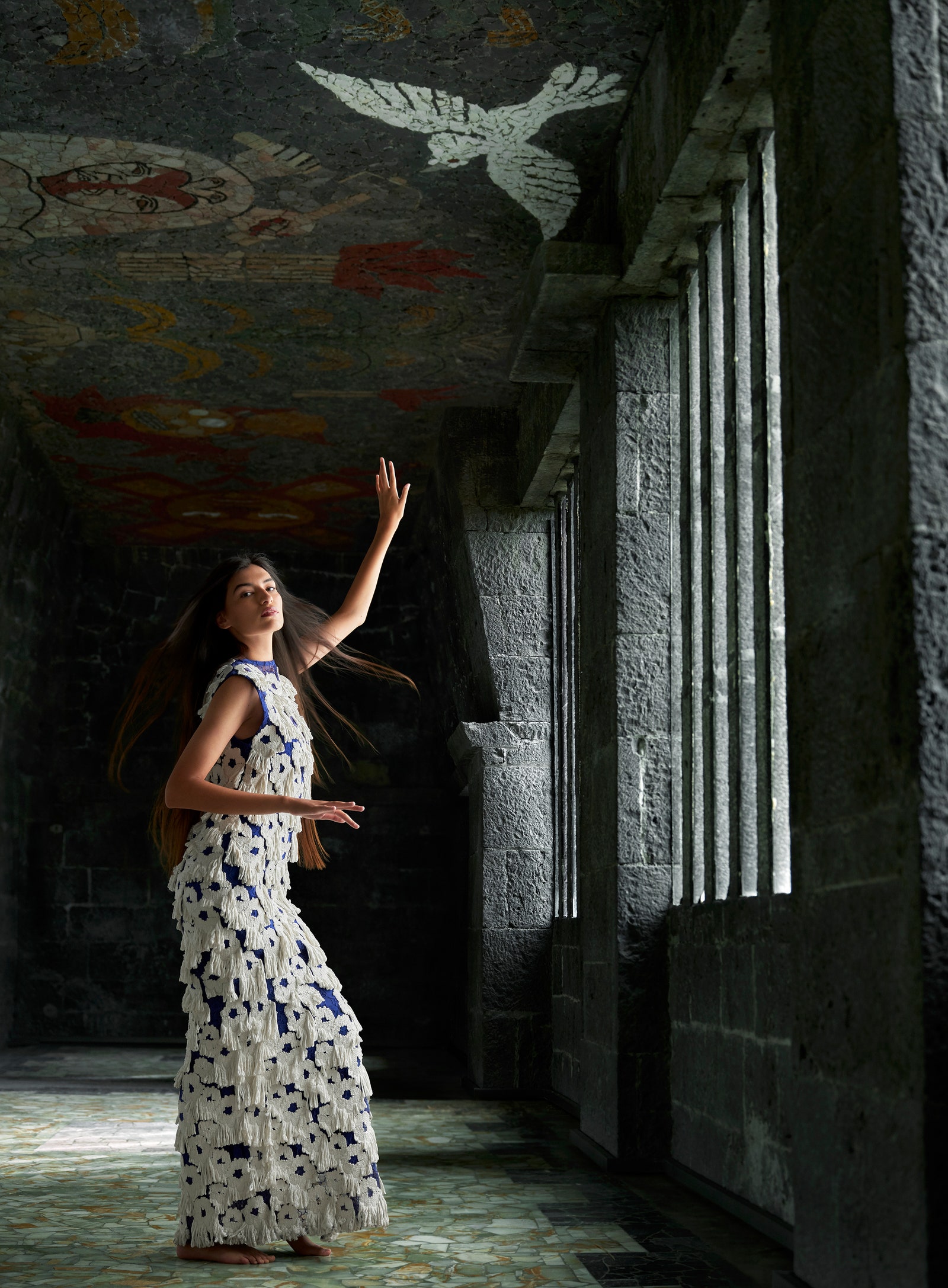 At the Museo Anahuacalli- conceived by artist Diego Rivera as a temple to both pre-Hispanic and modern art- model Aneken Zaldivar shows off her wingspan in a dramatically layered Balenciaga dress and pantaleggings; balenciaga.com. Fashion Editor: Max Ortega