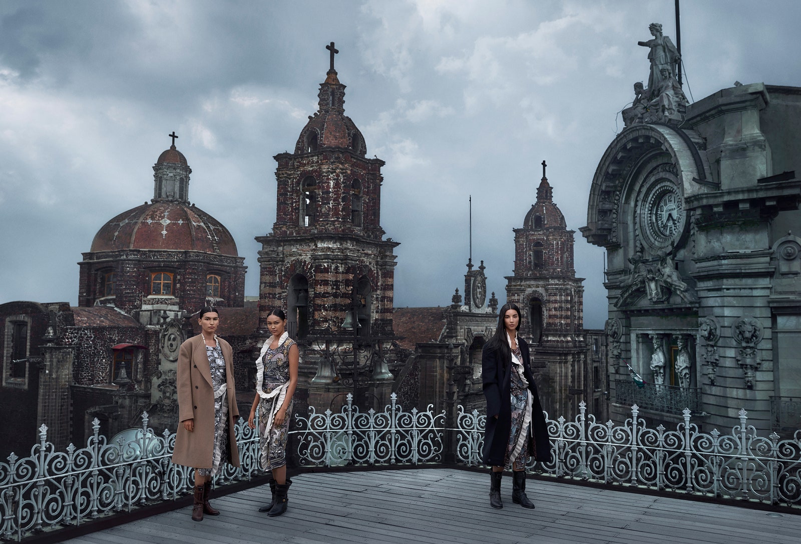 On the rooftop terrace of the Museo del Estanquillo Colecciones Carlos Monsiváis in the city’s Centro Histórico, Romero, Zaldivar, and Mar pick up the earthen tones and textures of the neighboring Church of San Felipe Neri (also known as La Profesa) in coats, dresses, and boots from Louis Vuitton; select Louis Vuitton boutiques.