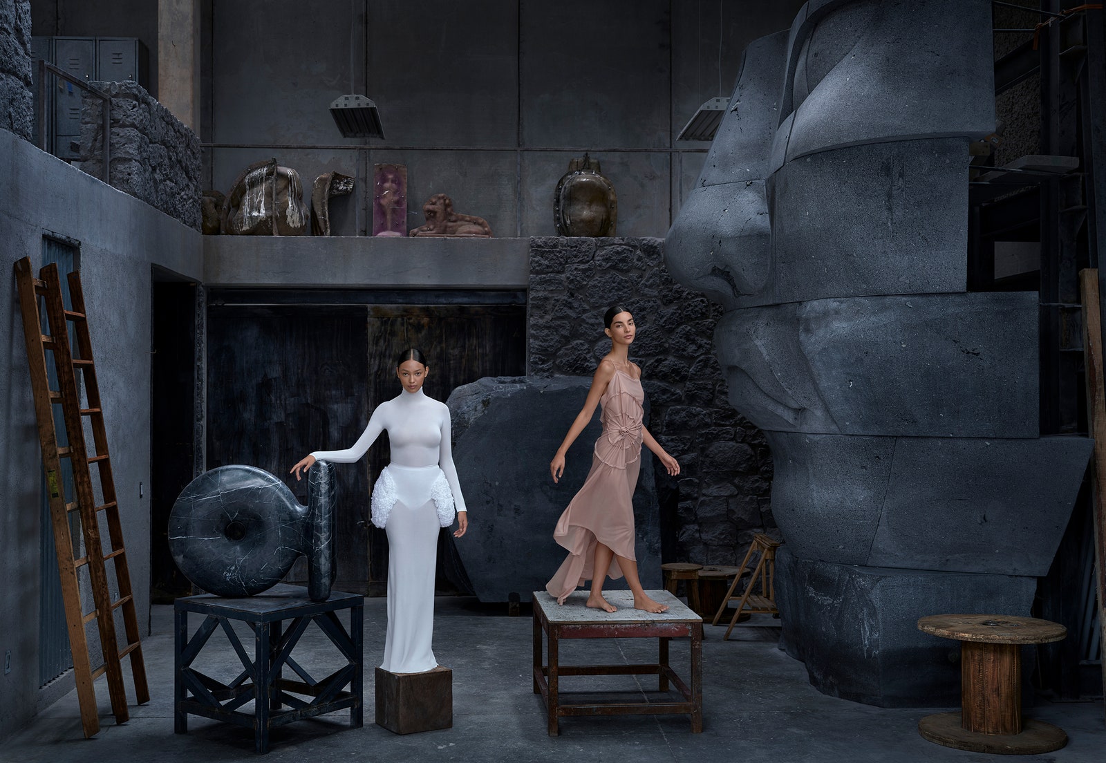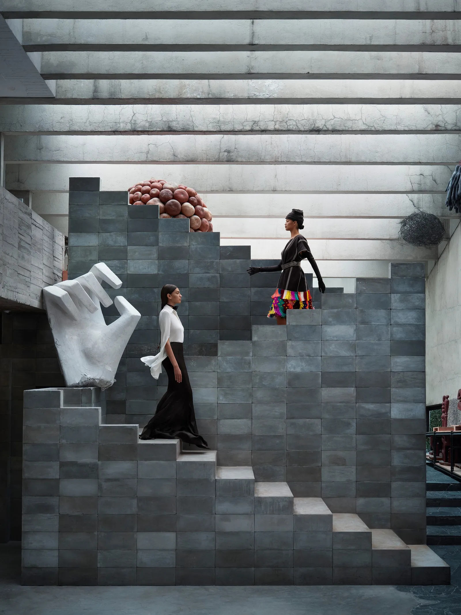 Inside the rambling Brutalist manse that multimedia artist Pedro Reyes shares with his wife, fashion designer Carla Fernández, the studio space is the backdrop for more extraordinary creations. Zaldivar wears Alaïa; maison-alaia.com. Mar wears Victoria Beckham; victoriabeckham.com.