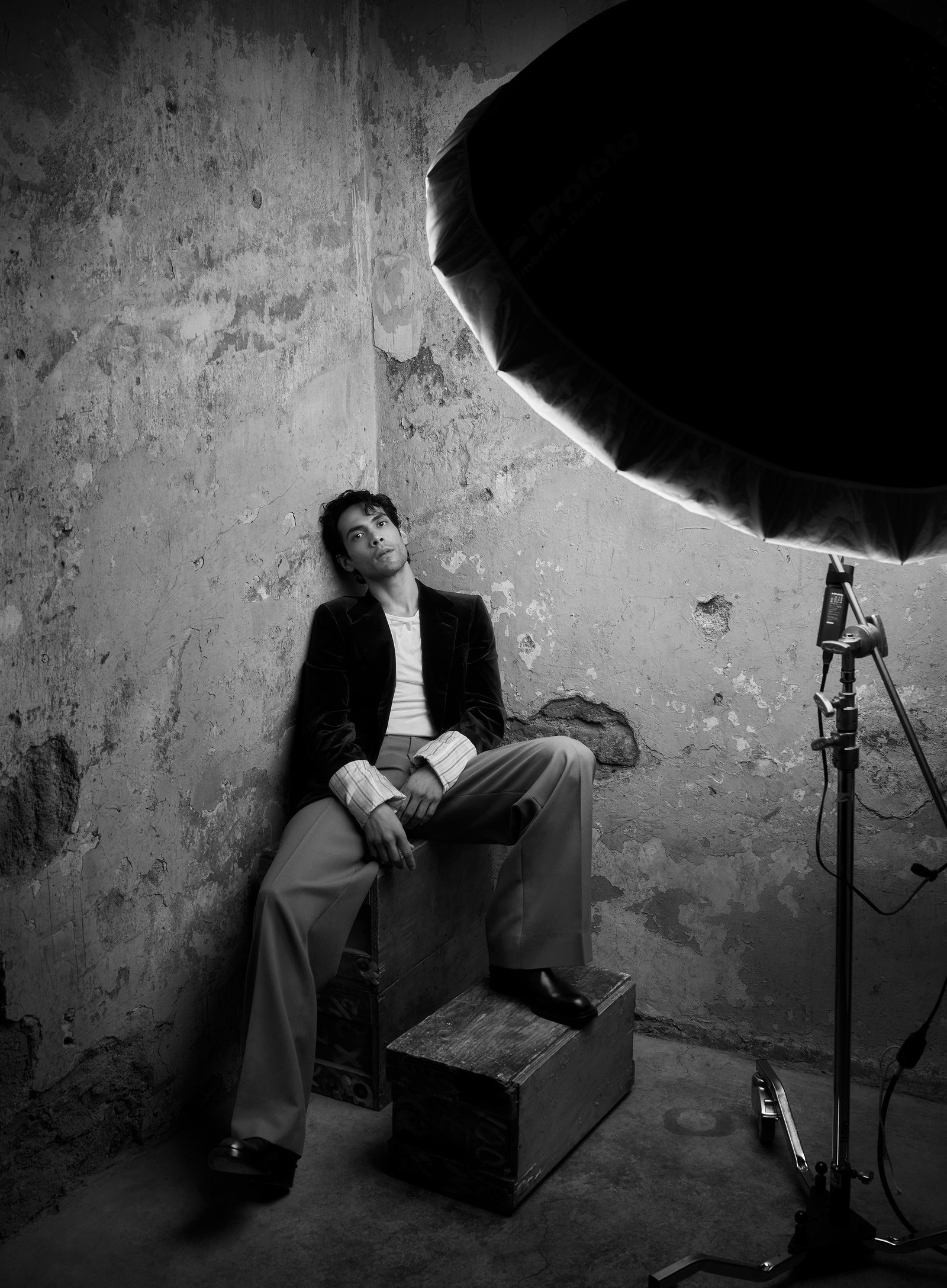 Babylon and Narcos: Mexico star Diego Calva, an alumnus of the Centro de Capacitación Cinematográfica (CCC), a prestigious film school in Mexico City, wears a Gucci jacket, T-shirt, and pants. Alexander McQueen boots. Location: Proyecto Público Prim.