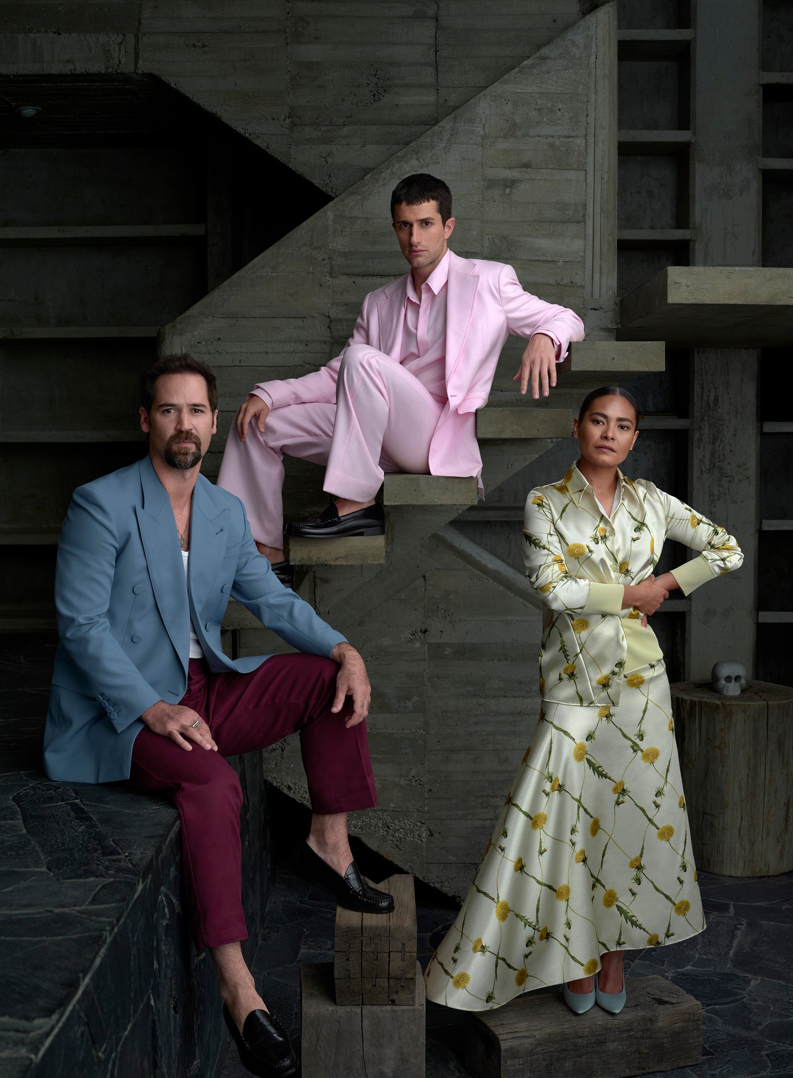 From left: The Guadalajara-born Manuel Garcia-Rulfo—who stars in Netflix’s The Lincoln Lawyer, adapted from Michael Connelly’s books by David E. Kelley and Ted Humphrey—wears a Gucci jacket. Hanes tank top. Dickies pants. Mexico City native Dario Yazbek Bernal, who can be seen this fall in the romantic thriller Pet Shop Days, wears a Gabriela Hearst jacket and pants. G.H. Bass Originals shoes. Actor Mabel Cadena, who hails from Atizapán de Zaragoza, just northwest of the city, and appeared last year as Namora in Black Panther: Wakanda Forever, wears a Burberry shirt and skirt. Saint Laurent by Anthony Vaccarello shoes.