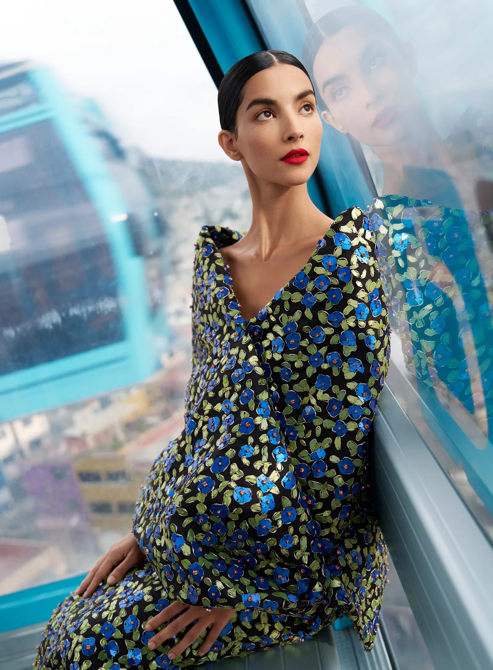 Soaring over Ecatepec de Morelos on the Mexicable, Mar catches the light—and throws a little of her own—in a shimmering floral Richard Quinn top and skirt.