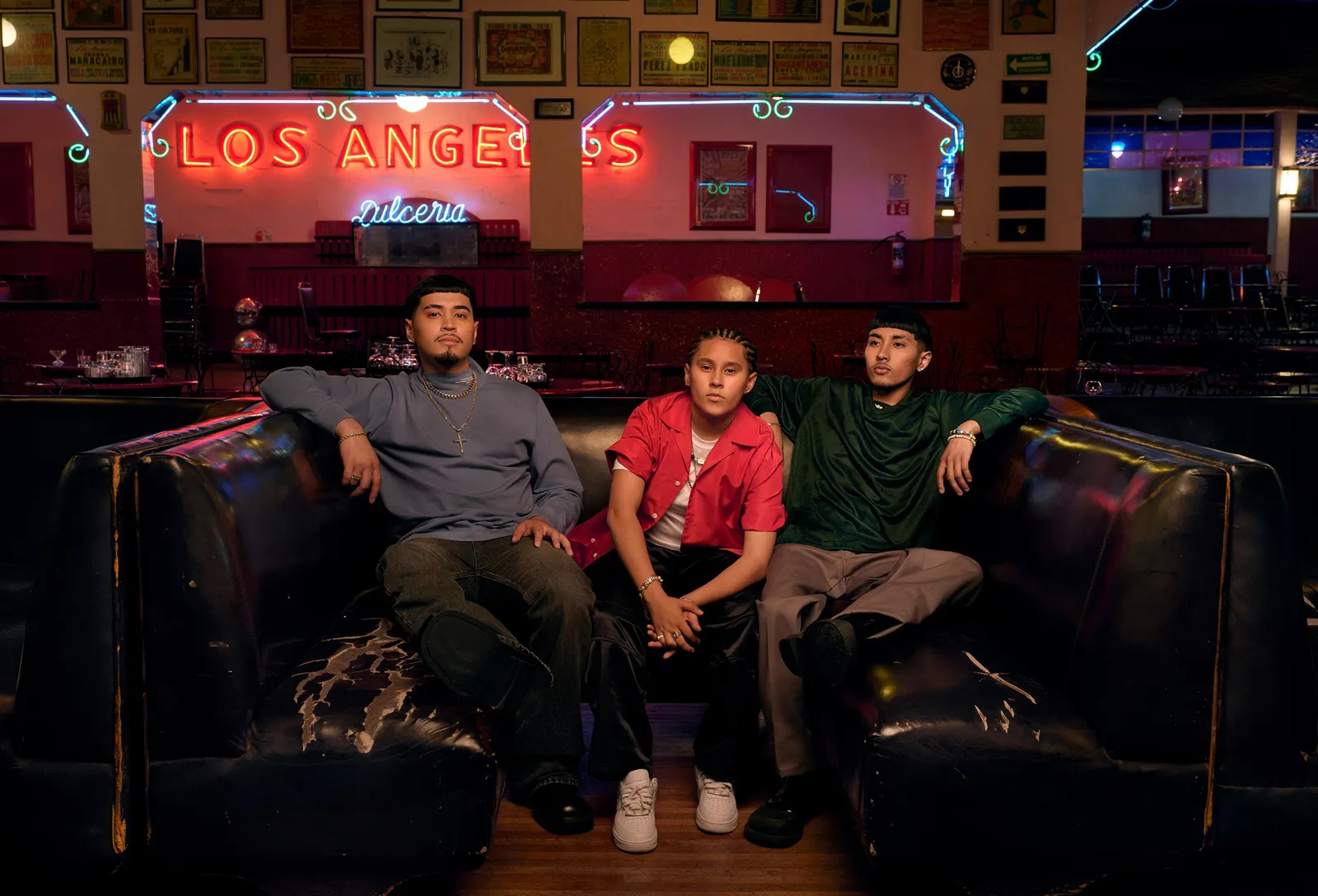 Fresh from releasing their second EP, Obsessed Pt. 2, this past September, members of the Washington State-based musical trio Yahritza y su Esencia hang loose. From left: Armando Martinez wears a Dior Men top. Balenciaga jeans. Ferragamo boots. Yahritza Martinez wears a Willy Chavarria shirt and pants. Hanes T-shirt. Jairo Martinez wears a Burberry shirt. Dickies pants. Loewe boots.