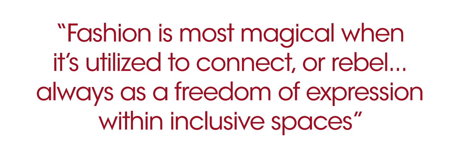 For me, inclusivity is accessibility. To remove the idea of fashion as something untouchable or difficult to be part of is to kill the industry. To be inclusive is to engage with people from different backgrounds, shapes, and identities. Access to good fashion education, as well as information on the social importance of fashion whether as physical clothing or image-making or marketing, is crucial. In terms of inclusivity, fashion’s getting there, but it’s still quite far from where it really needs to be.