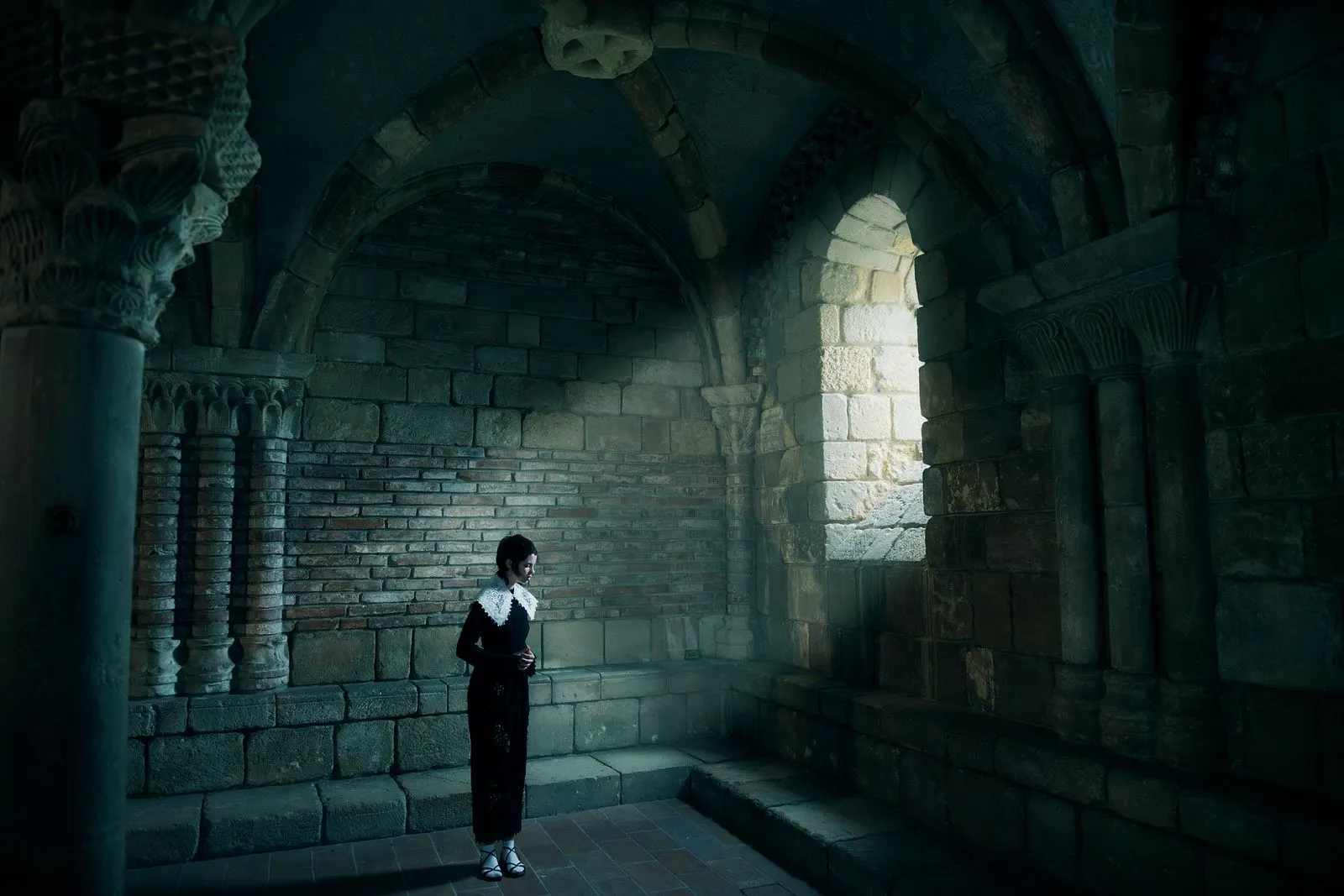 Johnston photographed at The Met Cloisters in Manhattan. Loewe dress.