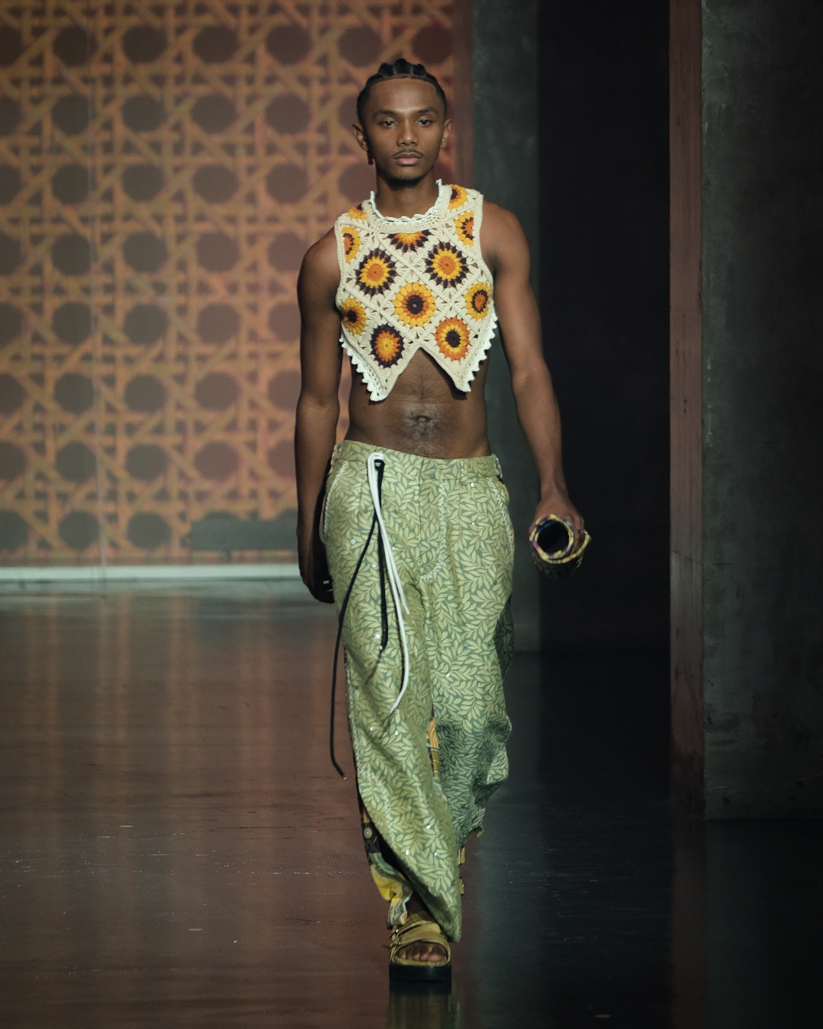 In a desire to highlight sustainability in fashion, Glarino used upcycled materials to create some of his looks. His signature patchwork fabric was present in the pieces, mixing different shades of denim with deadstock upholstery fabric that he collected during the pandemic, lending a variety of textures to the patchwork jackets and pants. The crochet pieces are made of repurposed yarn from dismantled and reworked crochet pieces, paying homage to his grandmother practicing the craft.