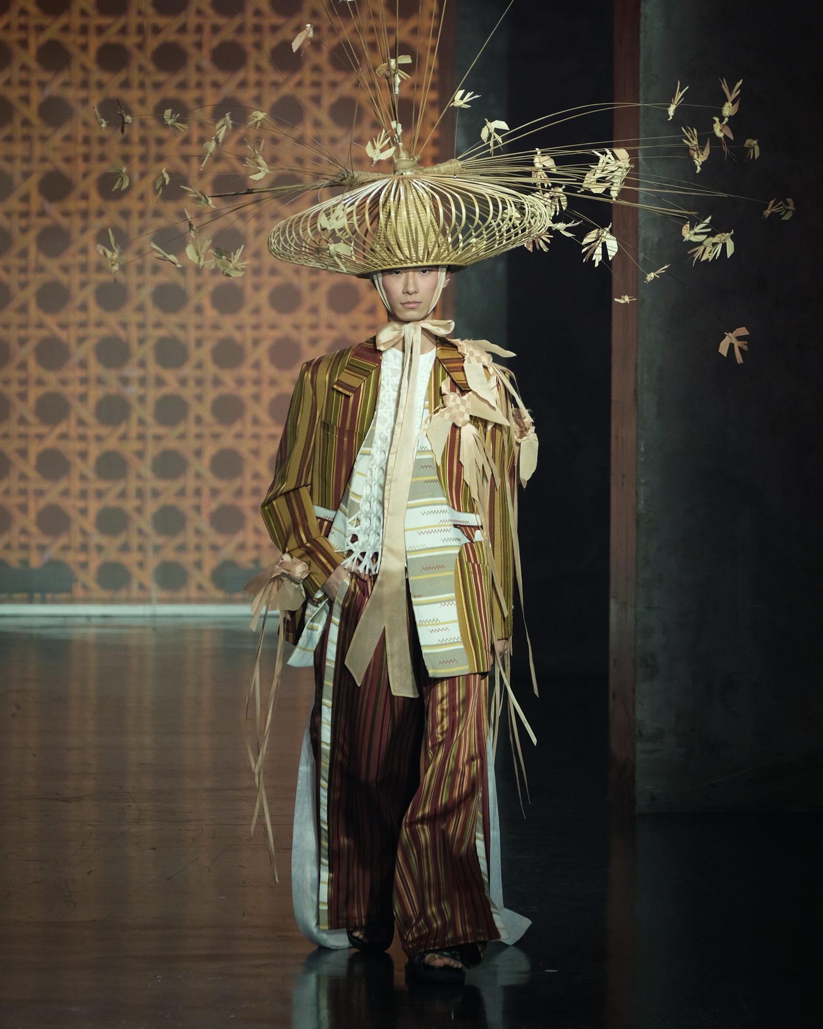Everything about Jaggy Glarino’s new collection represents his nostalgia for a childhood spent in his lola‘s kitchen, Roming’s La Paz Batchoy and Kapehan, observing the cooking process. From the elbow-length gloves inspired by kitchen mittens, to woven plate covers and table centerpieces turned into statement headpieces and solihiya rattan woven placemats reimagined as garments, Glarino’s Spring/Summer 2023 collection references items that can be found not only in his grandmother’s kitchen but in most traditional Filipino kitchens.