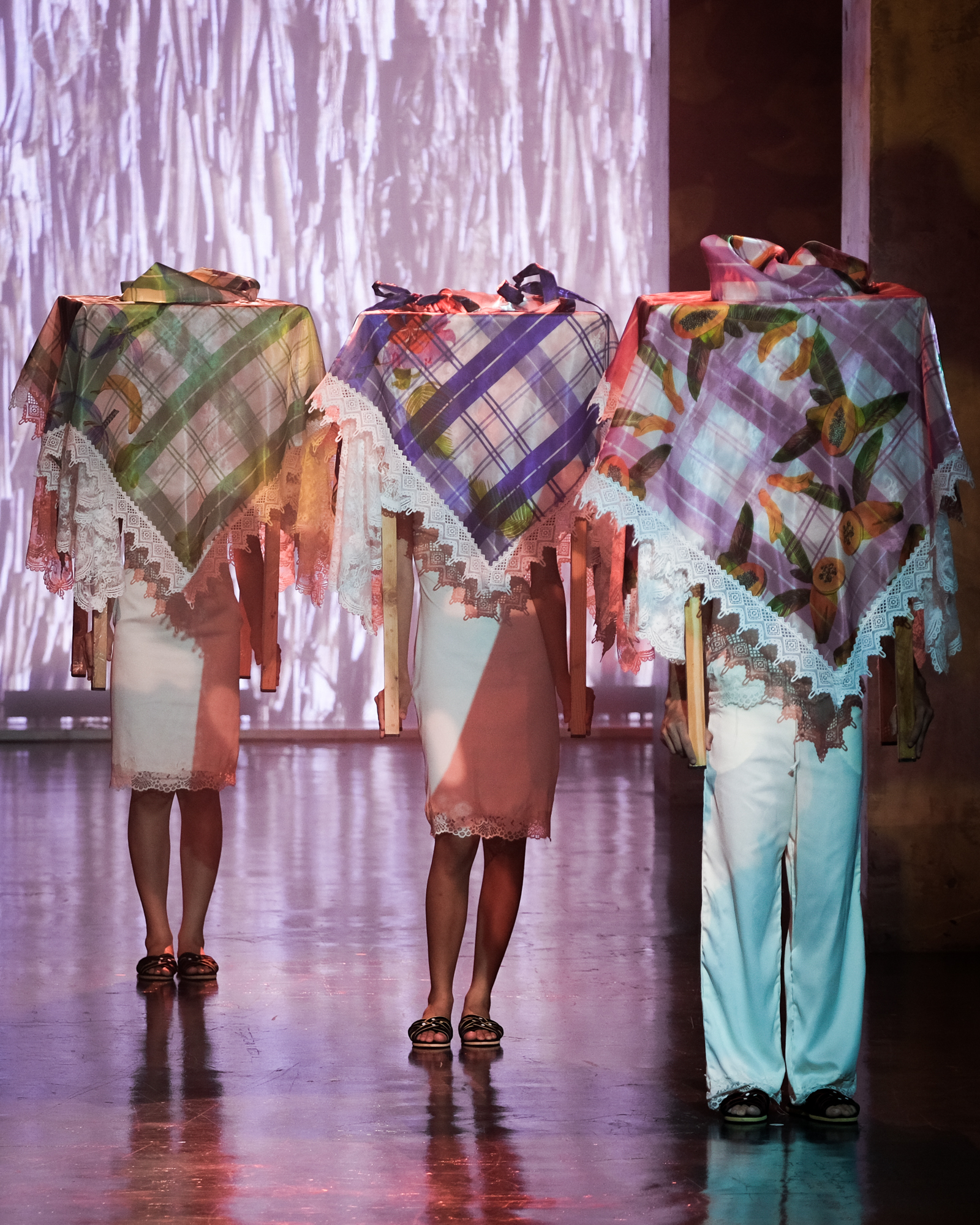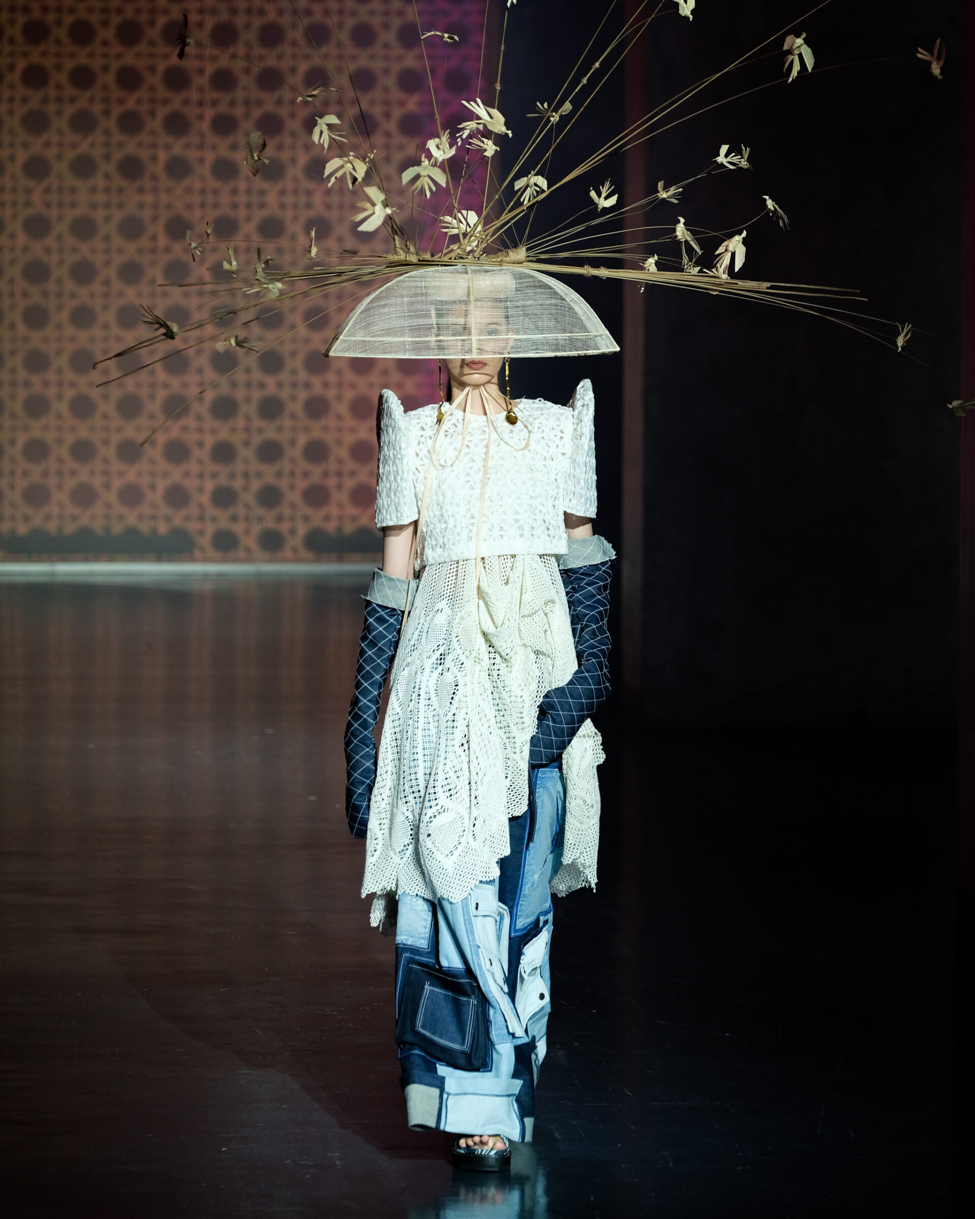He wanted to capture the full joy of cooking in his collection, from taking home fresh ingredients from the wet and dry market to preparing and presenting the food. Different types of table covers, from lace-lined white linen fabric to colored picnic blankets, were used as fabric in his garments. He used pans, straw woven market bags, and pastel-colored thermos pieces as accessories.