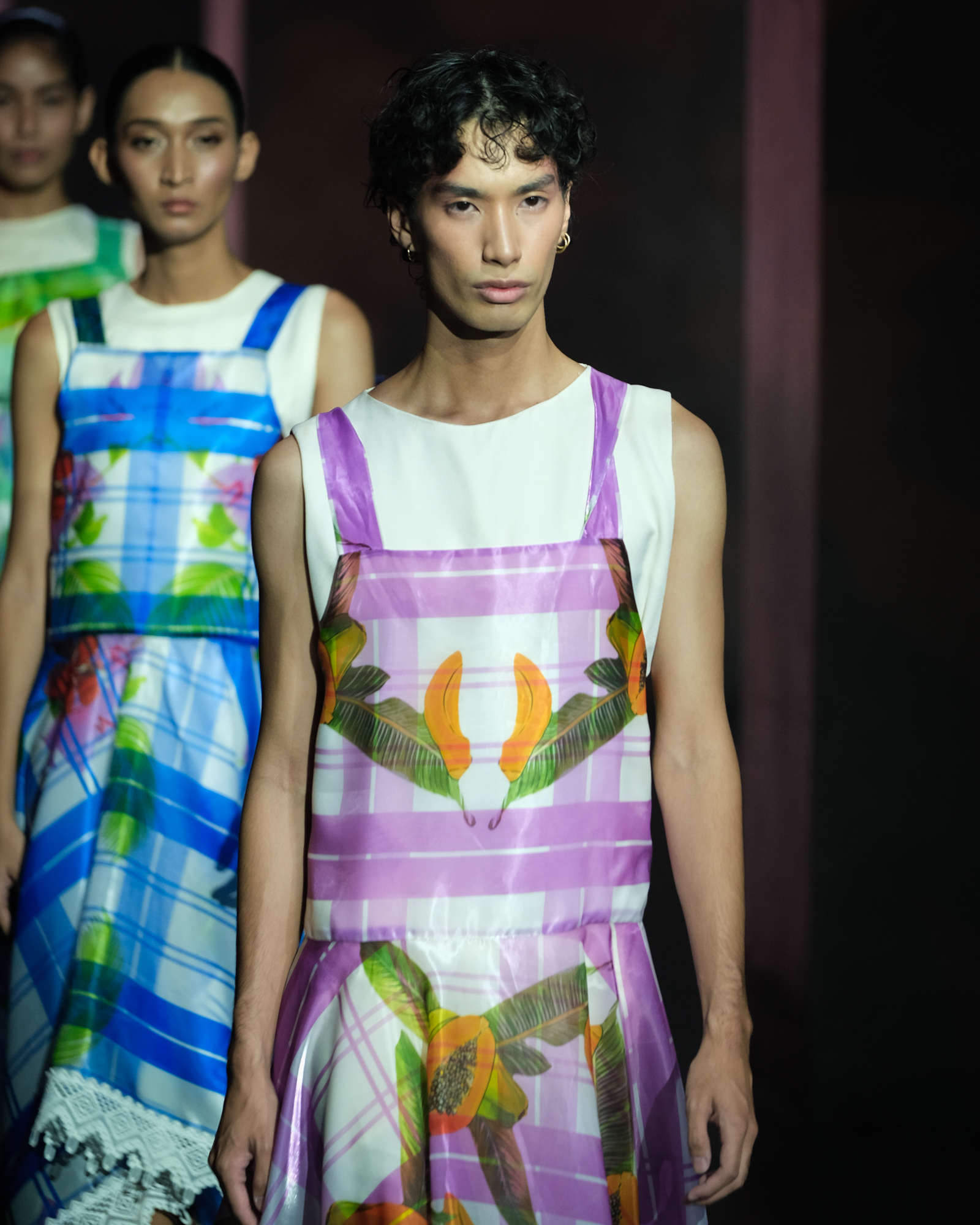 In the middle of the show, models in plain white dresses emerged carrying picnic tables. Each table was adorned with colorful picnic mantles that transformed into slip-on dresses resembling aprons and lined with white lace at the bottom. Throughout this presentation, a traditional Ilonggo lullaby lent a nostalgic and at times solemn tone to the show: “Ili Ili Tulog Anay,” was what his grandmother sung him to sleep.