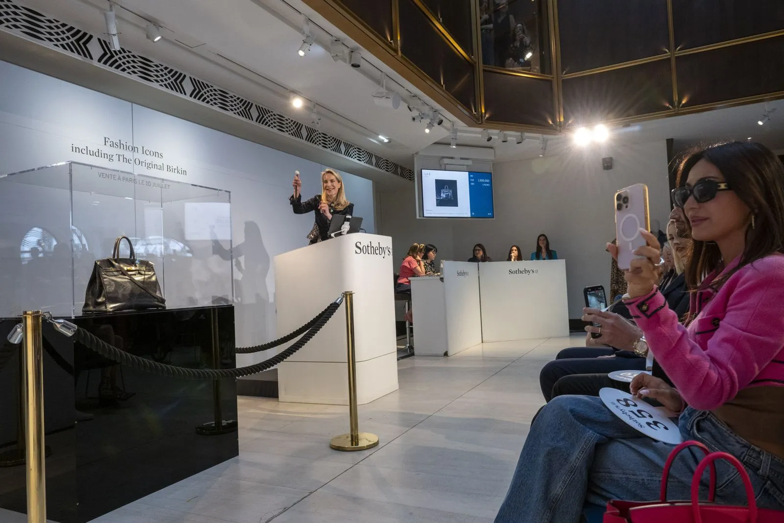 Across 10 minutes, paddles rise at speed and hands shoot up from the phone bank. Bidding opens at €1 million ($1.7 million) to loud gasps; that single bid broke the previous world record for a handbag sold at auction, set in 2021 by the Hermès White Himalaya Niloticus Crocodile Diamond Retourne Kelly 28, which went for $513,040. Nine collectors emerge across the phones, online, and in the room in a manic exchange of bids. Eventually, the gavel comes down on a hammer price of €7 million ($8.2 million). After the fees and buyer’s premium, the final price is a staggering €8.6 million ($10.1 million). The bag was sold to a private collector from Japan, who bid via telephone through Maiko Ichikawa, the head of Sotheby’s in Japan.