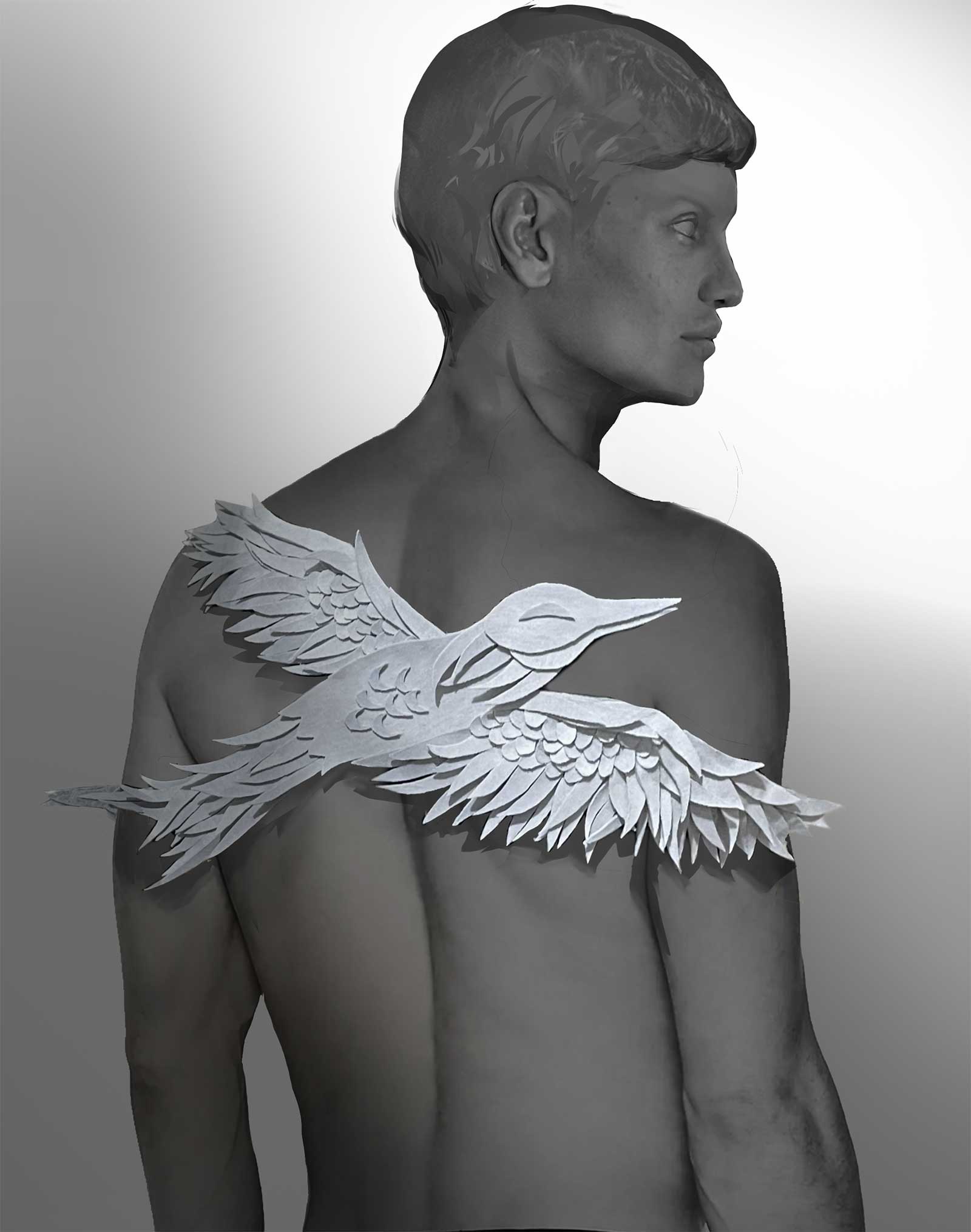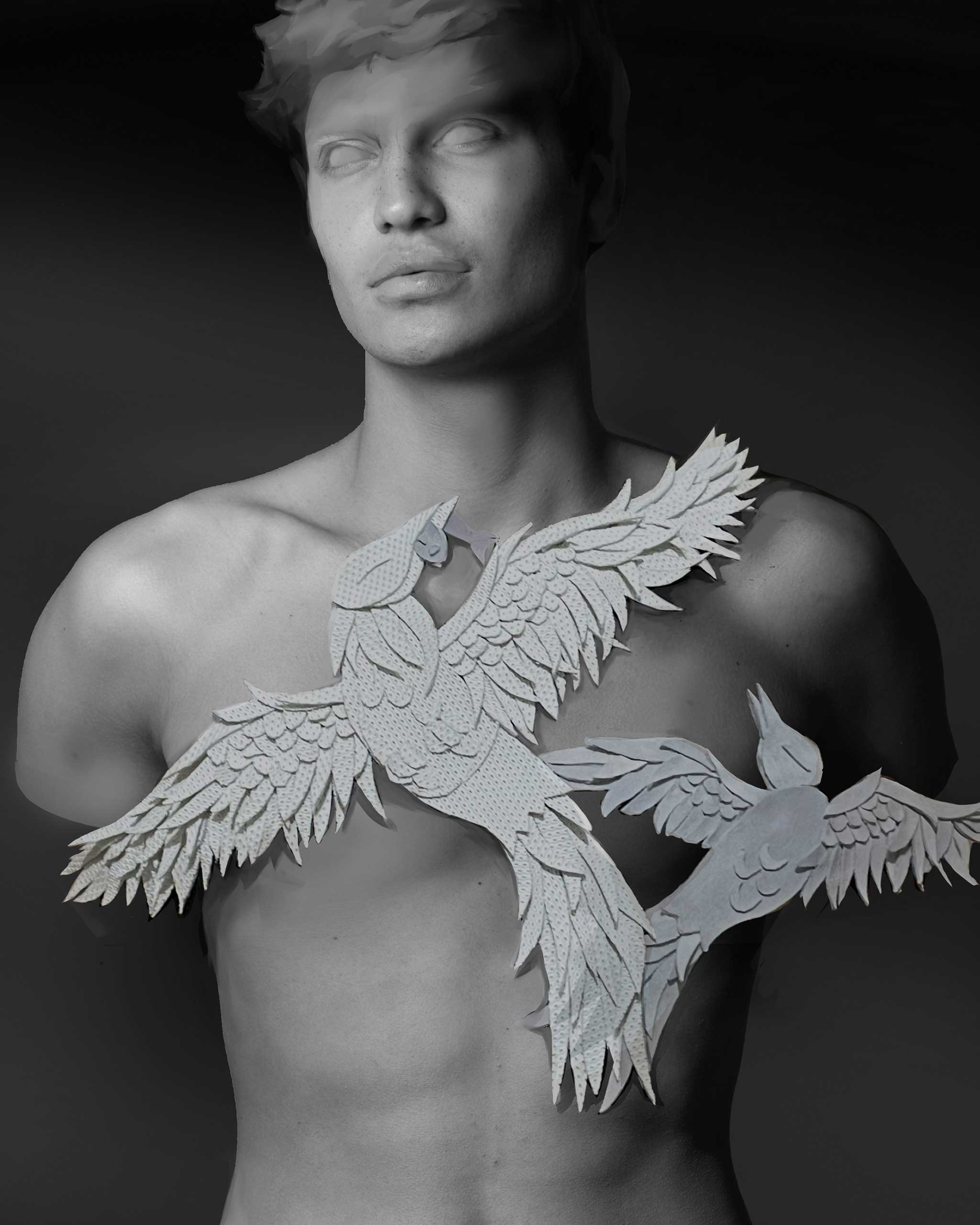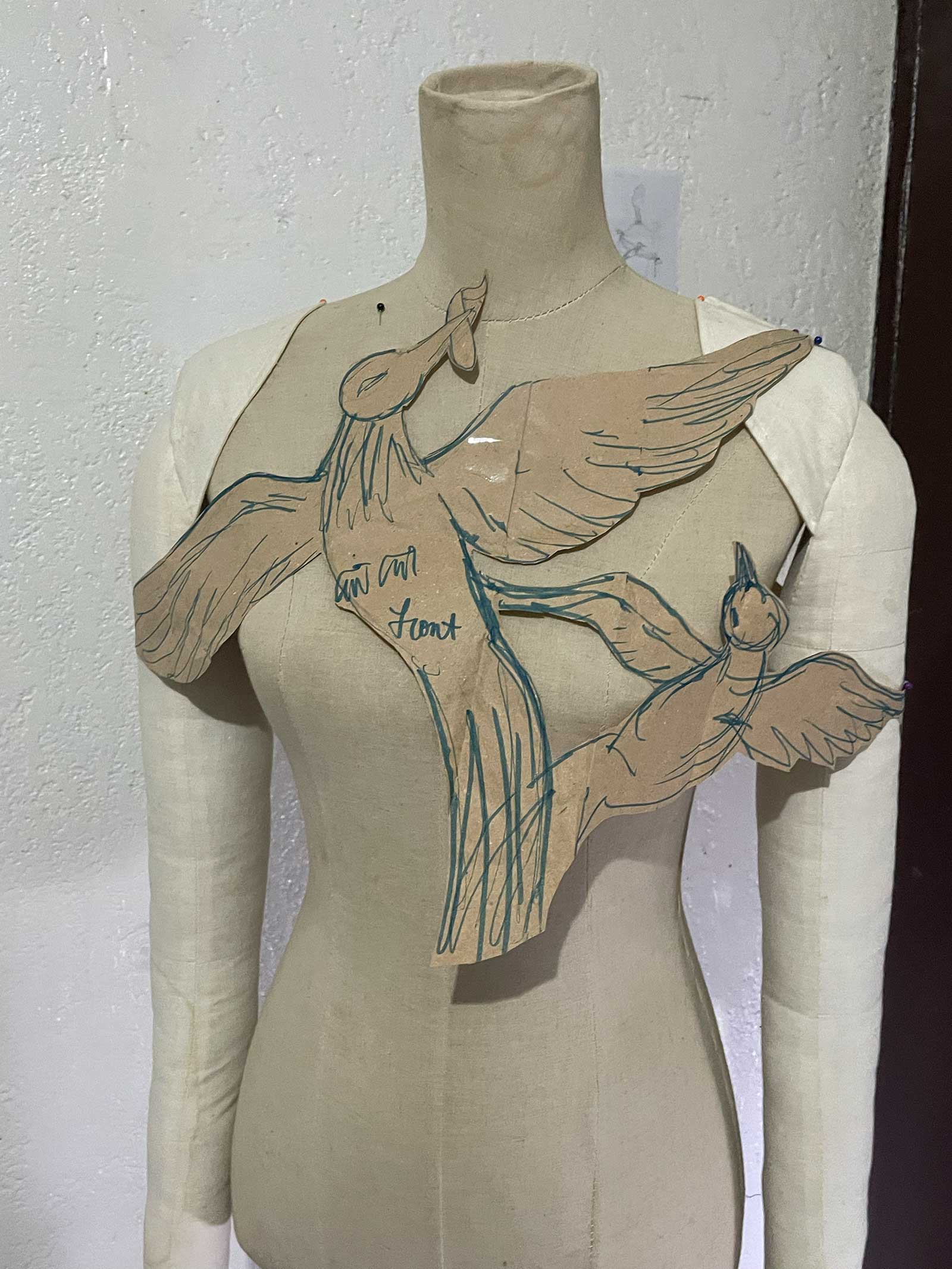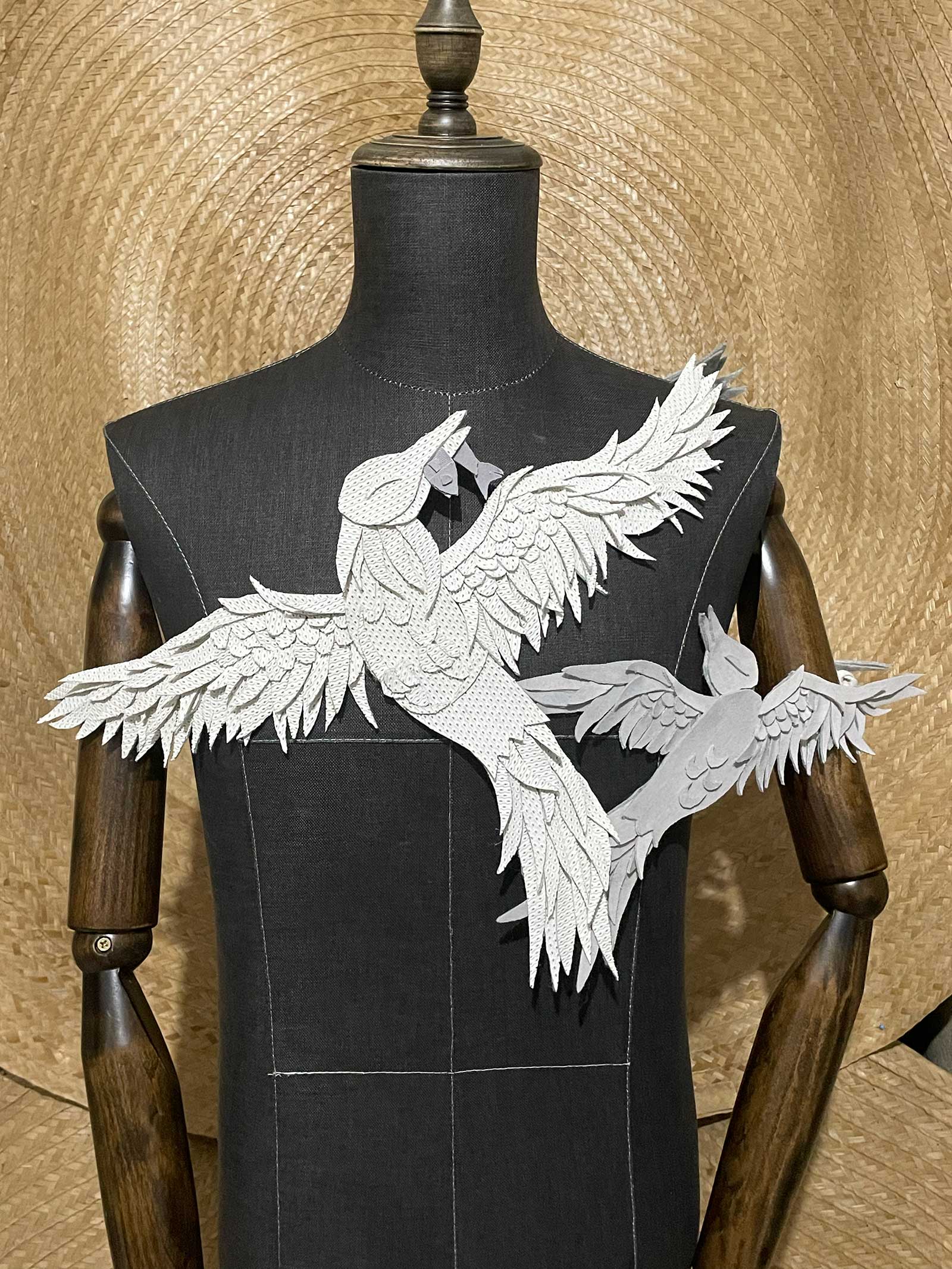 The Empty Nest Parure showcases a father bird made from my father’s damaged basketball jersey shorts caring for his son bird made from my stained active shirt in front and a grown up version of that same bird at the back. If we base it to my own conceptualisation; it would mean that the connection between my father and I- my talent and love of the arts coming from him- can only be seen once our differences are destroyed and then turned into something else- in this case a scene of familial birds. A story about how this scene relates to my father is that like his father bird counterpart in my parure, he tried to connect with me as a child by drawing me pictures I truly admire—mermaids, elves, fairies, and birds—but despite this act of connection our blaring differences made me discouraged to open up to him more since I already knew from the age of three that I am a feminine homosexual before even understanding the terminologies and my father is the picture of masculine man and he was a professional basketball player after all. Growing up, I built walls around him, making us farther but I am thankful that despite our obvious and magnanimous contrasts we have one thing in common aside from blood and that is our love for the arts.