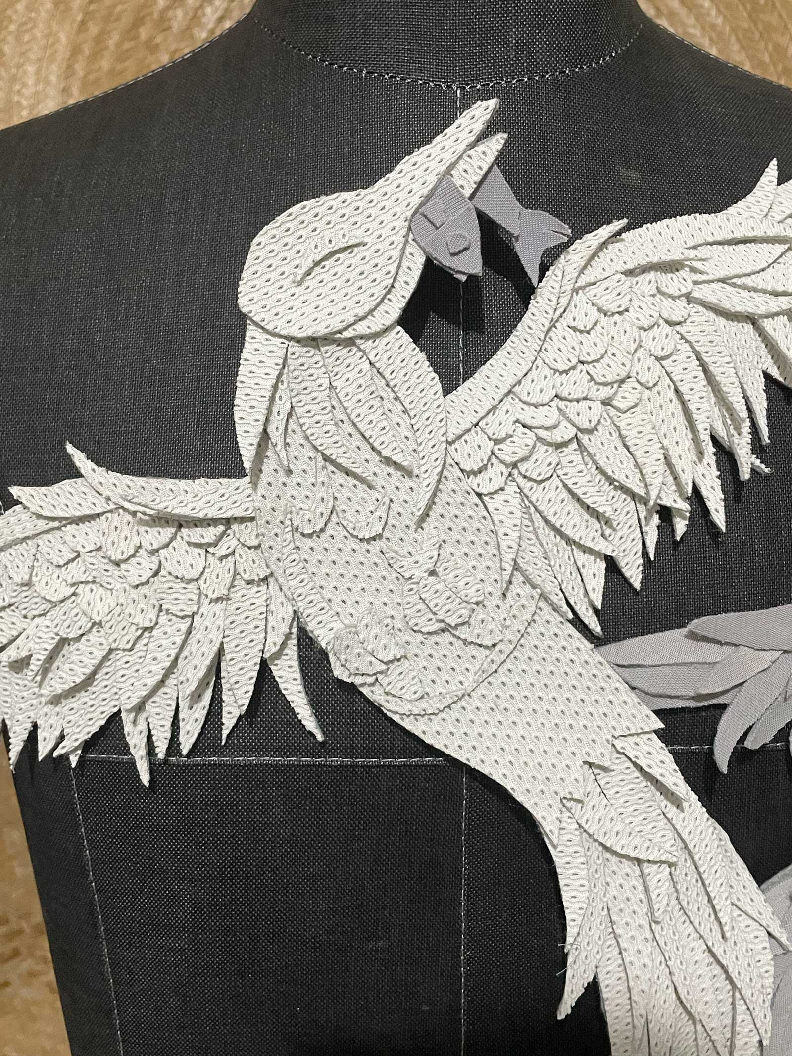 With this understanding, I made sure that the Empty Nest parure is 100% made from discarded and damaged sportswear materials and goods that are already in their end-of-life; and that the only way forward for these materials is for them to be turned into something else. I also made sure that the parure is made through a closed-loop circular process by not injecting the piece with anything brand new throughout the production: the felting and interfacing were also cut-and-sew waste from previous works and the enclosures also came from damaged sports goods – namely, shoe laces from my father’s worn-out sneakers and elastics from the same damage jersey shorts.