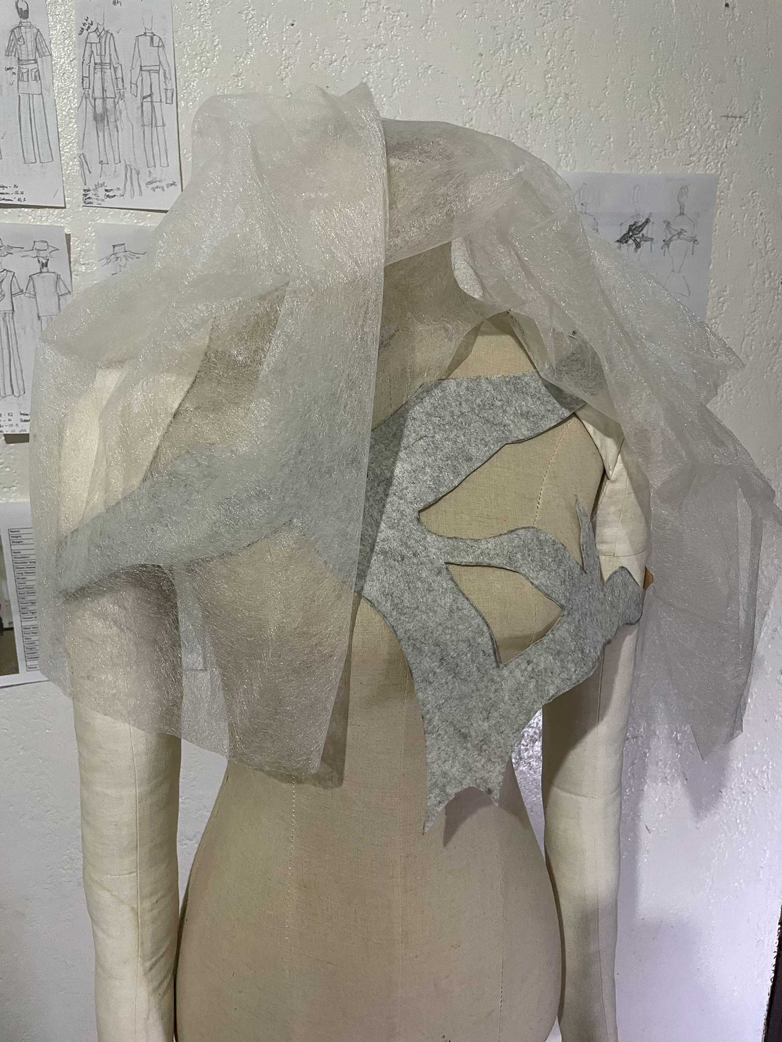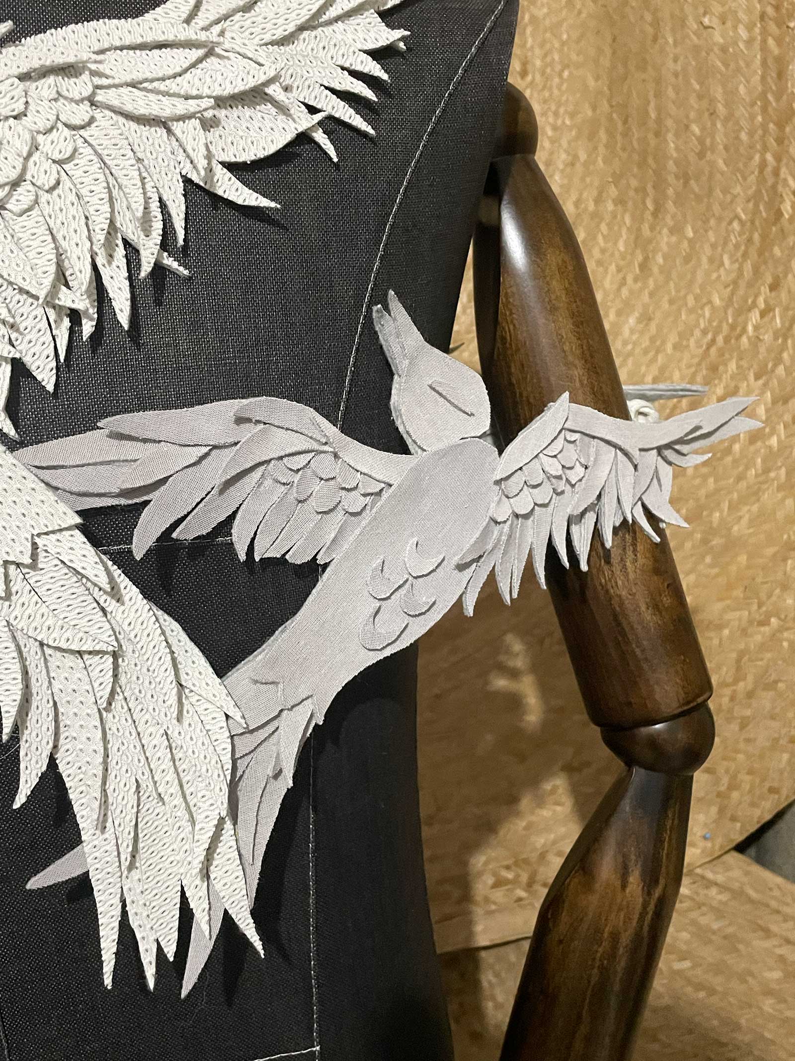 When unworn, we wanted our clothes to have another purpose, and since the birth of our brand by the creation of our first garment- the Baobabs shirt, which we framed for awhile- we determined that they can be displayed as artworks awaiting to join their wearer, which is why we inject other forms of art such as felting (for the Baobabs shirt) and free-hand 3D mosaic for the Empty Nest parure to give this sense and understanding that it is more than just custom designer clothing anymore- but an art piece not deserving to be hidden away. We intentionally do this so the circular materiality will be talked about as well cause we know that one of the questions when it comes to art is always what they were made of, and hopefully will start planting seedlings to eliminate the stigma written around up-cycled clothing.