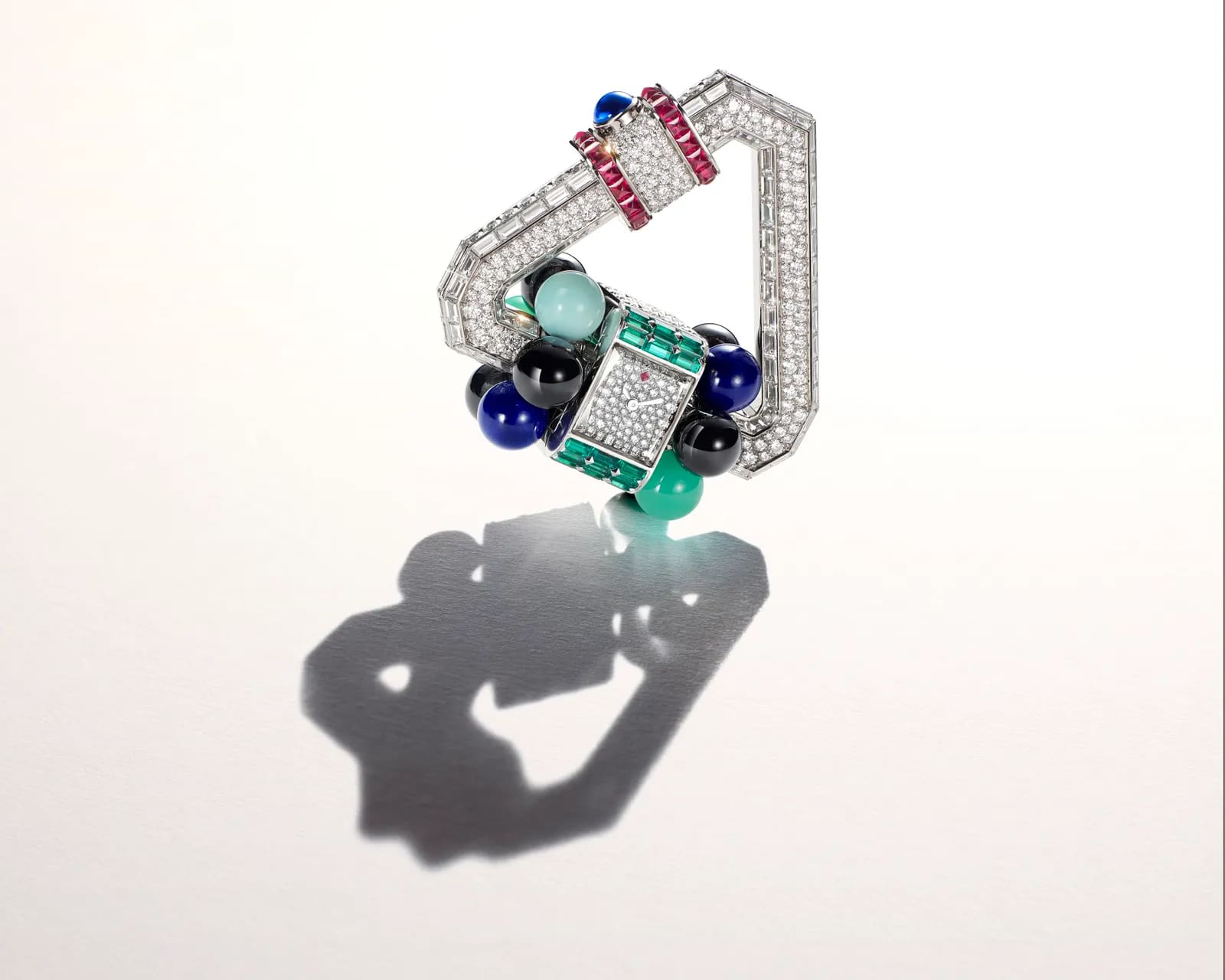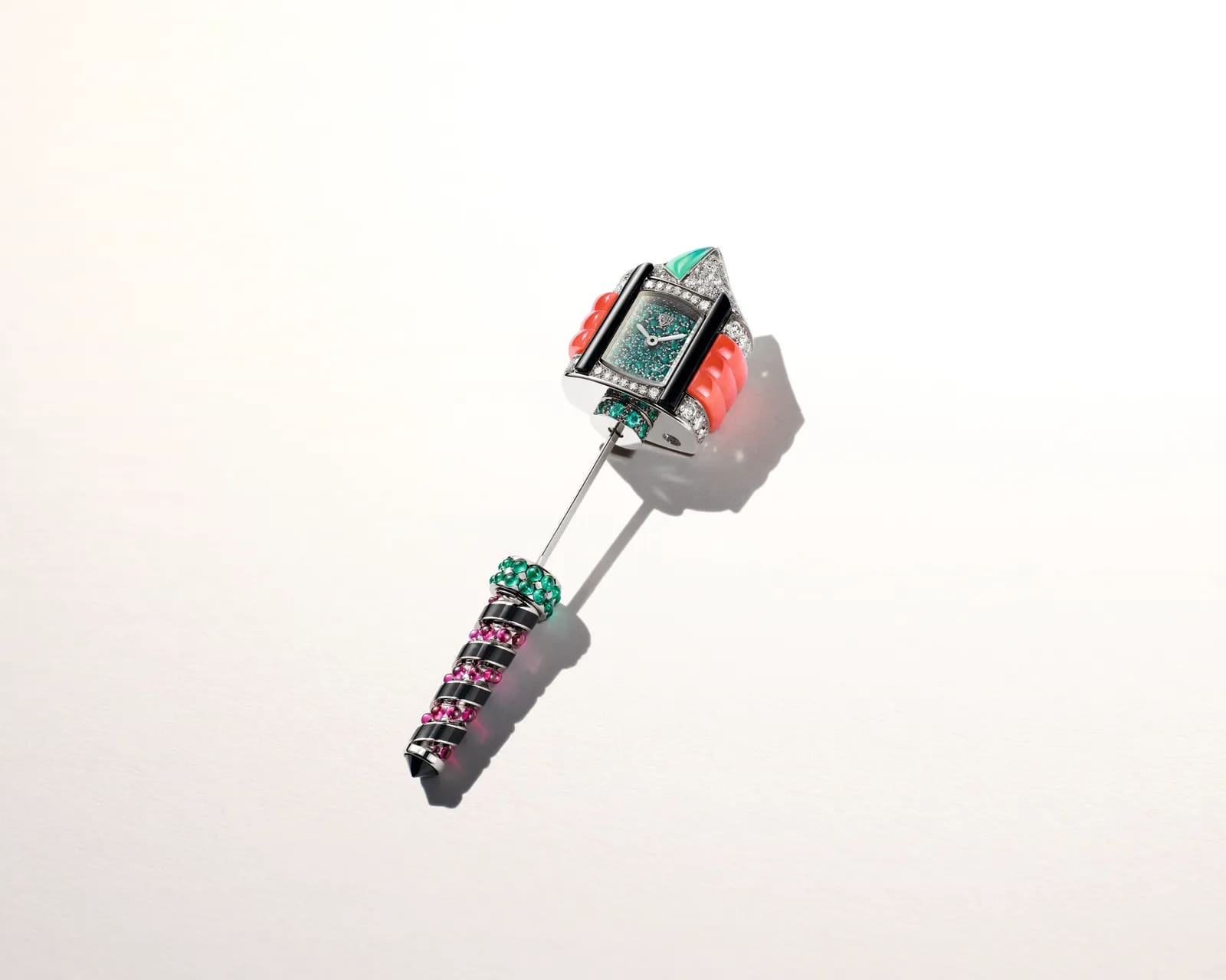 Cartier has also unveiled a series of watches designed for new horological erogenous zones, in the form of a brooch, lapel pin and, (skater girls rejoice!) a cool carabiner clip, part of the Cartier Libre Polymorph collection. Where to wear them? “Wherever you want,” says Pierre Rainero, Cartier’s director of image, style and heritage. The designs display all of Cartier’s Art Deco, geometric and colourful signatures, sparkling with coral, moonstones, emeralds diamonds and onyx. The brooch resembles a feline paw, one of its nail shaped moonstones opening to reveal a mini-watch. The chunky carabiner clip hangs with a diamond-swathed watch which is bookended with juicy beads in turquoise and black and blue lapis lazuli.