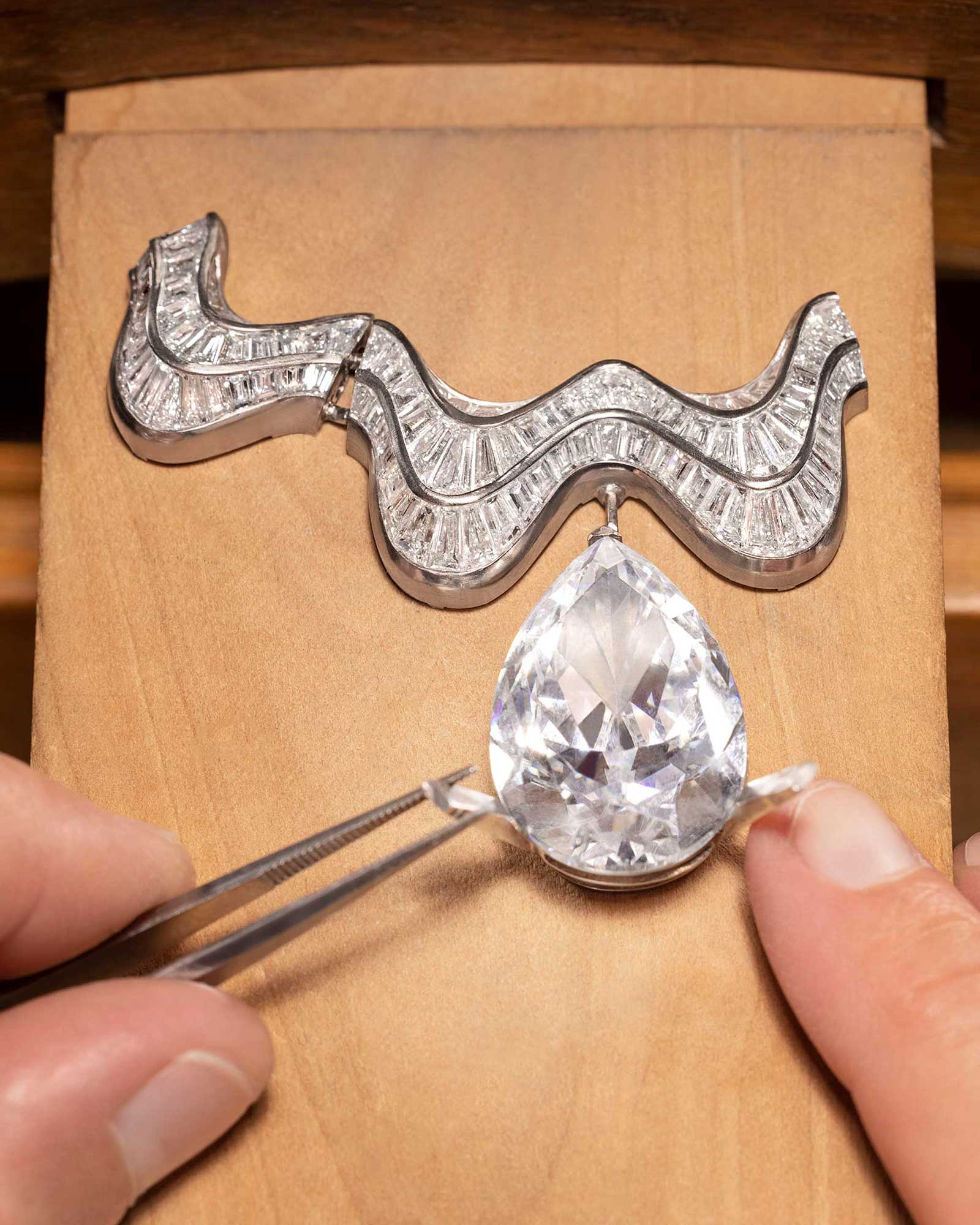 MDR: If you see this necklace, the ‘Serpenti Aeterna,’ which is basically the centerpiece, you will notice the perfection of the baguette cut, the setting, because you don’t see any shadow in order to cut different baguettes in that way and to be able to set it, you need to see a flow. And it is a flow; otherwise, you would see gray—gray areas between one stone and another if they’re not done well, or if one is not perfectly matching the next. So in reality, this was like a flow of water.