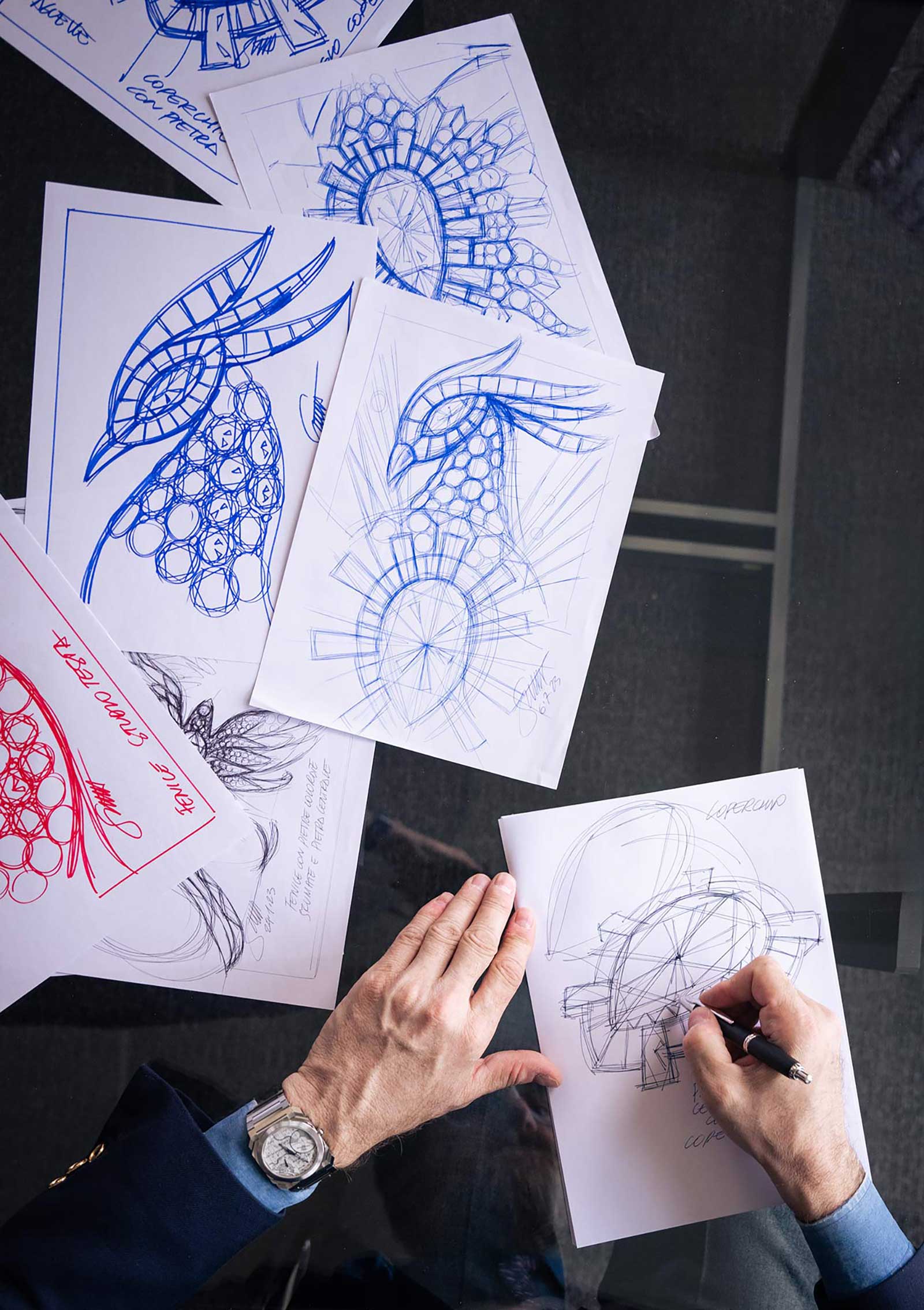 FBS: Exactly, exactly. This is my obsession. My big passion, biggest passion, is making sketches. And when I start to imagine a true piece of jewelry, it’s crazy because we start to draw with very small details. But even when you make the renderings and you have the object in your computer, and you can turn the object around, it’s not the same as when you are [holding the object]. And even for us, when we receive the watches just a few weeks before the event, the effect sometimes is wow. It’s absolutely unexpected.