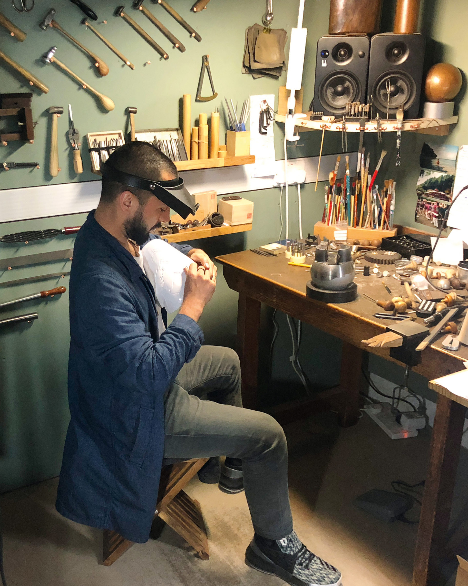 It takes one look at Castro’s smiling face and warm, welcoming energy to dispel such presumptions. He is in Vicenza, Italy, waving at me through his phone camera. Spending a few days at Scuola d’Arte e Mestieri, he and his team are meeting Italian master craftsmen, exchanging expertise on tool creation and gemstone setting. “I’m hoping it will show us new ways to move the metal and attach gemstones with the engraving,” the Filipino-British designer says, before continuing: “It also makes good for the team having new knowledge to adapt and get better every year.”
