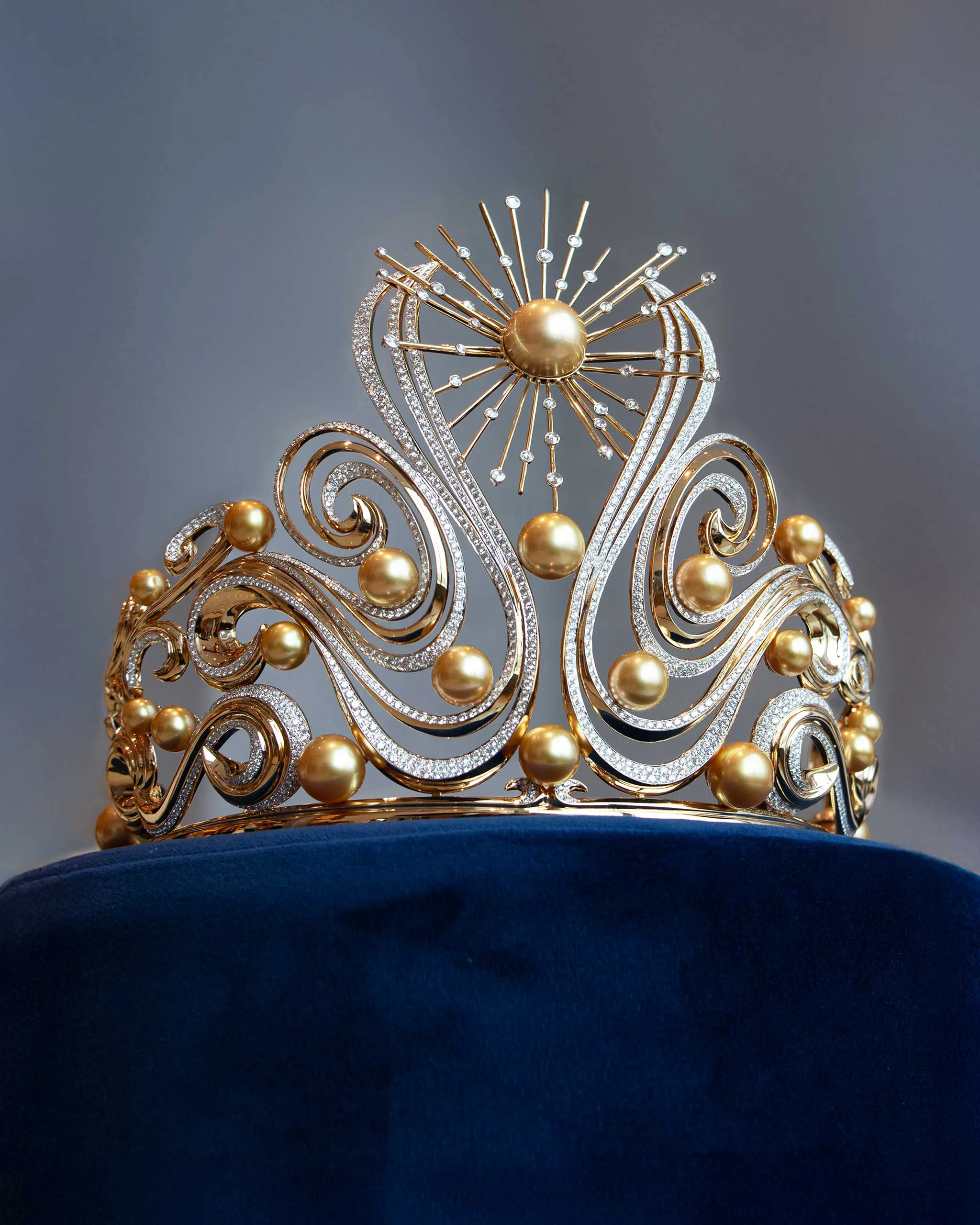 Asked about the design process, she speaks with respect. Jewelmer’s artisans drew inspiration from the elements of life, crafting an exquisite piece that centers around the golden South Sea pearl. “Without the pearl, the crown cannot exist. In essence, the pearl is life itself.” The crown embodies the four classical elements: earth, air, water, and fire. Diamond-adorned rays represent the sun’s light and fire. Sculpted tendrils of gold symbolize seafoam and wind across the waves. And the pearls themselves form the Earth’s core, bridging the ocean, universe, and infinity. The piece was meticulously handcrafted by Filipino master craftsmen trained in the traditional techniques of Place Vendôme in Paris.