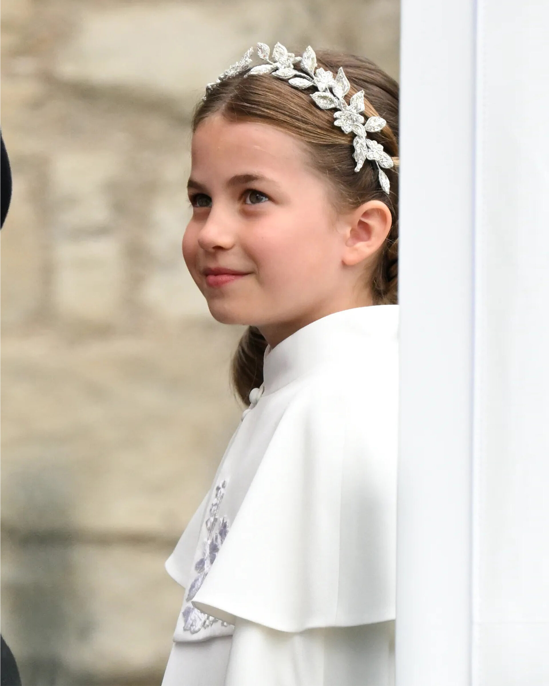 At the coronation of her grandfather, King Charles, Princess Charlotte wore a delicate silver bullion and crystal flower crown by Jess Collet and Alexander McQueen as she attended the historic ceremony at Westminster Abbey. The headpiece matched her mother, Kate Middleton, who also chose such an intricate diadem by the designer in lieu of a tiara. The eight-year-old wore a simple white sheath dress, also by McQueen, with embroidery featuring rose, thistle, daffodil, and shamrock motifs—the four flowers of the United Kingdom—to accompany the statement piece of jewelry. She stood patiently alongside her mother, who was dressed in full royal regalia.