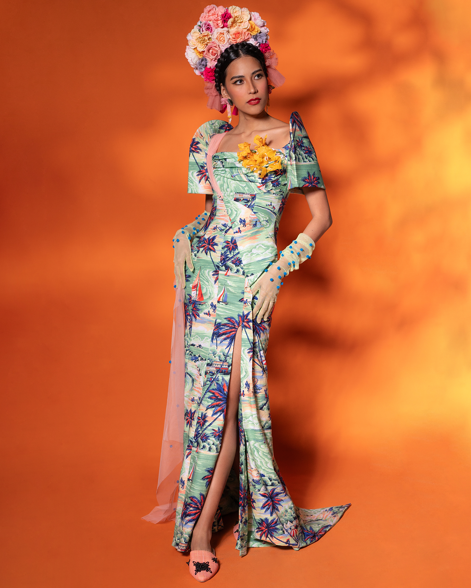His ‘Tropical Ternos’ theme, which he began doing during the pandemic, often depicts ternos in bright colors and explosive florals. He continued the vibrant aesthetic in his Paskong Ternocon collection.