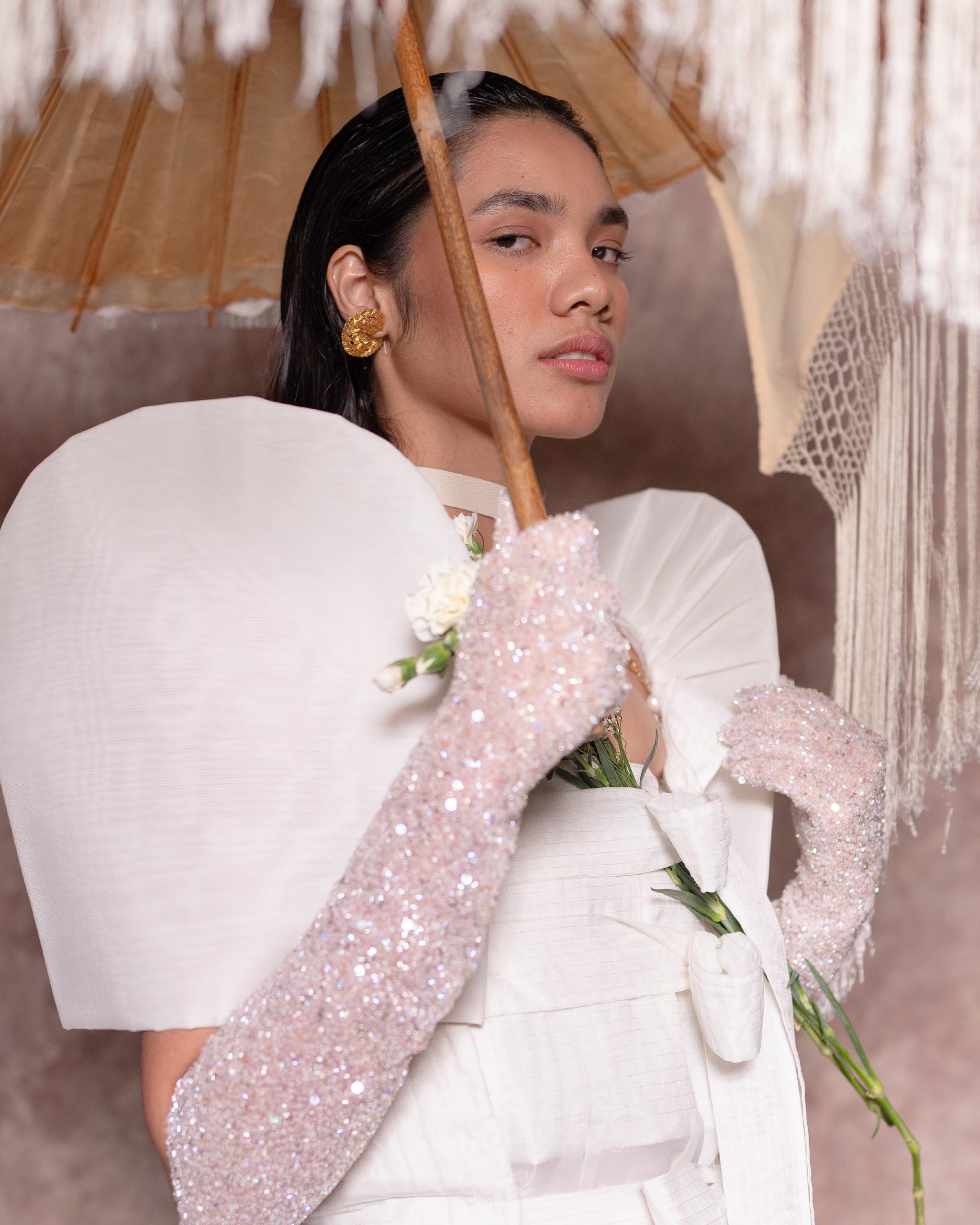 Samson’s collection emphasized bookleaf layers, or what is also called ‘flattened accordion pleats,’ which uses a handmade method. “Each piece of clothing is ironed to achieve that effect,” he told Vogue Philippines exclusively. “It’s not machine-pressed and takes a significant amount of time to do.”