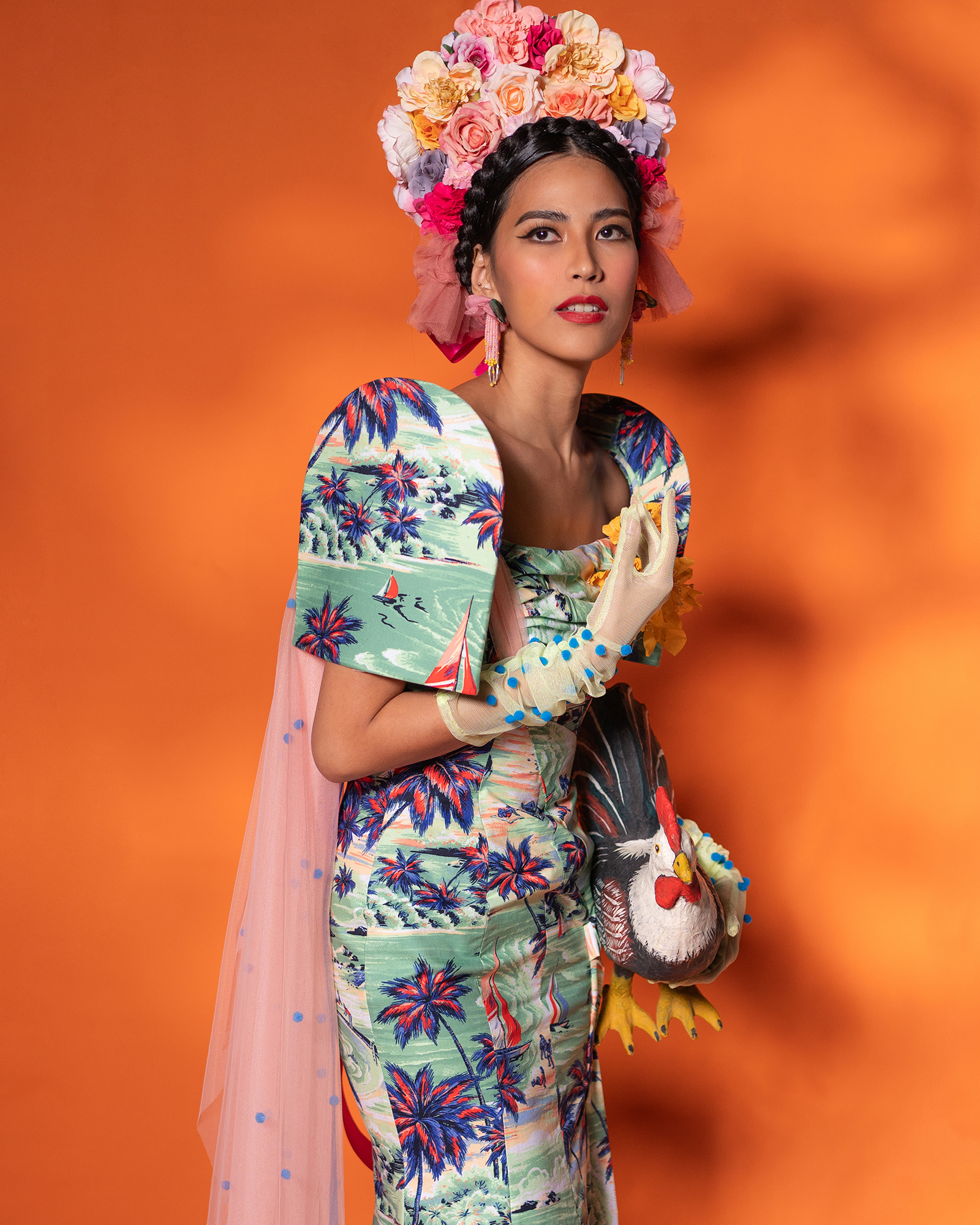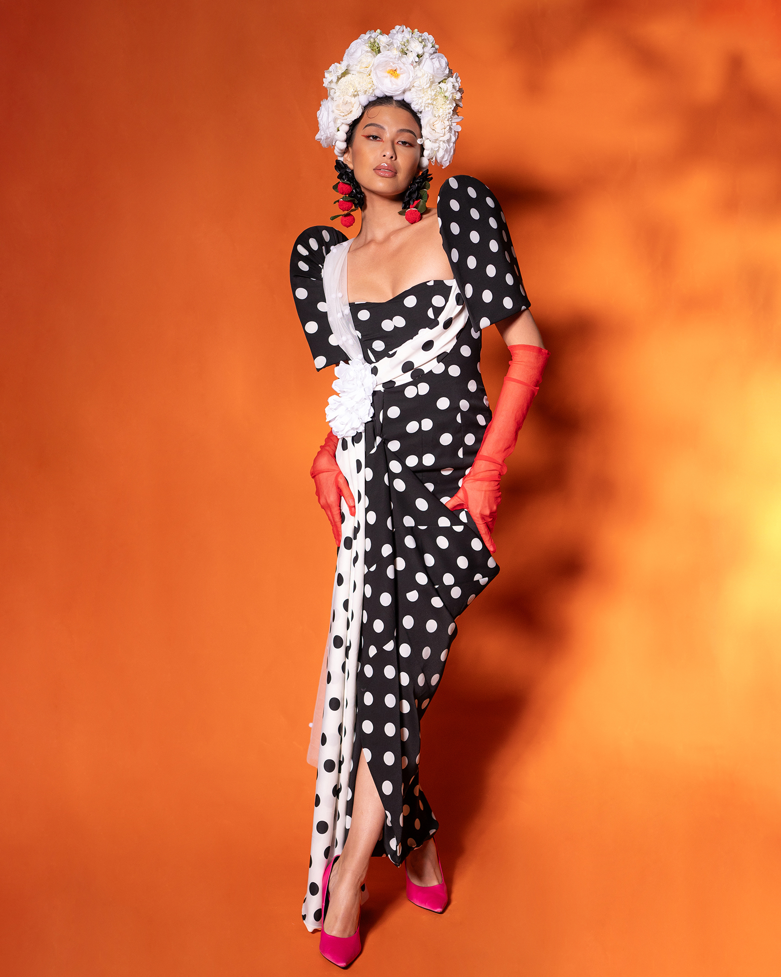 According to Mobo, the collection’s core was more about “the vibes than the physical clothing. I created the feel, the mood, the ideas, and somehow, the kitsch. I just basically put all the elements together to create a coherent and defined look.” Surface textures, florals, polka dots and printed fabrics expressed a zest for life. Tulle, georgette and jacquard were plentiful, as were layering, prints and colors. “My textiles are composed of materials that are bold, in a fun and festive Filipino way.”