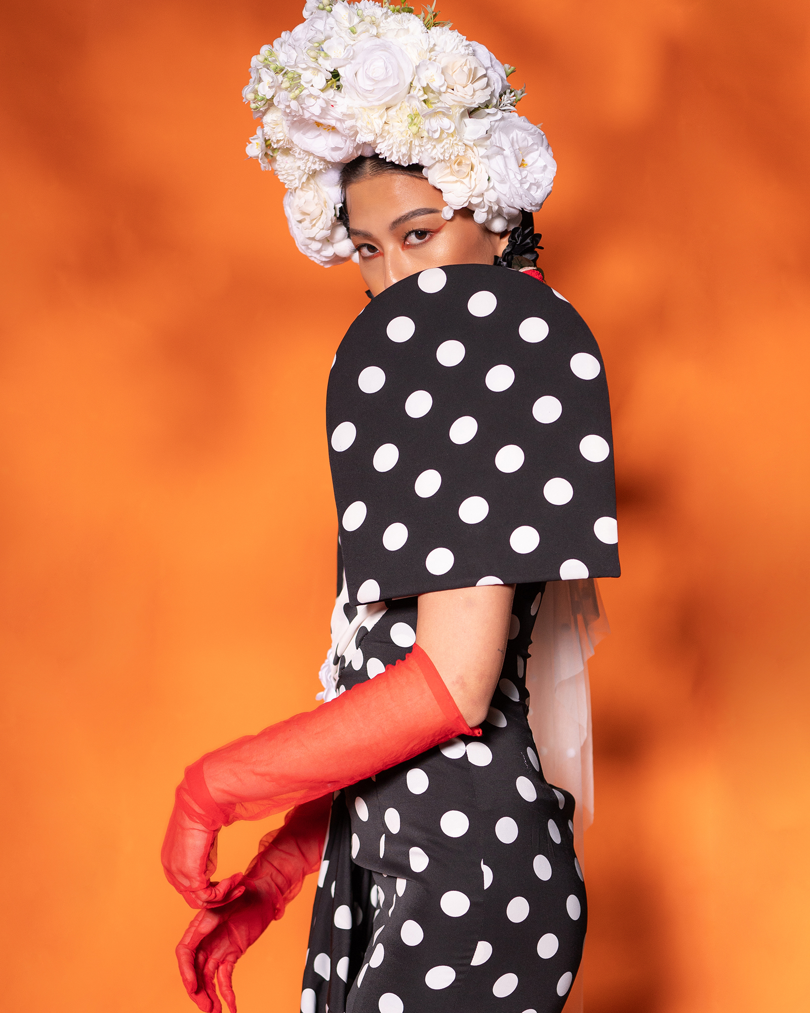 The models were often clad in headdresses and sashes, as if to state pageantry, in an obvious showing of femininity, grace and charm. Ribbons, pompoms and even fans made out of gigantic fuchsia flowers were seen, as were bright mesh gloves, to complete the looks.