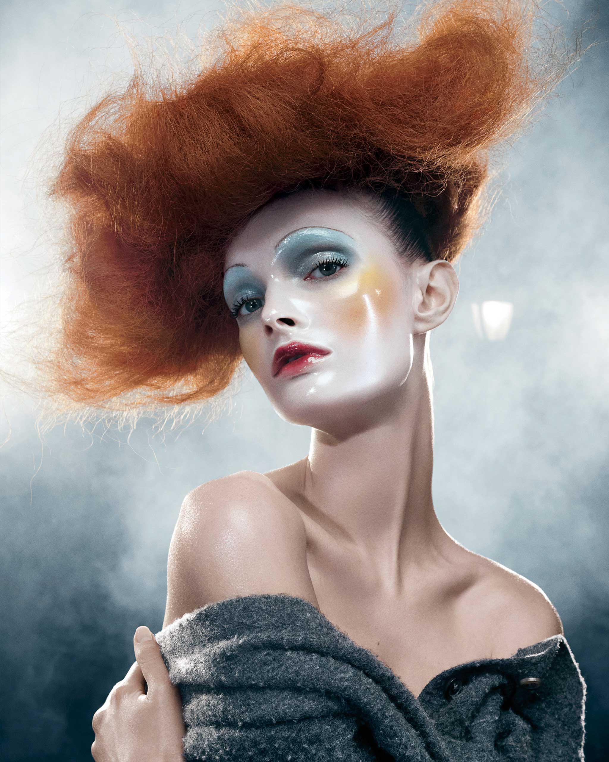 imagined when she saw the vintage porcelain doll that John Galliano brought to her for beauty inspiration. After nearly 20 days of testing, McGrath’s team flew to the Margiela offices to offer a first look at her new glass-skin technique and received a standing ovation. How the optical illusion—modeled here by Lulu Tenney—was achieved: On top of bleached brows and sheer pastel pigments, McGrath misted seven or eight coats of a concoction composed of various peel-off masks and water through an airbrush machine. (Including drying time between layers, each model took around 30 minutes in the makeup chair.) “It’s almost like a shield—a force field of glass and light around you,” says McGrath. “It really looks like another world.”