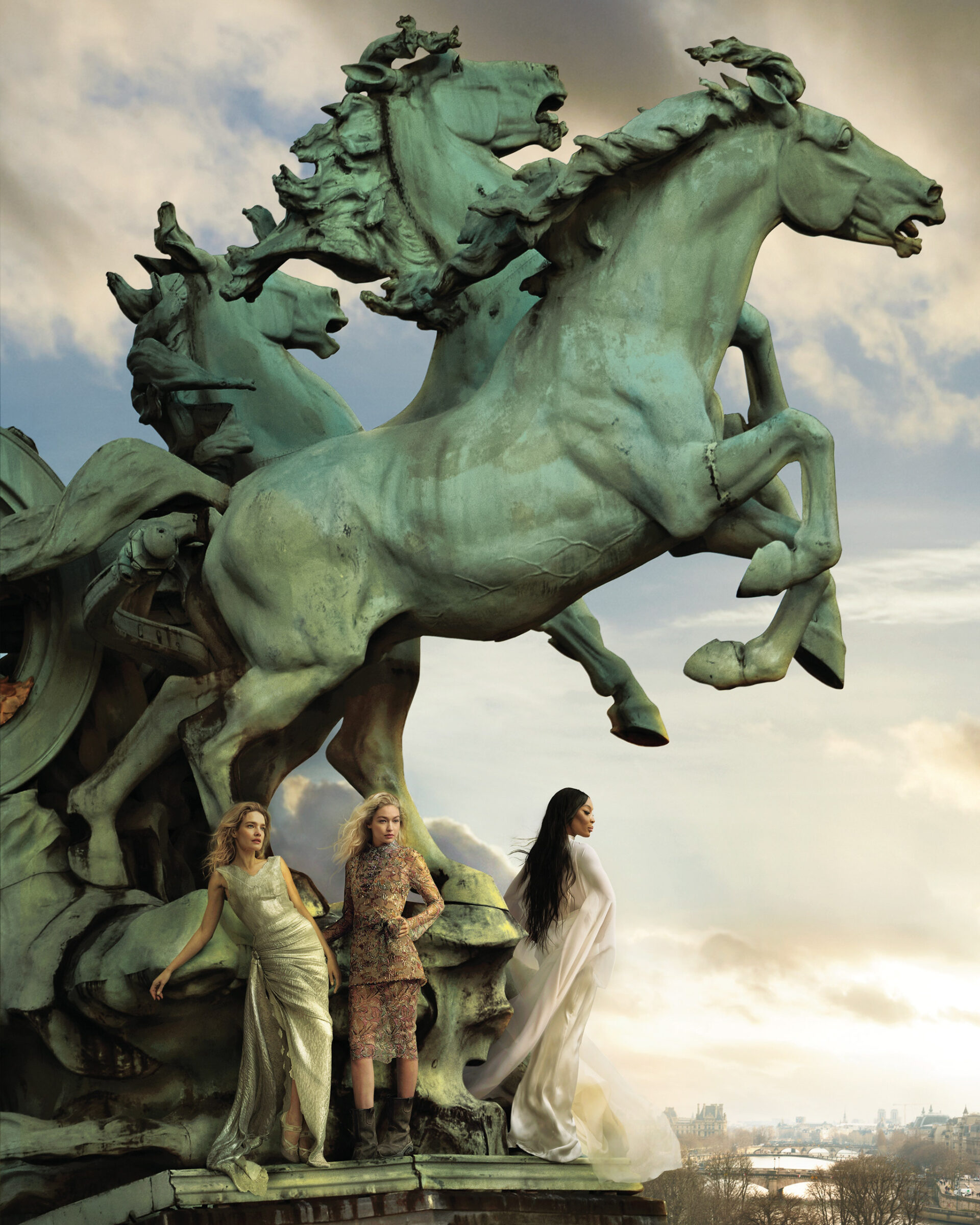 Background image, on rooftop: Natalia Vodianova, Gigi Hadid, and Naomi Campbell in Paris. Vodianova and Campbell both wear Fendi couture; Hadid wears a Chanel haute couture tunic, blouse, and skirt.