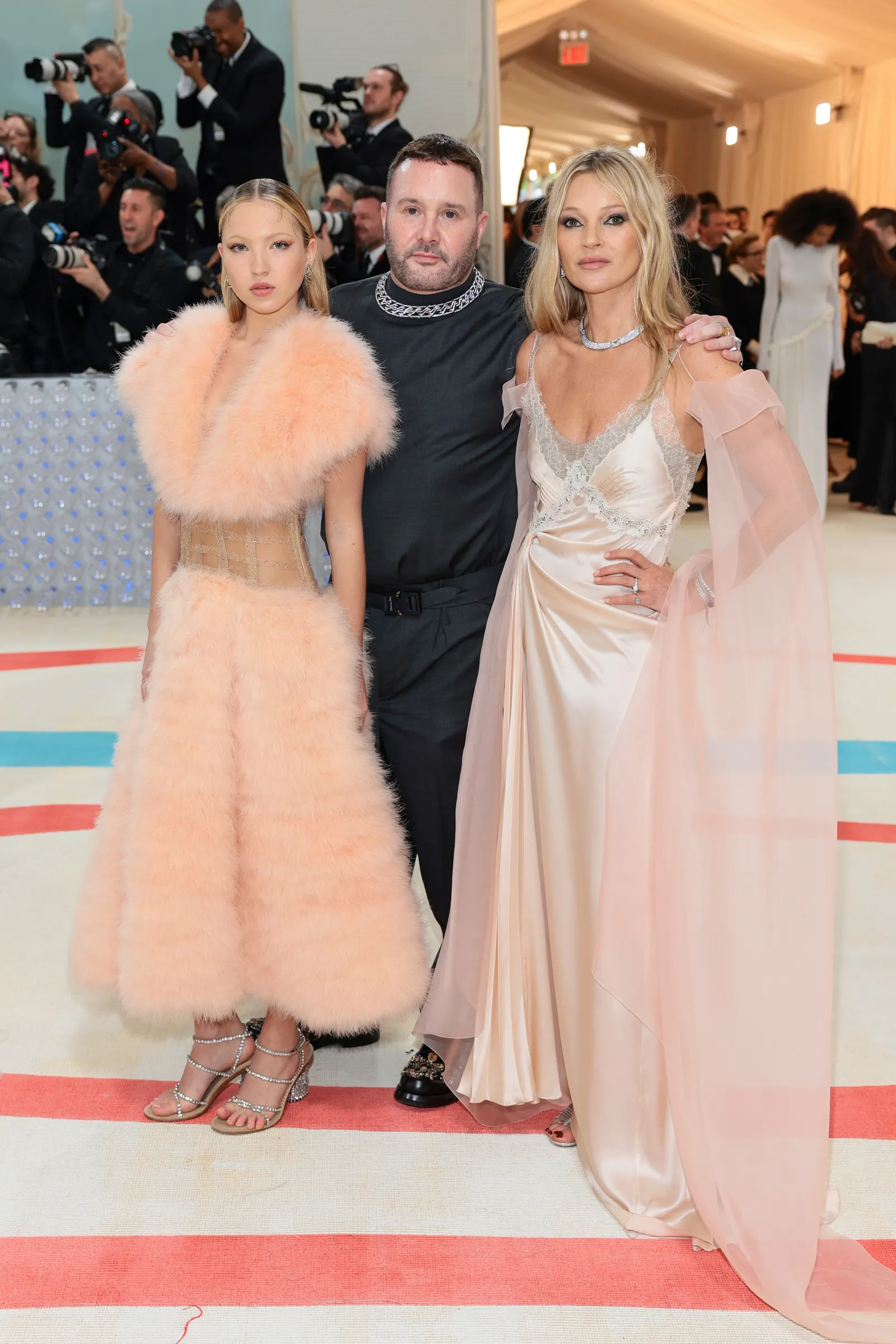 The supermodel and her daughter, model Lila Moss, share a mother-daughter moment on the red carpet wearing Fendi couture by Kim Jones, referencing Karl’s love of pastel hues and many a fur creation during his 50-year tenure at the fashion house.