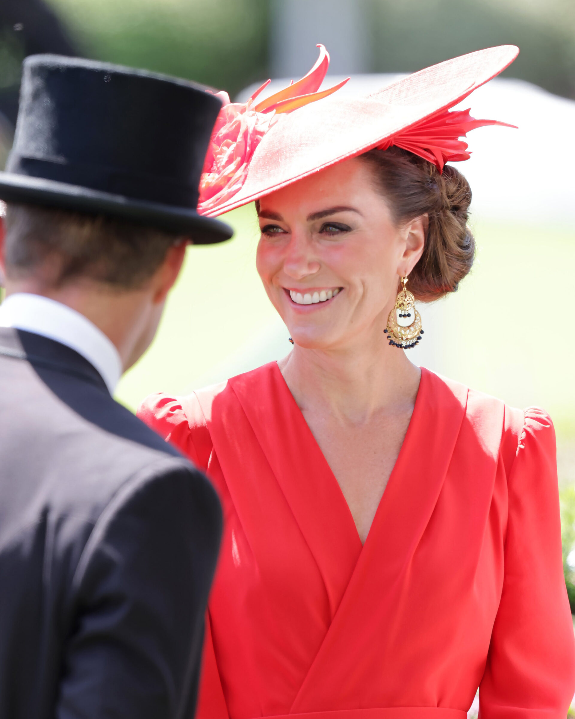 For an appearance at Royal Ascot on Friday, though, Kate opted for a more affordable jewelry choice, in the form of Sézane’s Esmee earrings, a gold filgree design featuring black beads. The royal paired the accessory with a scarlet dress by Alexander McQueen and hat by Philip Treacy (both go-to designers for the Princess), along with a matching clutch by Hermès and Jennifer Chamandi pumps.