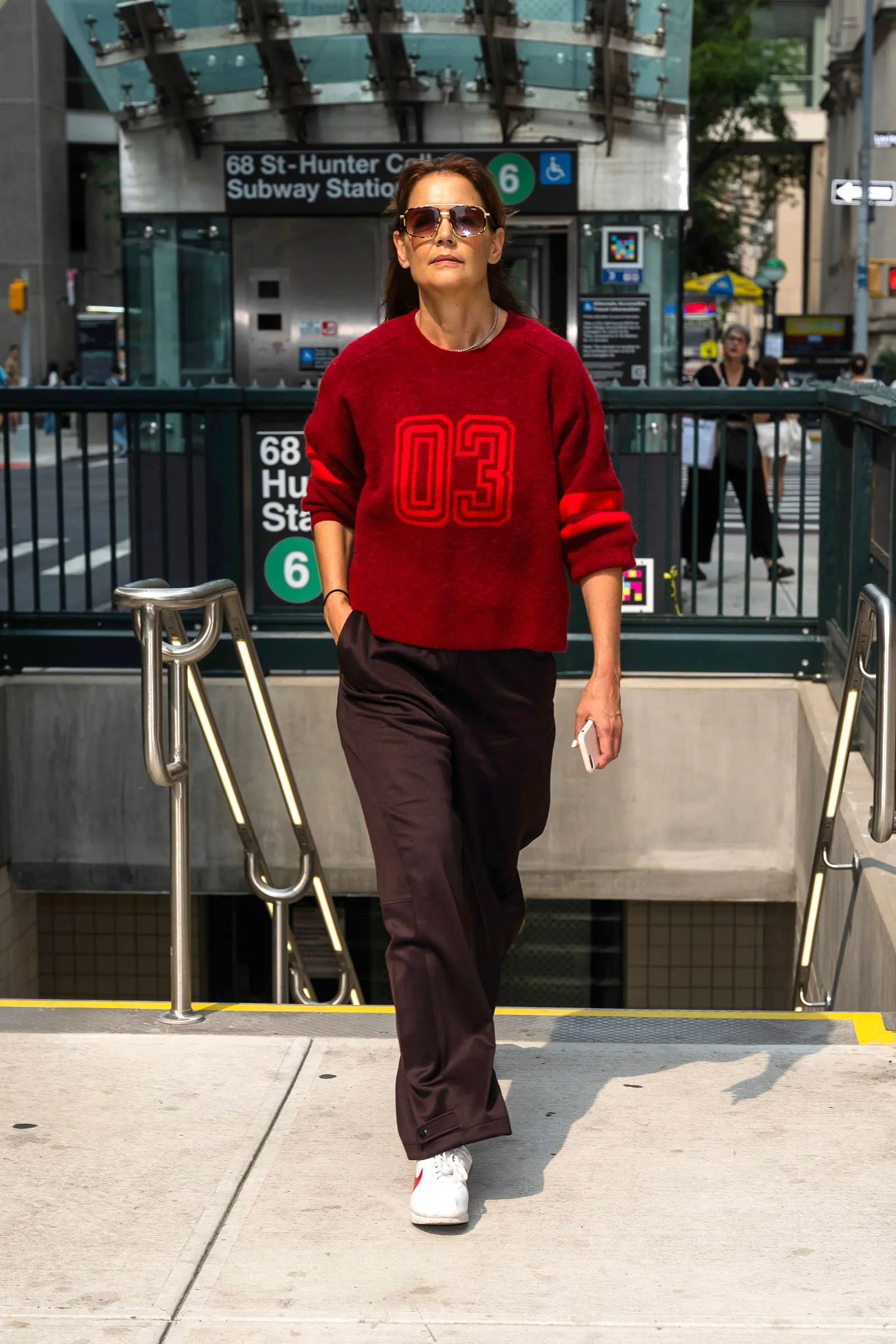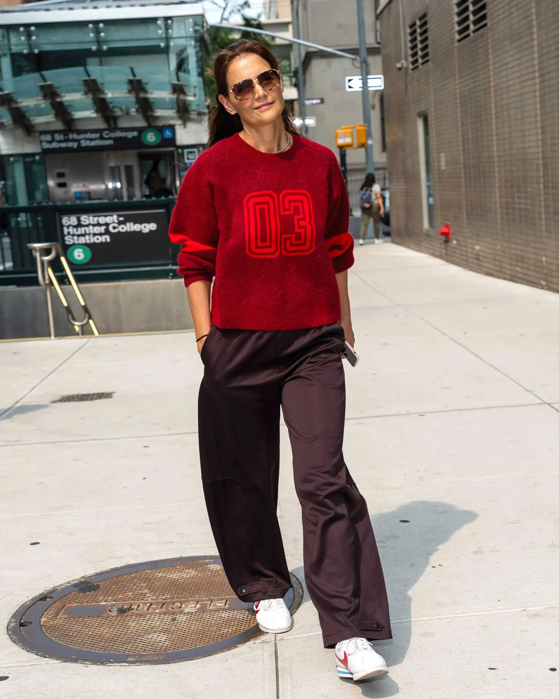 Snapped—where else?—but on the streets of New York, Holmes wore a simple red knit with a graphic number emblazoned across the chest from Hush, with brown flared pants, and aviator sunglasses. On her feet, a pair of Nike Cortez sneakers. Cozy, comfortable, sporty, chic—the pinnacle of relaxed downtown style.