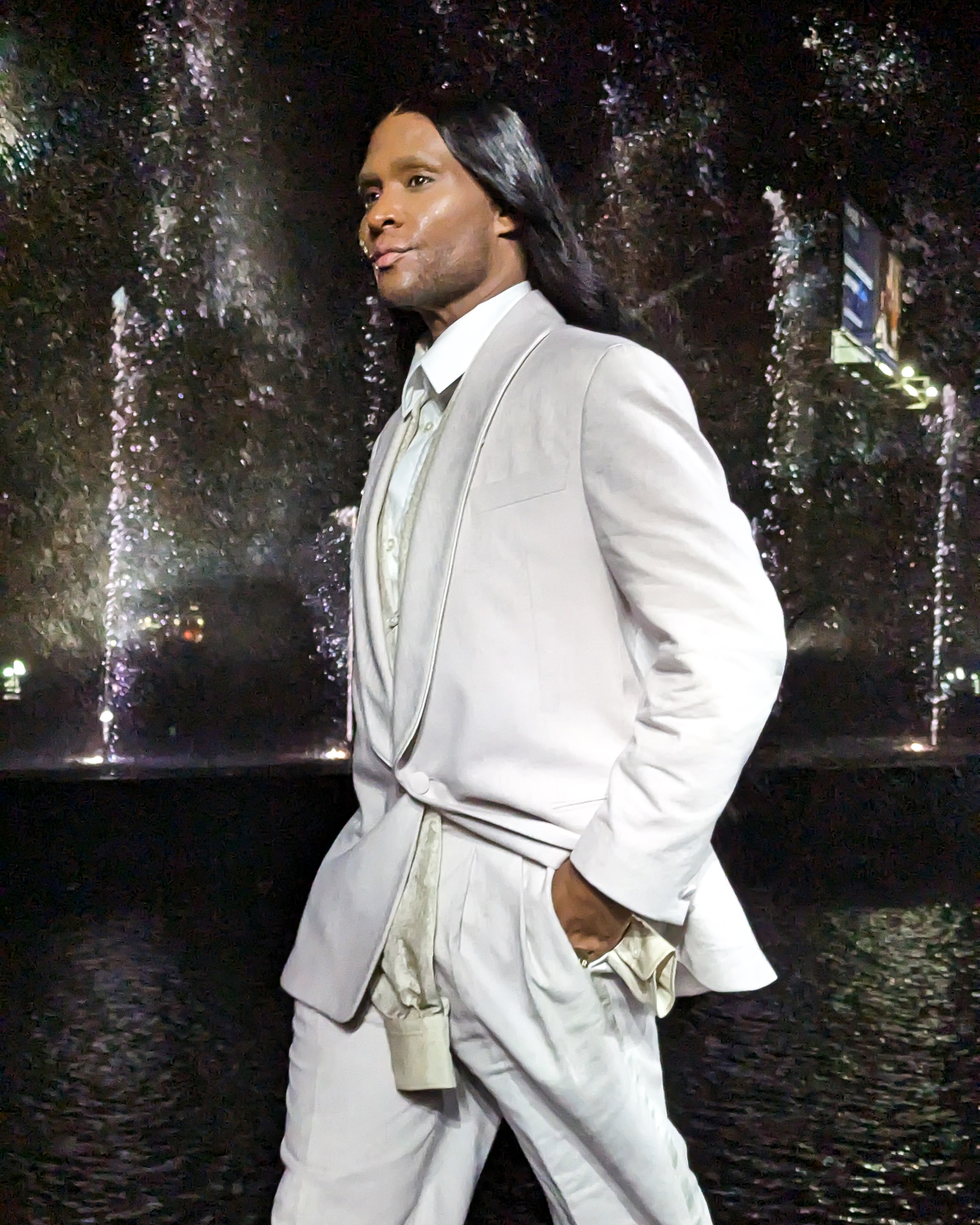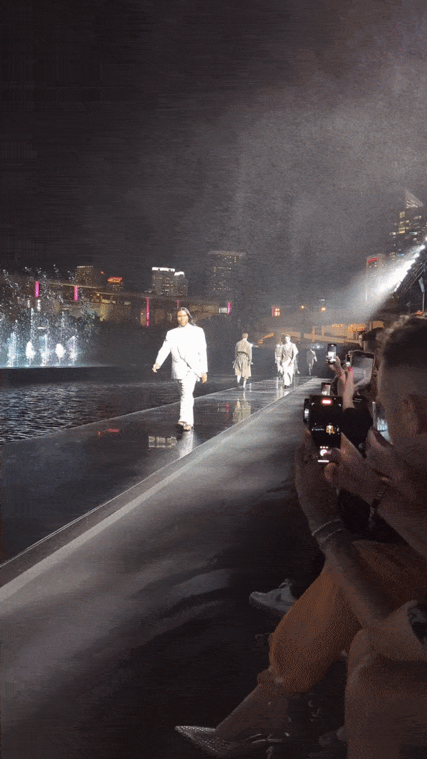 Immediately after what would prove to be an absolutely nuts show—Law shared the runway with models including Pamela Anderson, DJ Khaled, Naomi Campbell, Khaby Lame, and Precious Lee, all of whom were thoroughly drenched by the killer combination of a fountain backdrop and high winds—we caught up with him backstage. So how did it go? Roach said: “For my first time walking to be in a production as big as this was incredible. I have so much more respect for the models: to be able to walk in these elements, in those puddles… In my mind I was saying, “Think Naomi. Think Naomi. Think Naomi!” And I think the spirit of Naomi and her being here really pulled through. So it was fine! That water was aggressive, but I think it was beautiful.” If you can walk the show Boss challenged its models to this evening, then there aren’t many runways you can’t master: Law Roach’s next chapter has begun.