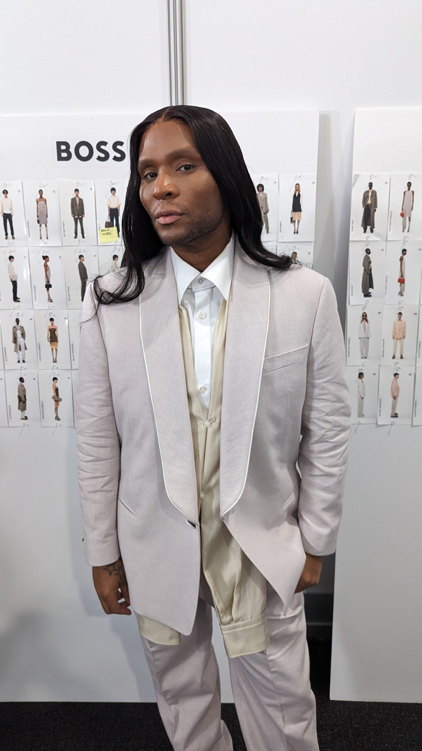 “I’m trying to figure it all out, you know? This just happened yesterday. I’m soul searching and I’m speaking to people that I trust, like Edward [Enninful], and I just have to figure it out. But I’m so excited that today I get to release. The Boss team has been really supportive of me: sensitive and kind. I really appreciate that and it makes me want to do the best job on the runway that I possibly can do.”