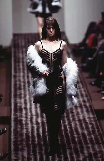 Or is there a third way? Last December 9, the actor stopped by Jimmy Fallon to promote the Netflix TV show, opting to wear a black slip dress with sheer nude and striped panelling, picked from the Fendi fall 1997 collection, then designed by Karl Lagerfeld. Look 80 from the show, it was a season focused on dark and gothic, clingy gowns juxtaposed with sumptuous fuzzy textures, leathers, and velvets. Collins opted to style it faithfully to the runway look, though she swapped out the white furry stole for a feathery black jacket and patent knee-high black leather boots, adding a bright red Fendi baguette bag as a little pop of color.