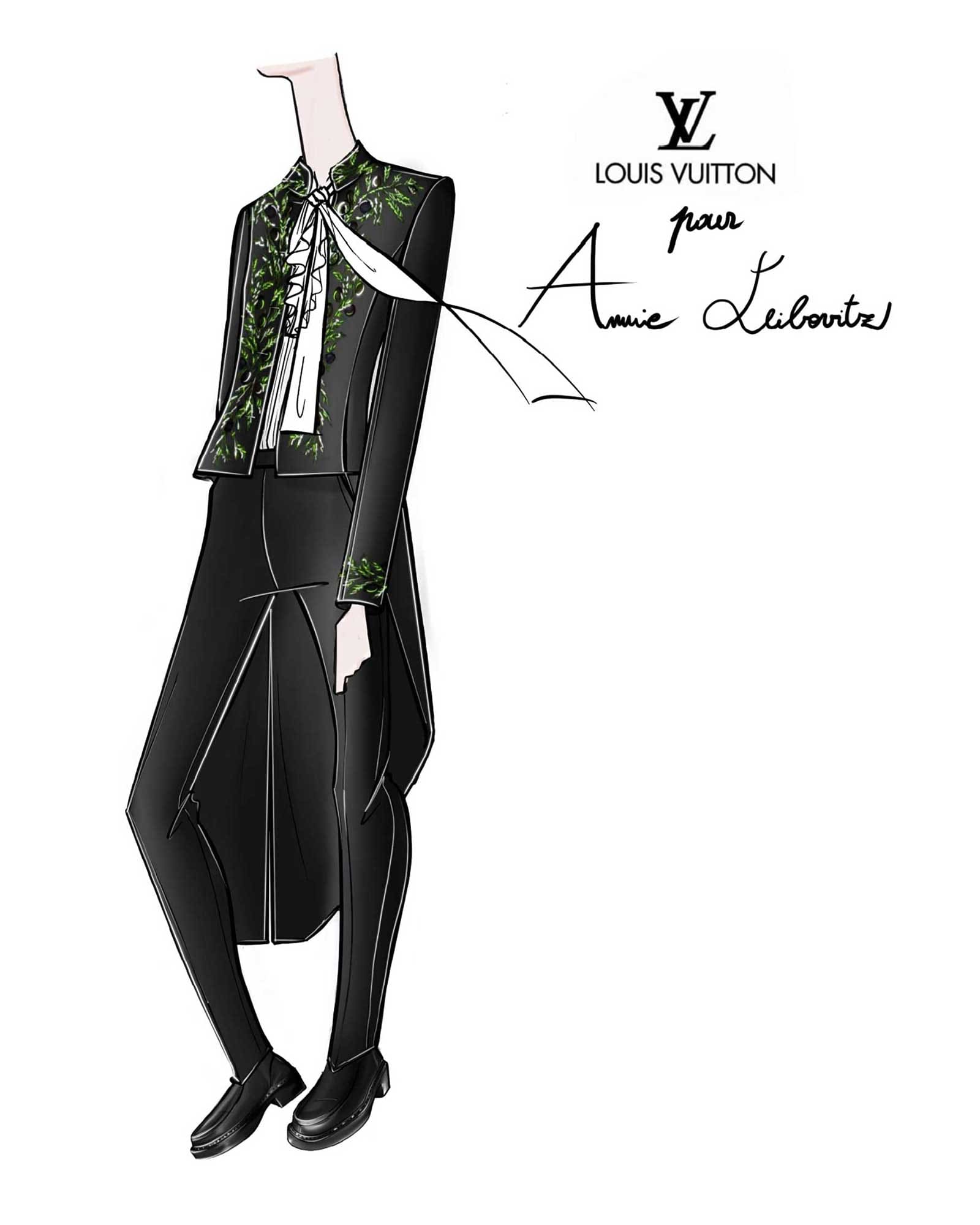 Acclaimed portraitist Annie Leibovitz will be admitted to the Académie des Beaux-Arts in Paris on March 20, with her academician’s sword to be presented by Anna Wintour during the ceremony. Louis Vuitton has the honor of dressing her for the occasion, marking their years of collaboration. Nicolas Ghesquière reimagines the habit vert for Leibovitz with the stylings of his Louis XVI collection for spring 2018; olive leaves decorate the edges of a frock coat, from the collar down the front and at the cuffs, with all the embroidery done entirely by hand.