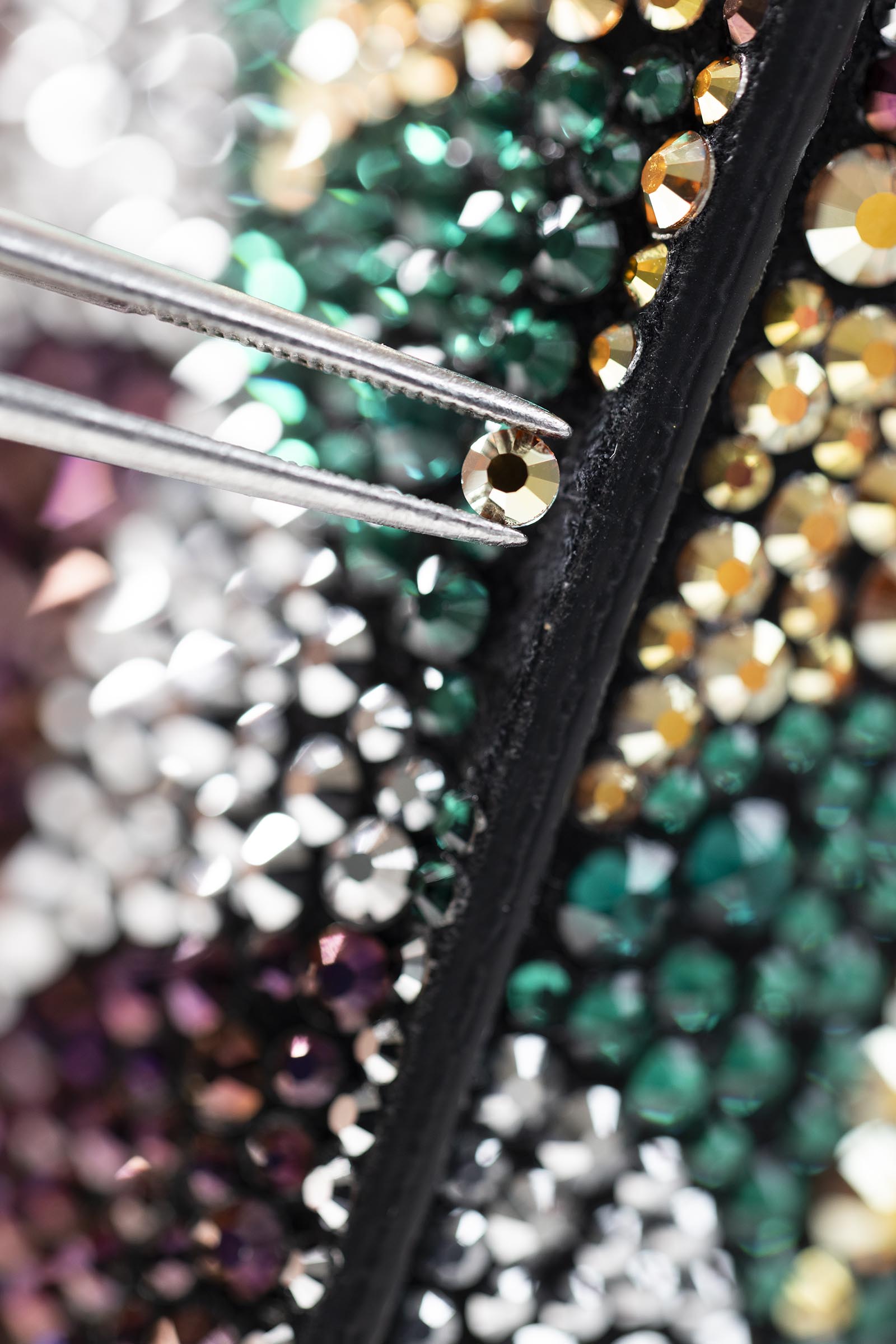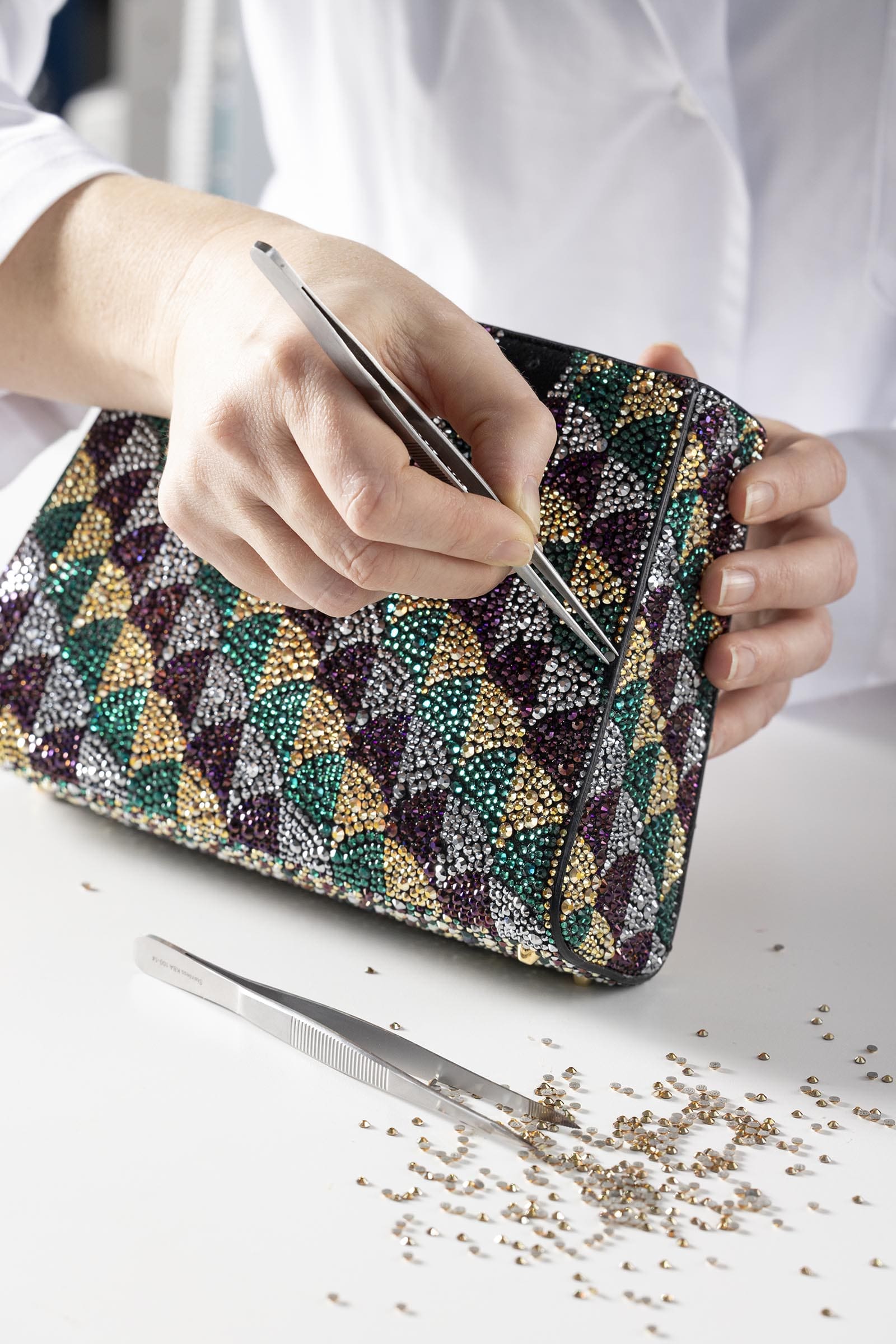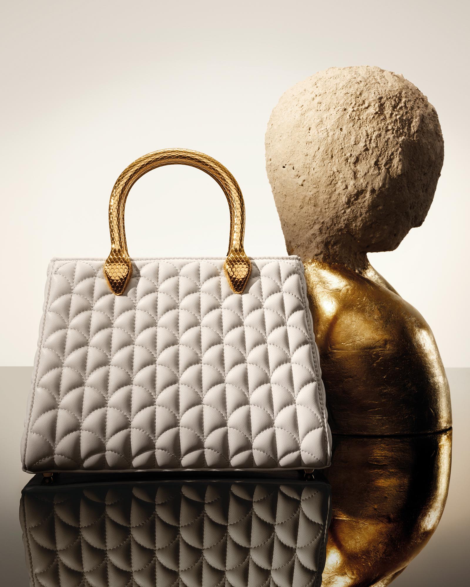 As a Maison revered for its expositions into haute joaillerie, the pieces intrinsically marry function with adornment. The “Serpenti Duo,” for instance, glitters with hand-set pave crystals in a design echoing the Roman mosaics. In the “Calla” evening clutch, that pattern is then expressed in openwork gold metal, giving it a “gem-like preciousness.”