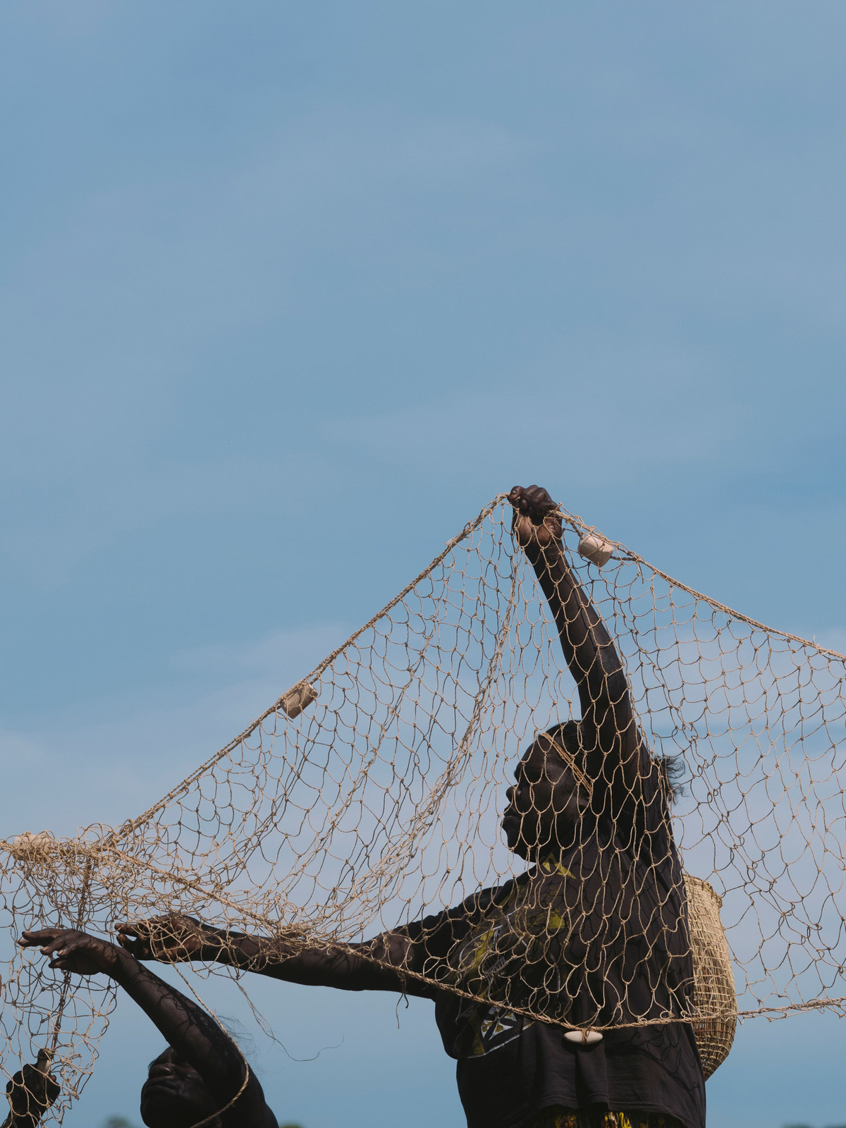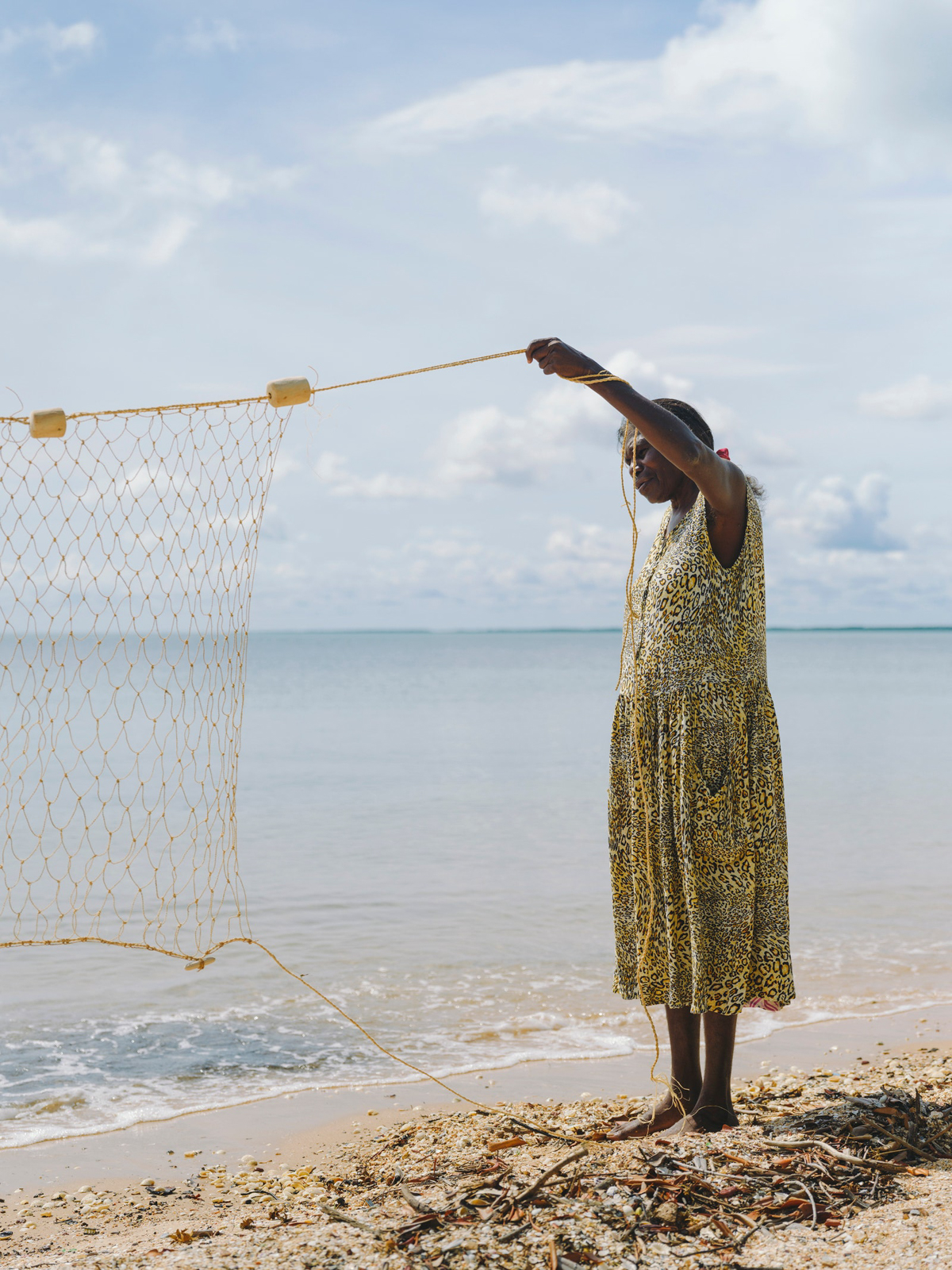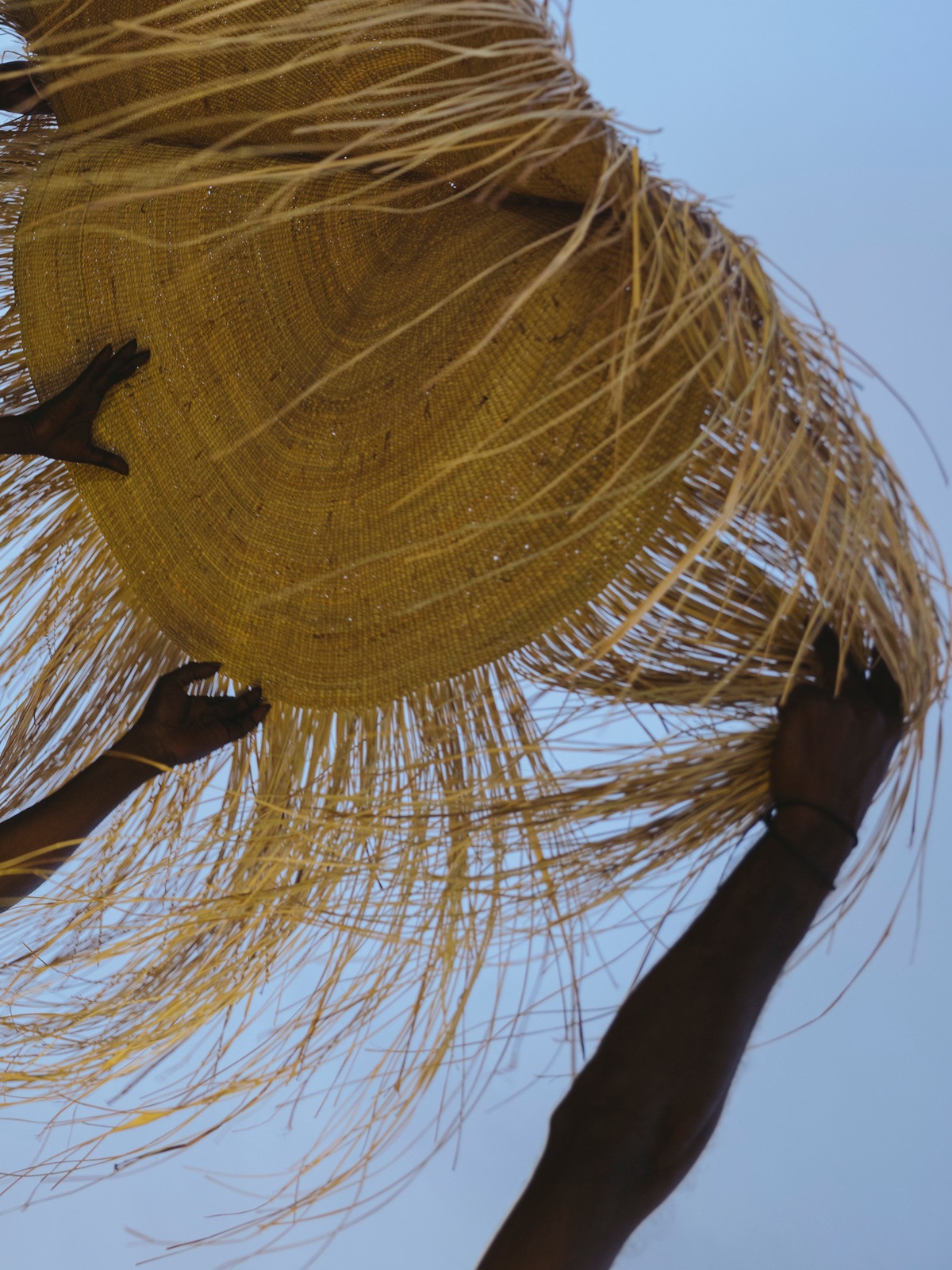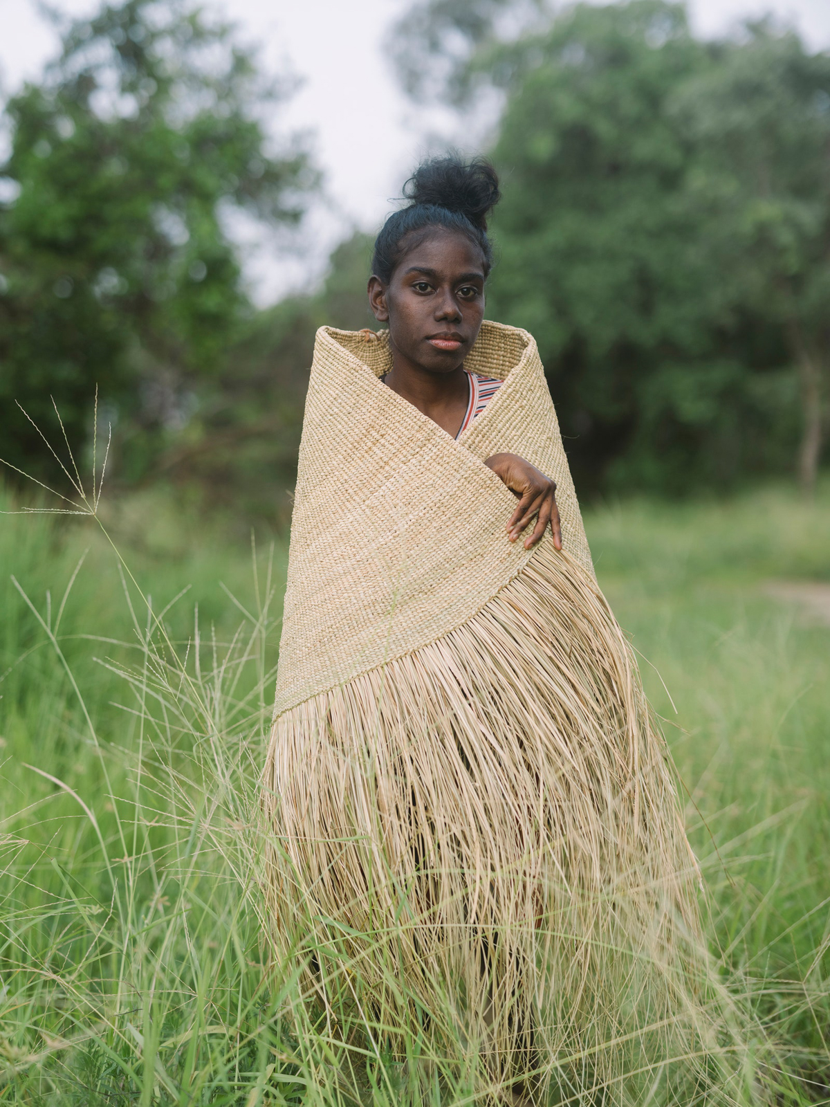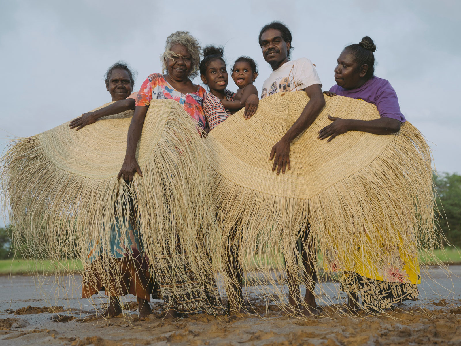 Working in fashion, an industry completely obsessed with the concept of sustainability and conscious consumption yet seemingly unable to realize them meaningfully, the Bamugora could serve as the gold standard. It is as utilitarian and functional as it is ceremonial and decorative. It is portable, looking at old pictures at Djalkiri, and as Susan explains, it was used by both men and women (although only women can make them), carried around as coverings, as a surface to prepare food, used as shelter, and babies could safely sleep under its protection. The Bamugora, it is said, protects and acts as a repellent to snakes, ants and dangerous animals; they instinctively stay away. It’s so incredibly beautiful seeing it unfolded, with its fringe spread out, like the sun, moving as if alive. It’s not hard to see why gallerists want to rush to display such a thing, but here, wrapped around Susan, Valda, and Roselyn Gamalaŋga, her daughters, and Charlene Madikaniwuy, her granddaughter and Valda’s daughter—three generations of women—it is alive with its true intended meaning and purpose. Susan spoke of weaving being “forever.” I asked her what “forever” meant, and she said: “Forever means all the kids can learn. The future comes from a long time ago passed to a new generation. The past becomes our future. Me, I am talking for generations. All the kids, all the men, all the women—they can learn their culture.”