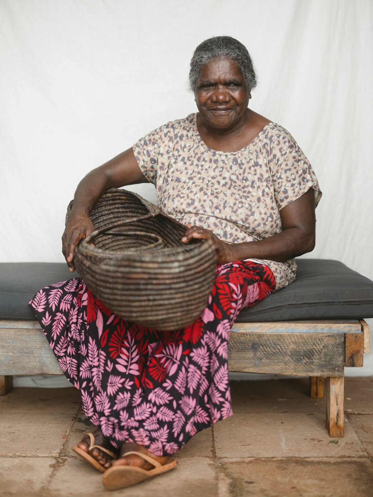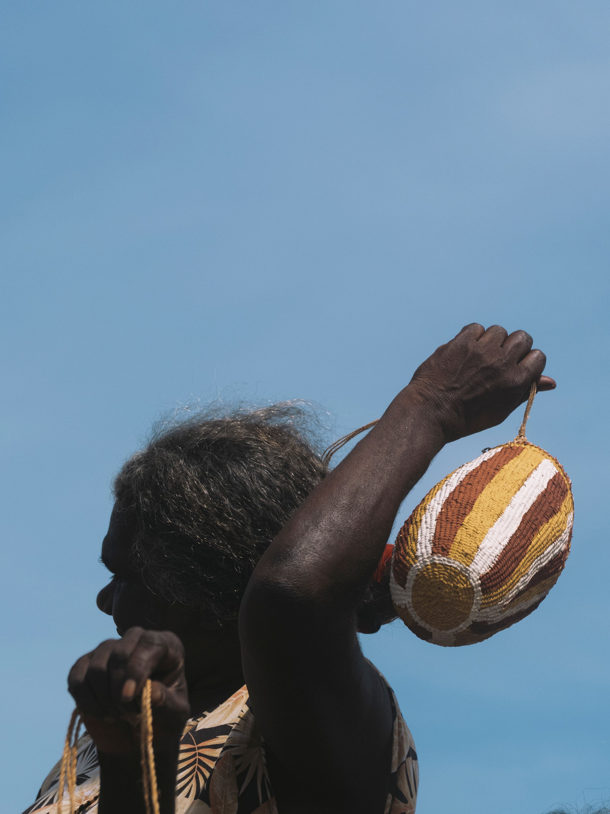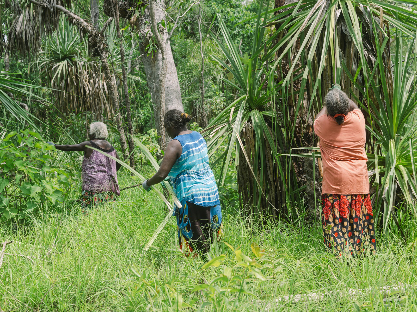 The fashion editor in me quite literally gasped (quietly, thankfully) when I walked onto the scene where we met the ladies at the heart and soul of this story, some of them having come in from Laŋarra (Howard Island). It was a picture that looked like it had jumped off the reference board for one of those old Marni resort collections (Consuelo Castiglioni, not Francesco Risso), the kind of print-on-print which even hardened fashion goths like me wanted to run out and buy and pair with an artisanal woven basket. Well, as I live and breathe! Before my eyes the IRL, technicolor, real-deal version: the grande dames of Milingimbi, the women who weave. A mix of master and emerging weavers—the single fiber practice is a 360 degree one set to the rhythm of harvesting, preparing, dying and weaving gunga (Pandanus Spiralis). Whether everyday or ceremonial pieces weaving connects each artist to her ancestors and is imbued with ancestral wisdom which then takes form through each weavers distinct signature. Each bag, basket, piece of jewelry has an artful artisanal feeling only possible when something is truly of the hand. Really this craft cannot be spoken of truly by an outsider, just described, to that point Susan Balbuŋa Warrawarra, a cultural leader and master weaver, tells me: “Weaving is law. Weaving is culture. Weaving is forever, forever, forever.”
