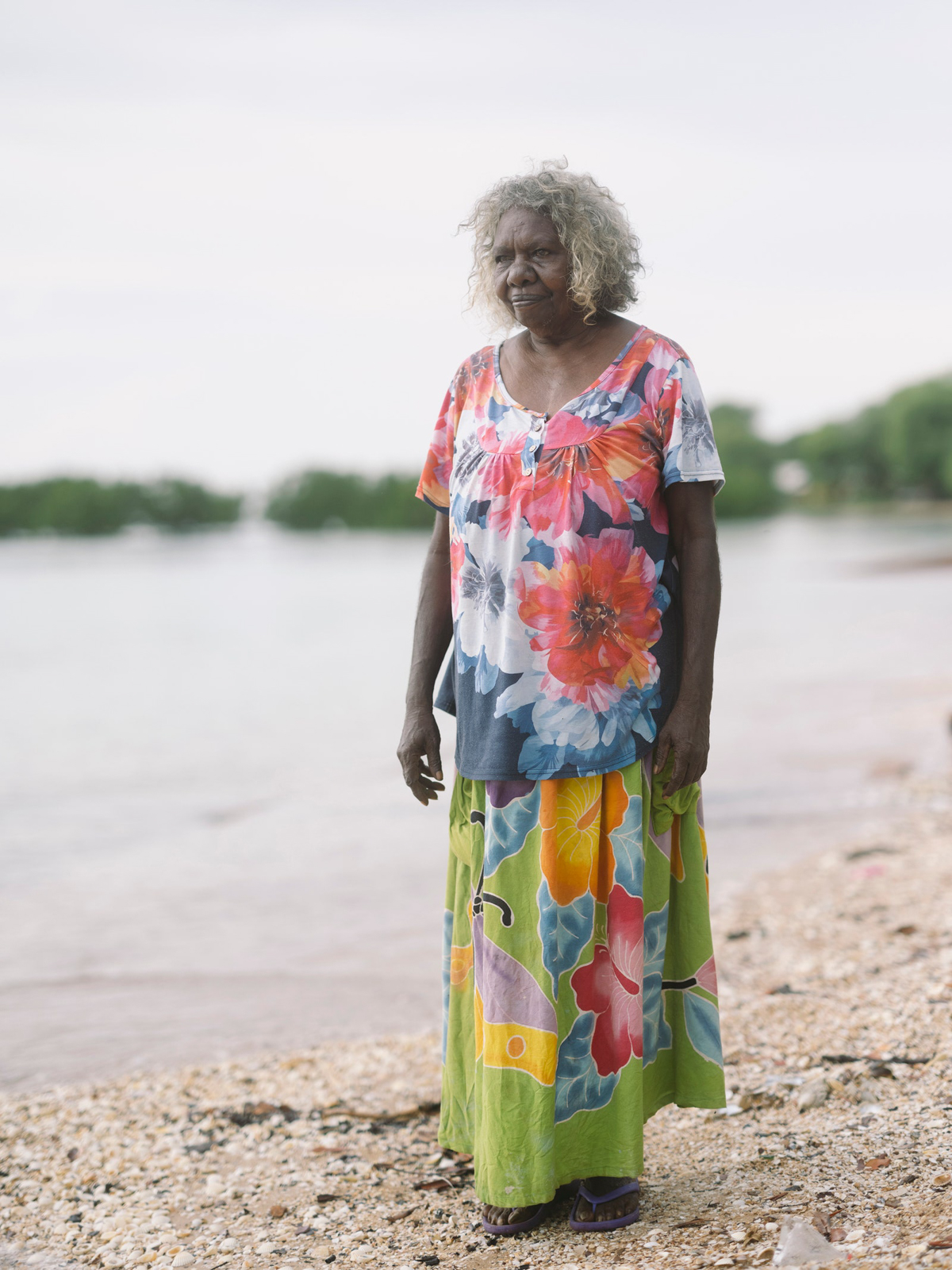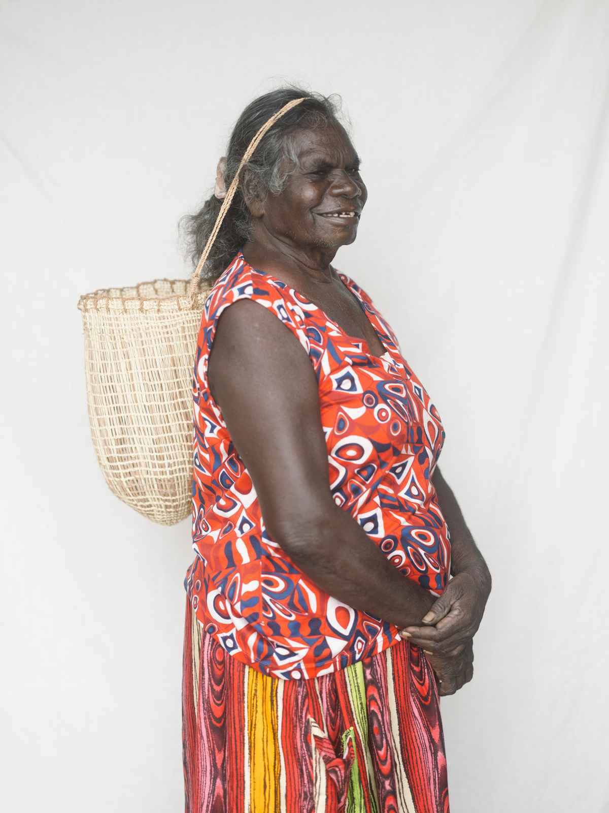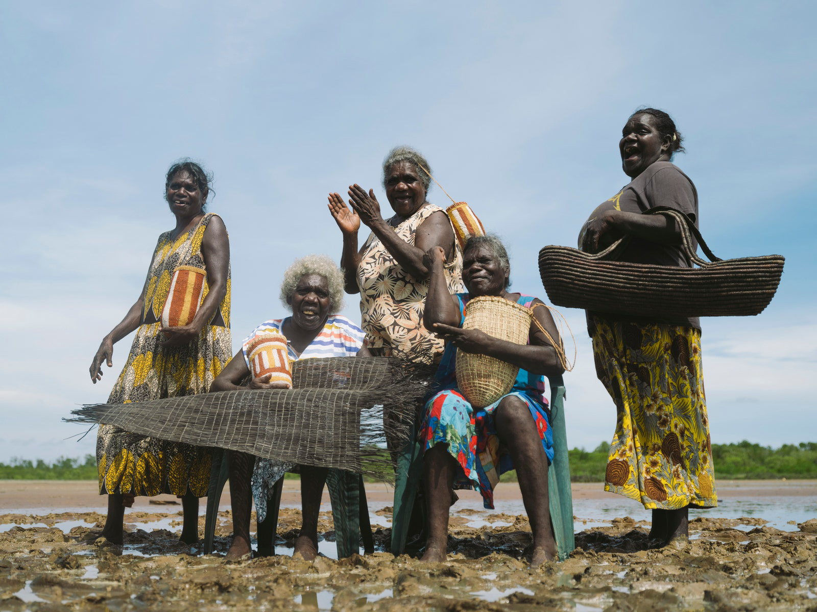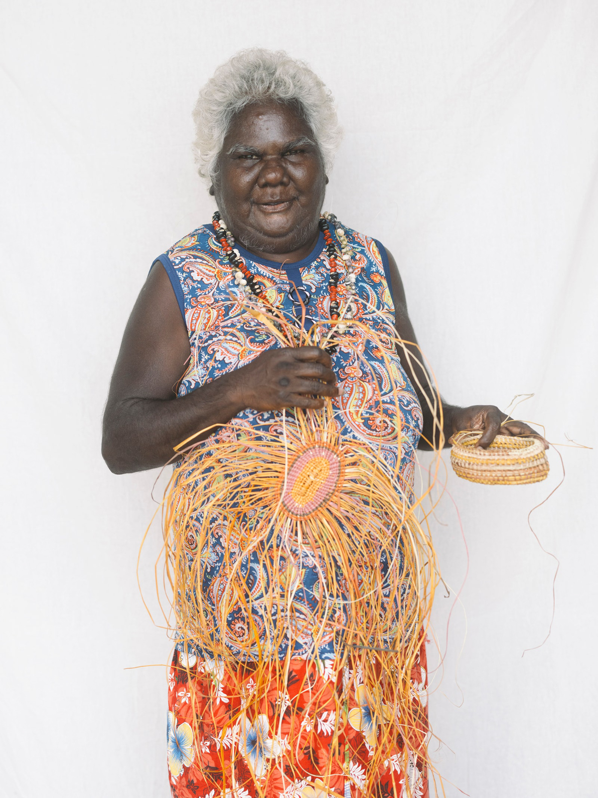 The fashion editor in me quite literally gasped (quietly, thankfully) when I walked onto the scene where we met the ladies at the heart and soul of this story, some of them having come in from Laŋarra (Howard Island). It was a picture that looked like it had jumped off the reference board for one of those old Marni resort collections (Consuelo Castiglioni, not Francesco Risso), the kind of print-on-print which even hardened fashion goths like me wanted to run out and buy and pair with an artisanal woven basket. Well, as I live and breathe! Before my eyes the IRL, technicolor, real-deal version: the grande dames of Milingimbi, the women who weave. A mix of master and emerging weavers—the single fiber practice is a 360 degree one set to the rhythm of harvesting, preparing, dying and weaving gunga (Pandanus Spiralis). Whether everyday or ceremonial pieces weaving connects each artist to her ancestors and is imbued with ancestral wisdom which then takes form through each weavers distinct signature. Each bag, basket, piece of jewelry has an artful artisanal feeling only possible when something is truly of the hand. Really this craft cannot be spoken of truly by an outsider, just described, to that point Susan Balbuŋa Warrawarra, a cultural leader and master weaver, tells me: “Weaving is law. Weaving is culture. Weaving is forever, forever, forever.”