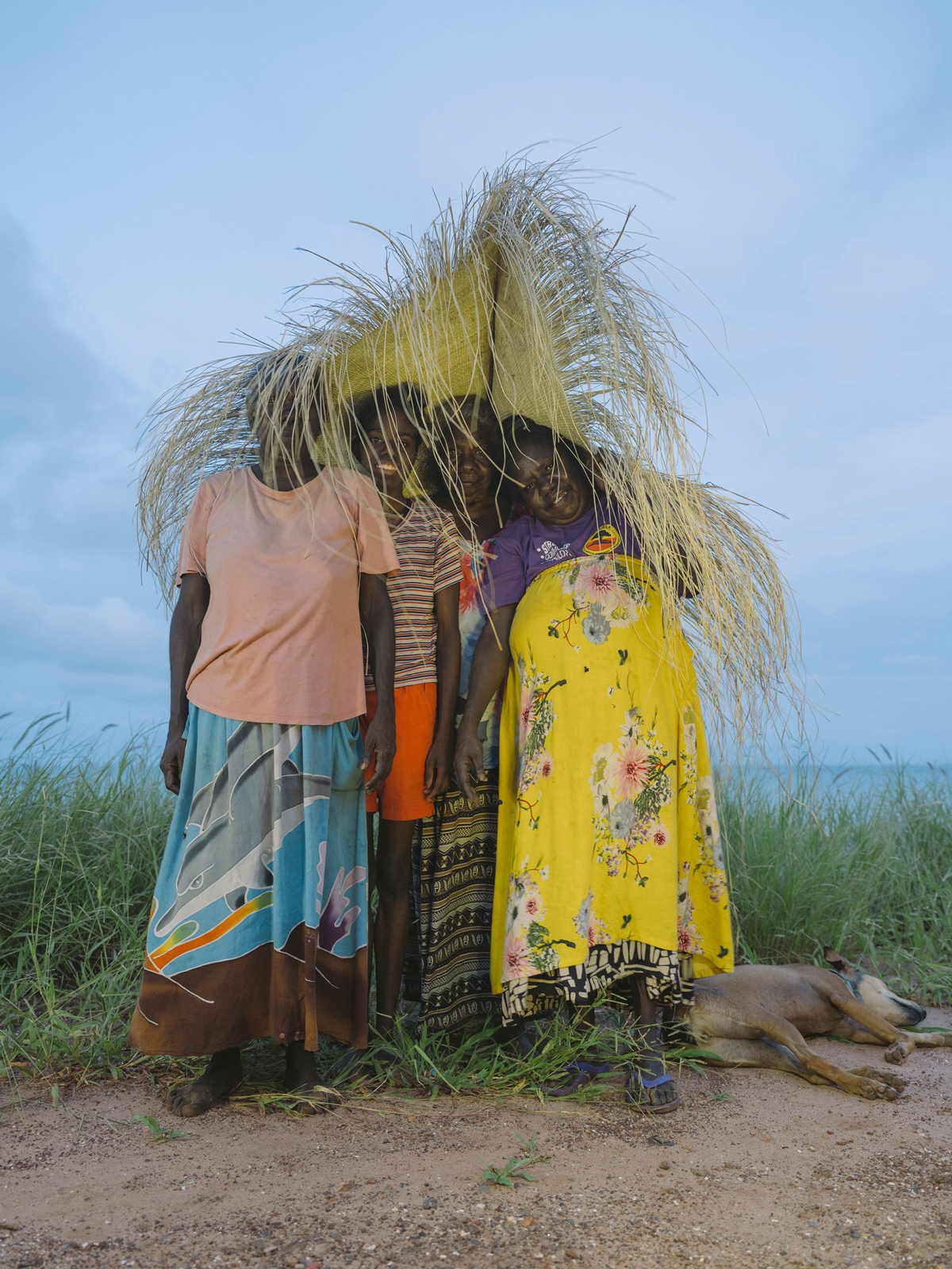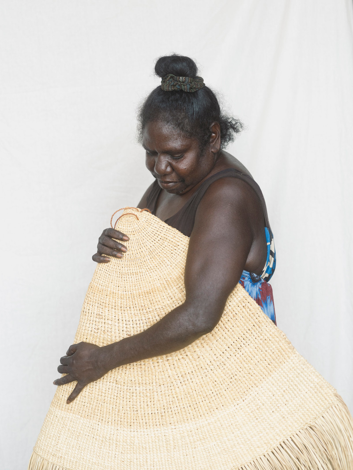 Ruth Ŋalmakara, Helen Milminydjarrk, Susan Balbuŋa, Mandy Batjula Gaykamaŋu, Margaret Rarru Garrawurra, Helen Ganalmirriwuy Garrawurra, Margaret Gamuti, Sabrina Roy, Abigail Mundjala, and Margaret Balayu are the artists gathered when we arrive. The ladies are seated cross-legged or reclining on a woven polymat with red flowers on a pale yellow backdrop in the main room, or gallery, of the art center. They are resplendent, dressed in various combinations and permutations of loose-fitting, printed, below-the-knee skirts paired with clashing printed tops in similar fabrics (although some favor perfectly faded T-shirts, as I recall Mandy’s Metallica tee). It’s a dress code ideal for the balmy Milingimbi conditions and perhaps, I’m told, an evolution from the introduction of printed day dresses by Mission wives in the 1930s—the craft of dressmaking and penchant for fabric was taken up with gusto by the Yolŋu women, who are innate artisans. The question of having a choice about covering up…we’ll leave for now. Layered on top and around this sea of paisleys, florals, stripes, and leopard prints are baskets in various nascent stages: pandanus fibers dyed, dried, and placed in bunches on the polymat in hues of reds, browns, and yellows; half-done striped bowls placed under a heavy stone; and an incredible large-scale fringed circular piece folded into a conical shape, nearly completed, in the corner—Susan’s Bamugora, a work half a year in the making but, as I learn, many lifetimes in conceiving.