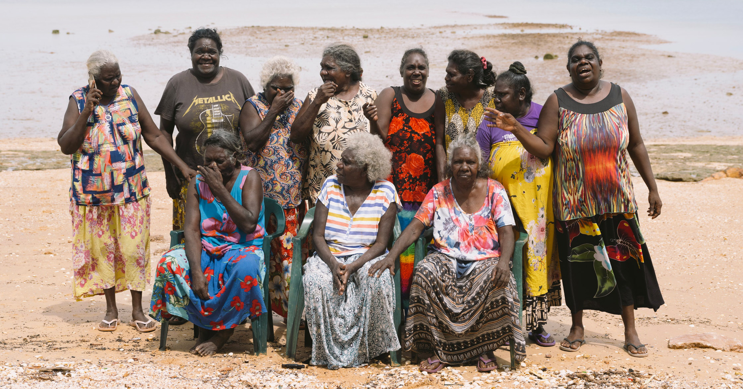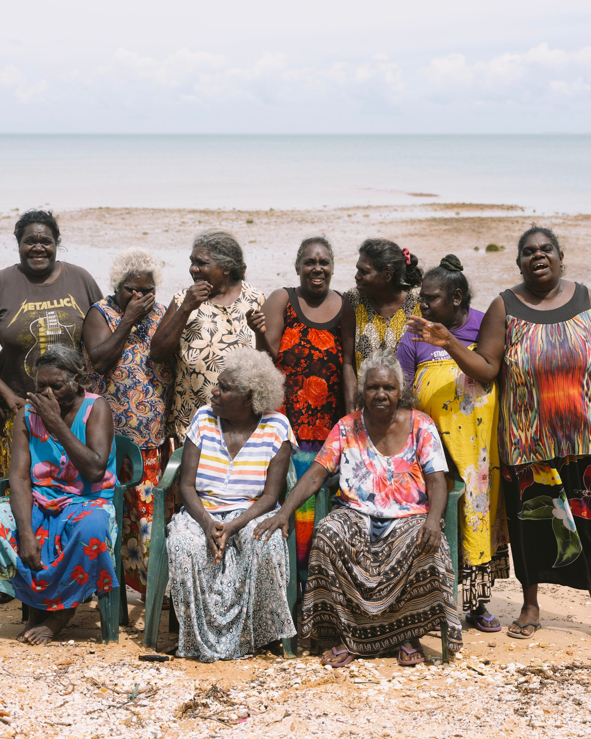 Artists Margaret Gamuti, Mandy Batjula Gaykamaŋu, Margaret Balayu, Helen Milminydjarrk, Abigail Mundjala, Helen Ganalmirriwuy Garrawurra, Valda Malarr, Sabrina Roy, Margaret Rarru Garrawurra, Ruth Ŋalmakara and Susan Balbuŋa, in Yurrwi (Milingimbi), Arnhem Land, Northern Territory.Photographed by Katrin Koenning