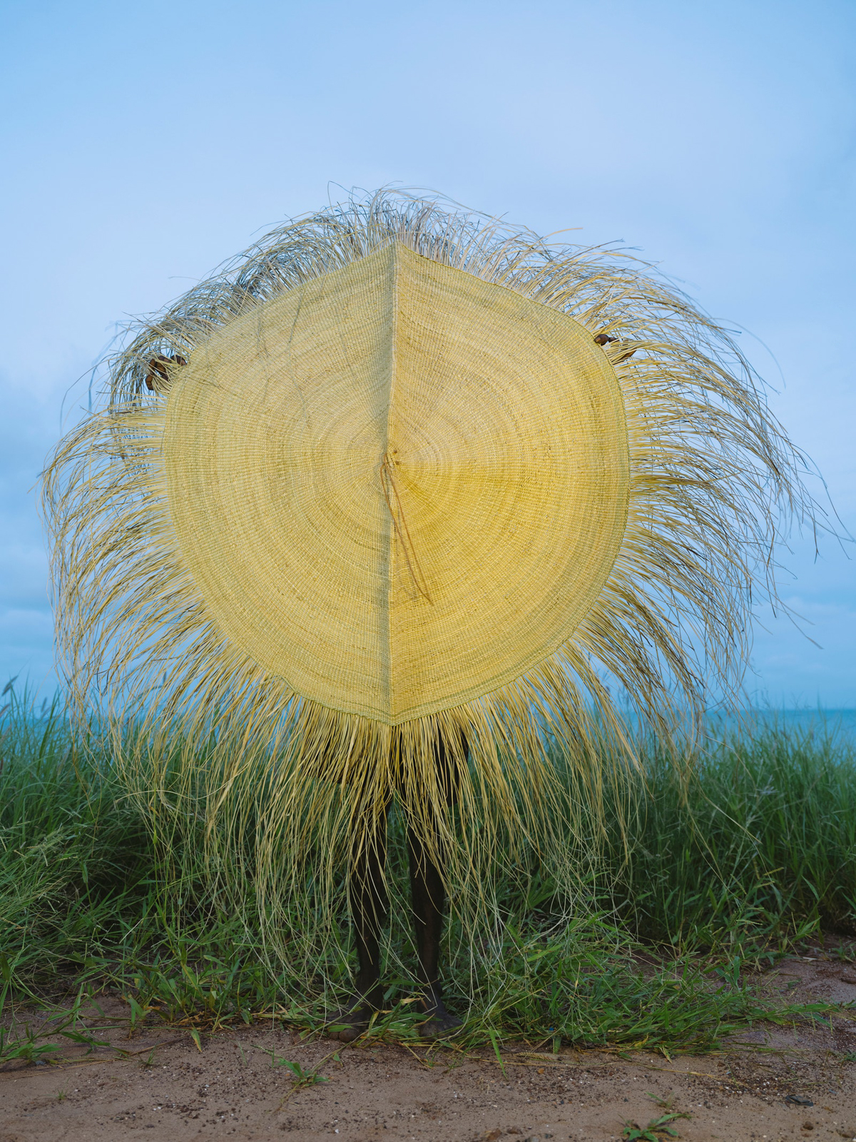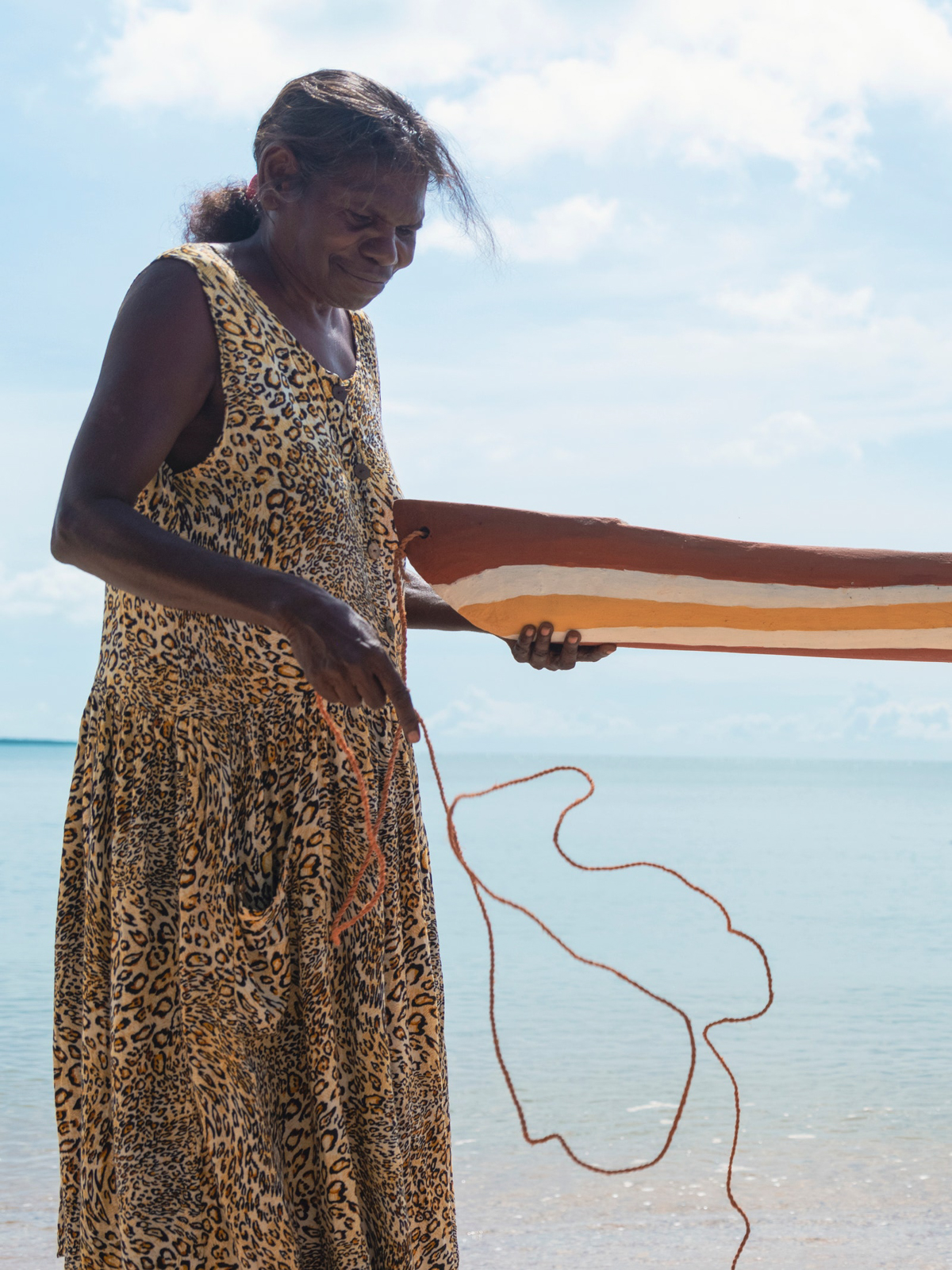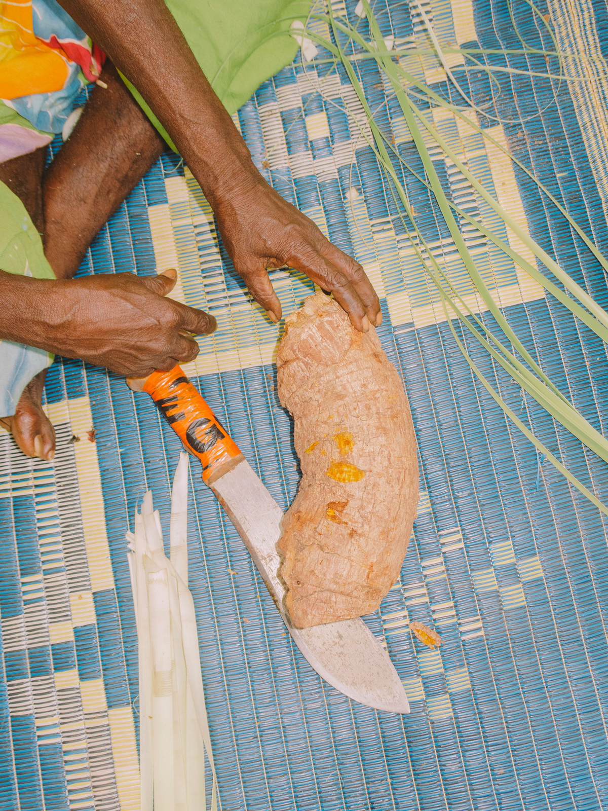The peeling comes next. This is the preparation of the leaves into long strands that will be laid out to dry. Back at the art center I sit outside with Susan, her daughter Valda Malar, and her grandson Phllip Guyabaka (whom she tells me is always lovingly at her side) on a polymat of blue, this time with yellow flowers, the beach straight ahead of us, where we think we see a crocodile, and the ALPA shop (the only shop on the island, where cooking oil will set you back close to double what it would on the mainland) to the right a few meters away. Susan points to the spiky edges of the pandanus leaf: “Really sharp one. The snakes and critters don’t like it. I don’t know, maybe inside, maybe there’s poison. That’s why the Bamugora protects—it’s like armor.”